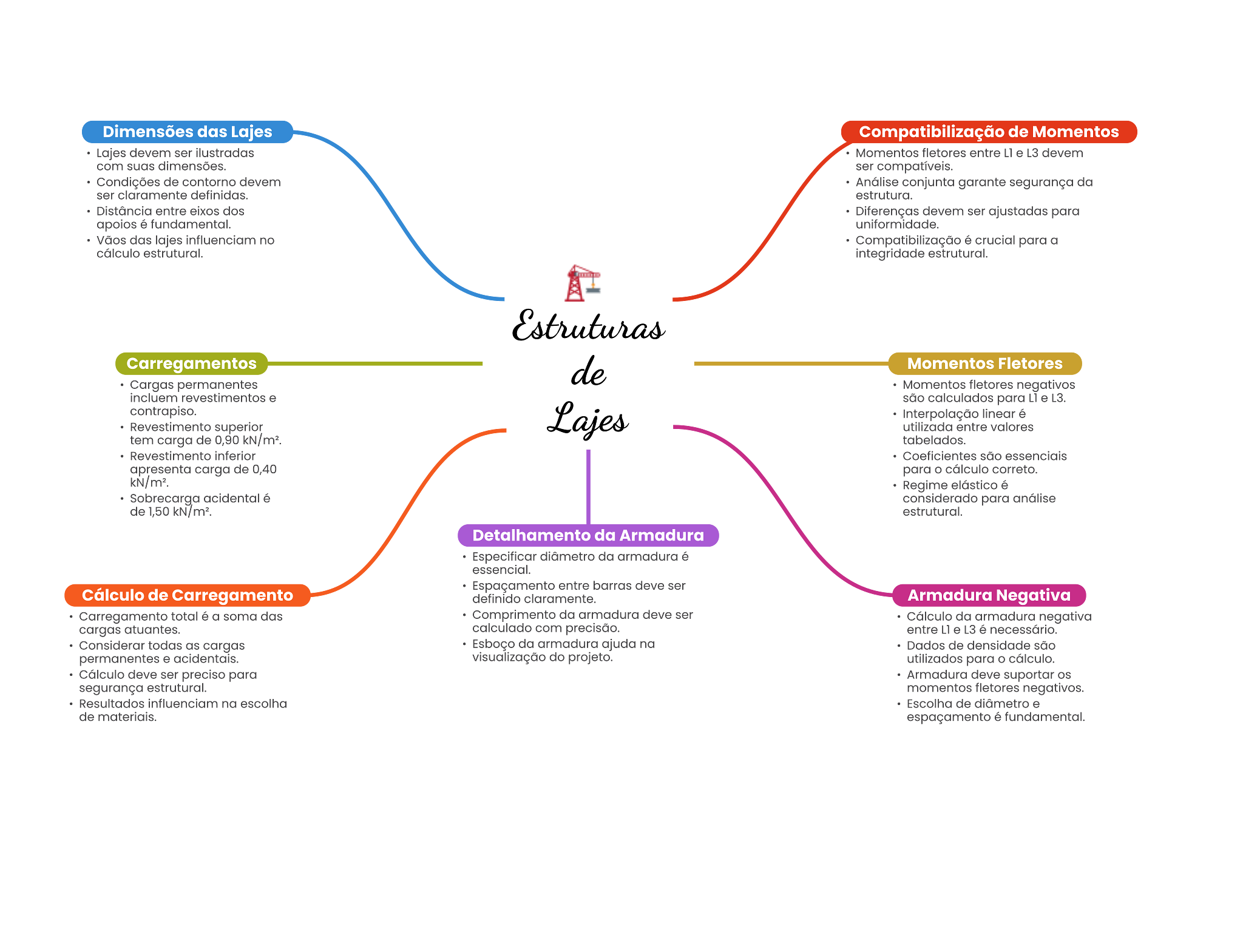 Dimensões das Lajes Compatibilização de Momentos Lajes devem ser Momentos entre L3 devem com suas dimensões. ser Condições de devem conjunta garante segurança da ser estrutura. Distância entre dos Diferenças ser ajustadas para fundamental. uniformidade. das no crucial para a estrutural. estrutural. Carregamentos Momentos Fletores Cargas Momentos negativos revestimentos são para L3. contrapiso. linear é Revestimento superior utilizada entre valores tern carga de 0,90 tabelados. Revestimento inferior são apresenta carga de 0,40 para cálculo correto. Regime Sobrecarga acidental considerado para análise de 1,50 estrutural. Detalhamento da Armadura Especificar da armadura é essencial. Espaçamento entre ser Cálculo de Carregamento definido Armadura Negativa Carregamento total a soma Comprimento da armadura deve da negativa cargas atuantes. calculado com entre L3 necessário. Considerar todas as cargas Esboço da armadura ajuda na Dados de densidade são permanentes visualização do projeto. utilizados para Cálculo deve ser preciso para Armadura deve suportar segurança estrutural. momentos fletores negativos. Resultados influenciam na escolha Escolha de . de materials. espaçamento fundamental.