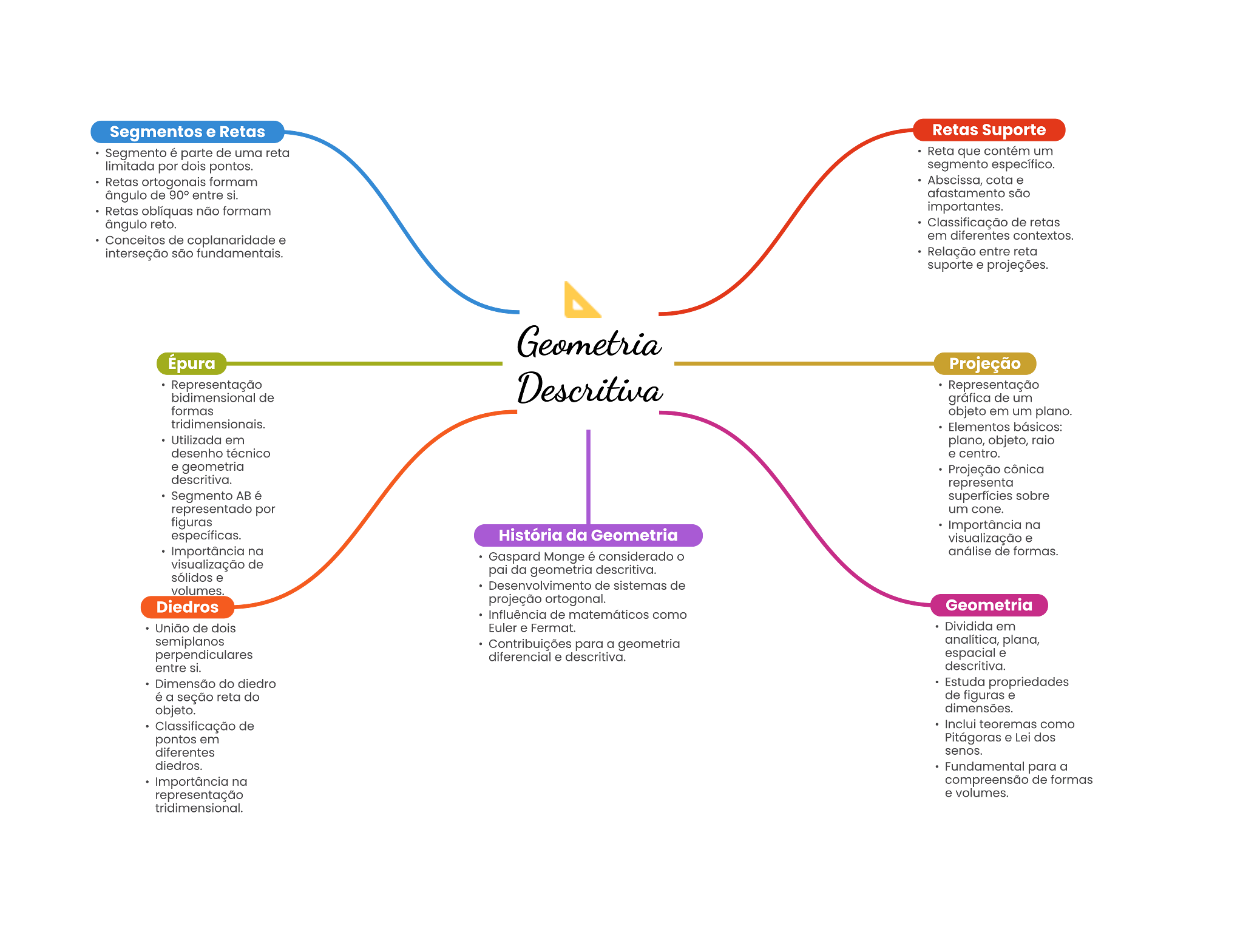 Segmentos e Retas Retas Suporte Segmento é parte de uma reta Reta que contém um limitada por pontos. segmento Retas formam cota ângulo de 90° entre Retas não formam ângulo reto. de de copianaridade em diferentes interseção são fundamentals. Relação entre reta suporte projeções. Épura Projeção Representação Representação bidimensional de de um formas objeto em um plano. Elementos Utilizada em objeto, ralo desenho técnico e centro. Projeção cônica descritiva. representa Segmento AB é superficies sobre representado por um cone. figuras na História da Geometria na Gaspard Monge considerado análise de formas. visualização de sólidos da geometria descritiva. Desenvolvimento de de Diedros projeção ortogonal. Geometria de como de Euler Fermat. Dividida em Contribuições para a analitica, plana, perpendiculares diferencial descritiva. espacial . entre Dimensão do Estuda propriedades a seção reta do de objeto. dimensões. de Inclui como pontos em . Lei diferentes Fundamental para a na de forma volumes. tridimensional.
