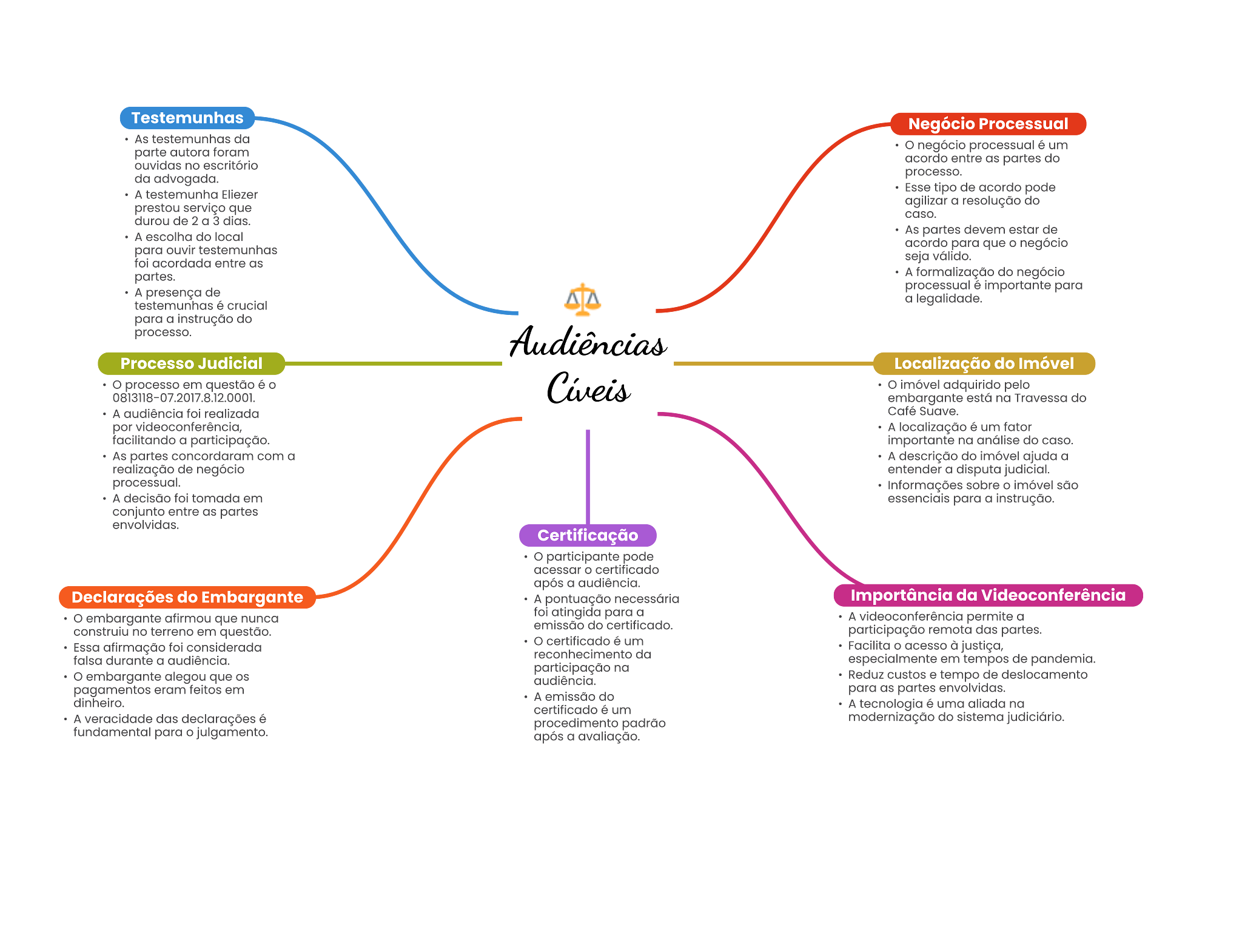 Testemunhas Negócio Processual An da parte autora foram o negócio processual é um ouvidas no escritório acordo entre as partes do da advogada. processo. A testemunha Ellezer tipo de acordo pode prestou serviço que a resolução do durou de 2 a 3 A do local As partes devem de para ouvir acordo para que negócio foi acordada entre as válido. partes. A do negócio A presença de processual importante para é crucial a legalidade. para a do processo. Processo Judicial Localização do Imóvel processo em questão é imóvel adquirido pelo embargante está na Travesed do A audiência foi realizada Café Suave. por A localização um fator facilitando a participação. na do caso. As partes concordaram com a A descrição do Imóvel ajuda realização de negócio entender a disputa judicial. processual. sobre são A foi tomada em para a instrução. conjunto entre partea envolvidas. Certificação participante pode certificado após a audiência. Declarações do Embargante A pontuação Importância da Videoconferência embargante afirmou que nunca atingida para a A videoconferência permite a construlu no terreno em questão. emissão do certificado. participação remota das partes. Essa afirmação considerada certificado um Facilita acesso à justiça, durante a audiência. reconhecimento da especialmente em tempos de pandemia. participação na o embargante alegou que Reduz custos tempo de deslocamento pagamentos eram feitos em para as partes envolvidas. dinheiro. A emissão do certificado um A tecnologia uma allada na A veracidade declarações procedimento padrão modemização do sisterna judiciário. fundamental para a
