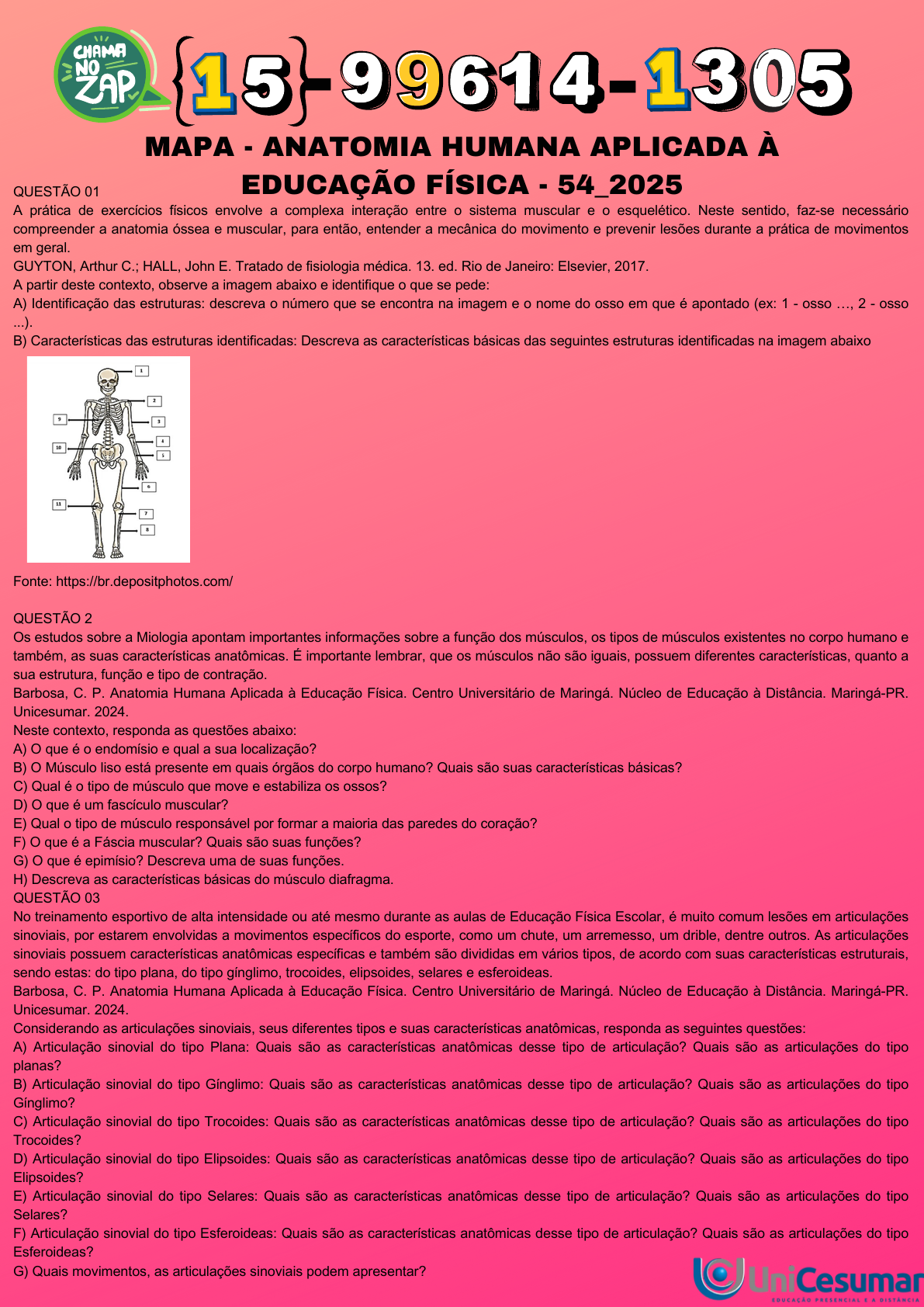 QUESTÃO 01 A prática de exercícios físicos envolve a complexa interação entre o sistema muscular e o esquelético. Neste sentido, faz-se necessário compreender a anatomia óssea e muscular, para então, entender a mecânica do movimento e prevenir lesões durante a prática de movimentos em geral. GUYTON, Arthur C.; HALL, John E. Tratado de fisiologia médica. 13. ed. Rio de Janeiro: Elsevier, 2017. A partir deste contexto, observe a imagem abaixo e identifique o que se pede: A) Identificação das estruturas: descreva o número que se encontra na imagem e o nome do osso em que é apontado (ex: 1 - osso …, 2 - osso ...). B) Características das estruturas identificadas: Descreva as características básicas das seguintes estruturas identificadas na imagem abaixo MAPA - ANATOMIA HUMANA APLICADA À EDUCAÇÃO FÍSICA - 54_2025 - - Fonte: https://br.depositphotos.com/ QUESTÃO 2 Os estudos sobre a Miologia apontam importantes informações sobre a função dos músculos, os tipos de músculos existentes no corpo humano e também, as suas características anatômicas. É importante lembrar, que os músculos não são iguais, possuem diferentes características, quanto a sua estrutura, função e tipo de contração. Barbosa, C. P. Anatomia Humana Aplicada à Educação Física. Centro Universitário de Maringá. Núcleo de Educação à Distância. Maringá-PR. Unicesumar. 2024. Neste contexto, responda as questões abaixo: A) O que é o endomísio e qual a sua localização? B) O Músculo liso está presente em quais órgãos do corpo humano? Quais são suas características básicas? C) Qual é o tipo de músculo que move e estabiliza os ossos? D) O que é um fascículo muscular? E) Qual o tipo de músculo responsável por formar a maioria das paredes do coração? F) O que é a Fáscia muscular? Quais são suas funções? G) O que é epimísio? Descreva uma de suas funções. H) Descreva as características básicas do músculo diafragma. QUESTÃO 03 No treinamento esportivo de alta intensidade ou até mesmo durante as aulas de Educação Física Escolar, é muito comum lesões em articulações sinoviais, por estarem envolvidas a movimentos específicos do esporte, como um chute, um arremesso, um drible, dentre outros. As articulações sinoviais possuem características anatômicas específicas e também são divididas em vários tipos, de acordo com suas características estruturais, sendo estas: do tipo plana, do tipo gínglimo, trocoides, elipsoides, selares e esferoideas. Barbosa, C. P. Anatomia Humana Aplicada à Educação Física. Centro Universitário de Maringá. Núcleo de Educação à Distância. Maringá-PR. Unicesumar. 2024. Considerando as articulações sinoviais, seus diferentes tipos e suas características anatômicas, responda as seguintes questões: A) Articulação sinovial do tipo Plana: Quais são as características anatômicas desse tipo de articulação? Quais são as articulações do tipo planas? B) Articulação sinovial do tipo Gínglimo: Quais são as características anatômicas desse tipo de articulação? Quais são as articulações do tipo Gínglimo? C) Articulação sinovial do tipo Trocoides: Quais são as características anatômicas desse tipo de articulação? Quais são as articulações do tipo Trocoides? D) Articulação sinovial do tipo Elipsoides: Quais são as características anatômicas desse tipo de articulação? Quais são as articulações do tipo Elipsoides? E) Articulação sinovial do tipo Selares: Quais são as características anatômicas desse tipo de articulação? Quais são as articulações do tipo Selares? F) Articulação sinovial do tipo Esferoideas: Quais são as características anatômicas desse tipo de articulação? Quais são as articulações do tipo Esferoideas? G) Quais movimentos, as articulações sinoviais podem apresentar? https://www.instagram.com/excellenceeducacional/p/DG1XaOaREOS/ https://www.instagram.com/excellenceeducacional/p/DG1XaOaREOS/