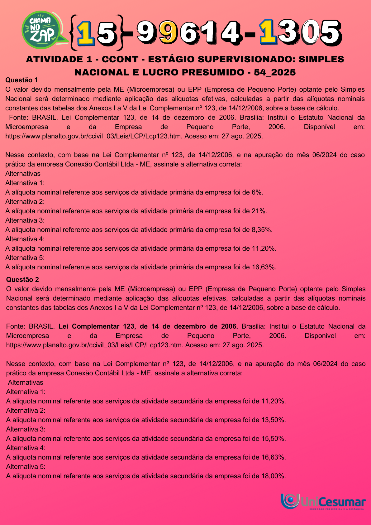 Questão 1 O valor devido mensalmente pela ME (Microempresa) ou EPP (Empresa de Pequeno Porte) optante pelo Simples Nacional será determinado mediante aplicação das alíquotas efetivas, calculadas a partir das alíquotas nominais constantes das tabelas dos Anexos I a V da Lei Complementar nº 123, de 14/12/2006, sobre a base de cálculo. Fonte: BRASIL. Lei Complementar 123, de 14 de dezembro de 2006. Brasília: Institui o Estatuto Nacional da Microempresa e da Empresa de Pequeno Porte, 2006. Disponível em: https://www.planalto.gov.br/ccivil_03/Leis/LCP/Lcp123.htm. Acesso em: 27 ago. 2025. Nesse contexto, com base na Lei Complementar nº 123, de 14/12/2006, e na apuração do mês 06/2024 do caso prático da empresa Conexão Contábil Ltda - ME, assinale a alternativa correta: Alternativas Alternativa 1: A alíquota nominal referente aos serviços da atividade primária da empresa foi de 6%. Alternativa 2: A alíquota nominal referente aos serviços da atividade primária da empresa foi de 21%. Alternativa 3: A alíquota nominal referente aos serviços da atividade primária da empresa foi de 8,35%. Alternativa 4: A alíquota nominal referente aos serviços da atividade primária da empresa foi de 11,20%. Alternativa 5: A alíquota nominal referente aos serviços da atividade primária da empresa foi de 16,63%. ATIVIDADE 1 - CCONT - ESTÁGIO SUPERVISIONADO: SIMPLES NACIONAL E LUCRO PRESUMIDO - 54_2025 Questão 2 O valor devido mensalmente pela ME (Microempresa) ou EPP (Empresa de Pequeno Porte) optante pelo Simples Nacional será determinado mediante aplicação das alíquotas efetivas, calculadas a partir das alíquotas nominais constantes das tabelas dos Anexos I a V da Lei Complementar nº 123, de 14/12/2006, sobre a base de cálculo. Fonte: BRASIL. Lei Complementar 123, de 14 de dezembro de 2006. Brasília: Institui o Estatuto Nacional da Microempresa e da Empresa de Pequeno Porte, 2006. Disponível em: https://www.planalto.gov.br/ccivil_03/Leis/LCP/Lcp123.htm. Acesso em: 27 ago. 2025. Nesse contexto, com base na Lei Complementar nº 123, de 14/12/2006, e na apuração do mês 06/2024 do caso prático da empresa Conexão Contábil Ltda - ME, assinale a alternativa correta: Alternativas Alternativa 1: A alíquota nominal referente aos serviços da atividade secundária da empresa foi de 11,20%. Alternativa 2: A alíquota nominal referente aos serviços da atividade secundária da empresa foi de 13,50%. Alternativa 3: A alíquota nominal referente aos serviços da atividade secundária da empresa foi de 15,50%. Alternativa 4: A alíquota nominal referente aos serviços da atividade secundária da empresa foi de 16,63%. Alternativa 5: A alíquota nominal referente aos serviços da atividade secundária da empresa foi de 18,00%. - - https://www.instagram.com/excellenceeducacional/p/DG1XaOaREOS/ https://www.instagram.com/excellenceeducacional/p/DG1XaOaREOS/