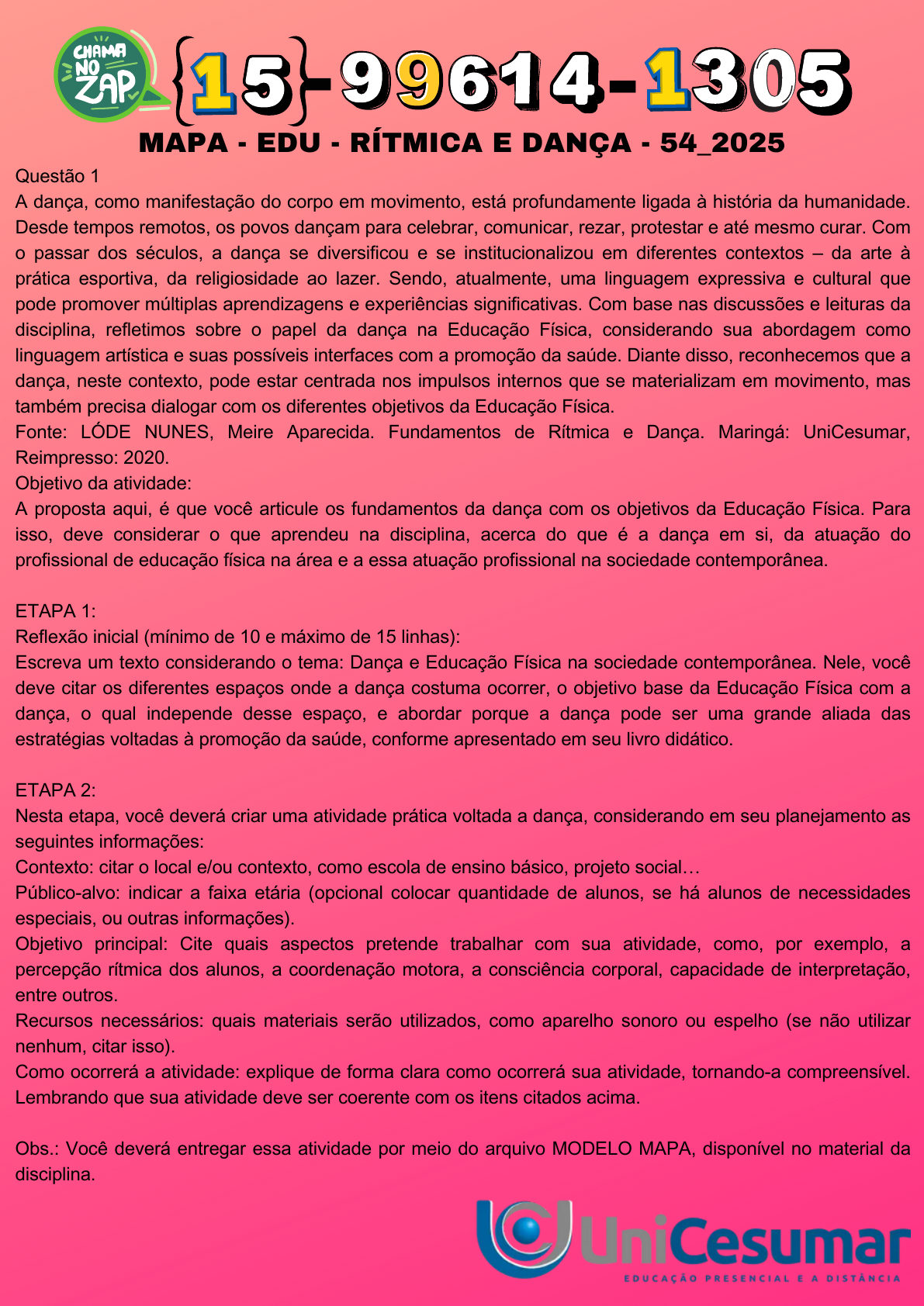 Questão 1 A dança, como manifestação do corpo em movimento, está profundamente ligada à história da humanidade. Desde tempos remotos, os povos dançam para celebrar, comunicar, rezar, protestar e até mesmo curar. Com o passar dos séculos, a dança se diversificou e se institucionalizou em diferentes contextos – da arte à prática esportiva, da religiosidade ao lazer. Sendo, atualmente, uma linguagem expressiva e cultural que pode promover múltiplas aprendizagens e experiências significativas. Com base nas discussões e leituras da disciplina, refletimos sobre o papel da dança na Educação Física, considerando sua abordagem como linguagem artística e suas possíveis interfaces com a promoção da saúde. Diante disso, reconhecemos que a dança, neste contexto, pode estar centrada nos impulsos internos que se materializam em movimento, mas também precisa dialogar com os diferentes objetivos da Educação Física. Fonte: LÓDE NUNES, Meire Aparecida. Fundamentos de Rítmica e Dança. Maringá: UniCesumar, Reimpresso: 2020. Objetivo da atividade: A proposta aqui, é que você articule os fundamentos da dança com os objetivos da Educação Física. Para isso, deve considerar o que aprendeu na disciplina, acerca do que é a dança em si, da atuação do profissional de educação física na área e a essa atuação profissional na sociedade contemporânea. ETAPA 1: Reflexão inicial (mínimo de 10 e máximo de 15 linhas): Escreva um texto considerando o tema: Dança e Educação Física na sociedade contemporânea. Nele, você deve citar os diferentes espaços onde a dança costuma ocorrer, o objetivo base da Educação Física com a dança, o qual independe desse espaço, e abordar porque a dança pode ser uma grande aliada das estratégias voltadas à promoção da saúde, conforme apresentado em seu livro didático. ETAPA 2: Nesta etapa, você deverá criar uma atividade prática voltada a dança, considerando em seu planejamento as seguintes informações: Contexto: citar o local e/ou contexto, como escola de ensino básico, projeto social… Público-alvo: indicar a faixa etária (opcional colocar quantidade de alunos, se há alunos de necessidades especiais, ou outras informações). Objetivo principal: Cite quais aspectos pretende trabalhar com sua atividade, como, por exemplo, a percepção rítmica dos alunos, a coordenação motora, a consciência corporal, capacidade de interpretação, entre outros. Recursos necessários: quais materiais serão utilizados, como aparelho sonoro ou espelho (se não utilizar nenhum, citar isso). Como ocorrerá a atividade: explique de forma clara como ocorrerá sua atividade, tornando-a compreensível. Lembrando que sua atividade deve ser coerente com os itens citados acima. Obs.: Você deverá entregar essa atividade por meio do arquivo MODELO MAPA, disponível no material da disciplina. MAPA - EDU - RÍTMICA E DANÇA - 54_2025 - - https://www.instagram.com/excellenceeducacional/p/DG1XaOaREOS/
