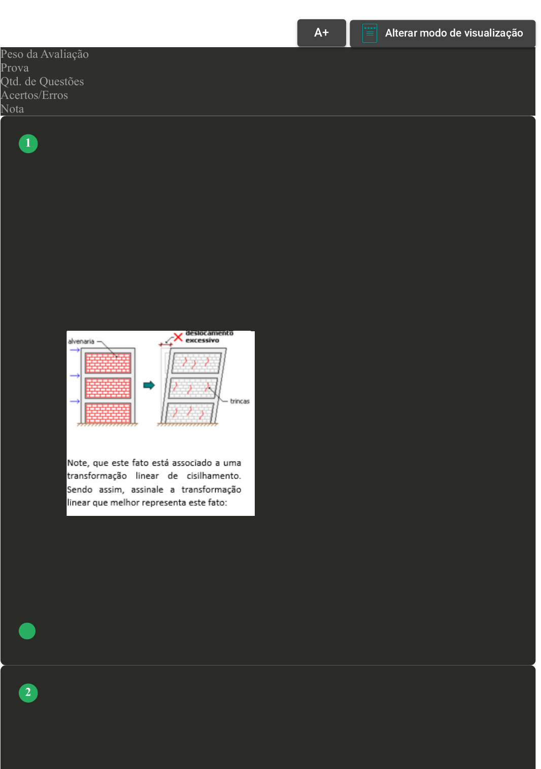 Prova Impressa GABARITO | Avaliação II - Individual (Cod.:460873) Peso da Avaliação 1,50 Prova 12830831 Qtd. de Questões 10 Acertos/Erros 8/2 Nota 8,00 Na construção civil é muito importante tomar cuidados com os chamados "estados limites". No projeto, usualmente devem ser considerados os estados limites últimos caracterizados por: a) perda de equilíbrio, global ou parcial, admitida a estrutura como um corpo rígido; b) ruptura ou deformação plástica excessiva dos materiais; c) transformação da estrutura, no todo ou emparte, em sistema hipostático; d) instabilidade por deformação; e) instabilidade dinâmica. A figura a seguir mostra a representação de um deslocamento horizontal excessivo em uma parede de alvenaria: A T(x,y) = (x,ky), com k>1. B T(x,y) = (-x,y). C T(x,y) = k(x,y), com k > 1. D T(x,y) = (kx,y), com k>1. No estudo das transformações lineares, o conceito de imagem da transformação linear é o conjunto de todos os vetores do contradomínio que são imagens de pelo menos um vetor o espaço vetorial de saída. A respeito da base para a imagem da transformação T(x,y) = (x+y, x), analise as opções a seguir: VOLTAR A+ Alterar modo de visualização 1 2 I- [(1,1),(1,0)]. II- [(1,1),(0,1)]. III- [(0,1),(1,0)]. IV- [(1,1)]. Assinale a alternativa que apresenta a sequência CORRETA: A Somente a opção II está correta. B Somente a opção I está correta. C Somente a opção III está correta. D Somente a opção IV está correta. Quando trabalhamos em geometria, analisar o comportamento de duas retas ou ainda como estas retas estão situadas no espaço é uma simples tarefa, pois basta fazer uma simples visualização. No entanto, quando falamos de retas na geometria analítica ou de vetores representados por coordenadas, determinar a posição dessas retas não é uma tarefa tão simples. Sobre o ângulo formado pelos pares de vetores apresentados, com relação aos ângulos agudos, analise as opções a seguir: I- u = (2, -3, -2) e v = (1, 2, -2). II- u = (4, -2, 3) e v = (0, 2, 1). III- u = (-2, -1, 2) e v = (2, 1, 3). IV- u = (0, 2, -1) e v = (-3, -2, -4). V- u = (-2, 2, 0) e v = (-1, 1, -3). Assinale a alternativa CORRETA: A Somente a opção II está correta. B As opções I e IV estão corretas. C As opções I, III e IV estão corretas. D As opções III e V estão corretas. 3 Com relação às transformações lineares, é importante determinar corretamente conceitos de núcleo, imagem, juntamente a suas respectivas dimensões para um entendimento teórico do problema encontrado. Baseado nisto, considere T, um operador linear de R³ em R³: T(x,y,z) = (z, x - y, -z) Assinale a alternativa CORRETA que melhor apresenta a dimensão do Núcleo deste operador: A 0. B 2. C 1. D 3. Imagine que você queira empurrar um objeto. A força que você aplica sobre ele precisa estar na direção e sentido em que você pretende movimentá-lo ou não chegará ao resultado desejado: se desejar que o objeto vá para frente, logicamente não adiantará empurrá-lo para baixo. Isso porque a força é um exemplo de grandeza vetorial. Para descrevê-la, é preciso que se diga também o sentido e a direção em que ela é aplicada. Com relação ao vetor resultado (R) da operação -2u + 3v, sendo u = (-1,2,0) e v = (-1,-2,3), analise as opções a seguir: I- R = (1,10,9). II- R = (-1,-10,9). III- R = (-5,2,9). IV- R = (5,-2,9). Assinale a alternativa CORRETA: A Somente a opção III está correta. B Somente a opção IV está correta. C Somente a opção II está correta. Revisar Conteúdo do Livro 4 5 D Somente a opção I está correta. No estudo da Álgebra Linear e Vetorial surge o conceito de autovalores e autovetores. Teoricamente, um autovetor de uma transformação é um vetor que quando aplicado na transformação, resulta um múltiplo de si próprio, sendo que a este fator multiplicativo, damos o nome de autovalor. Estes conceitos possuem diversas aplicações práticas, principalmente na Engenharia. Baseado nisso, dada a transformação T(x,y) = (2x, y) analise as sentenças a seguir: I- v = (1,0) é um autovalor de T, com autovalor igual a 2. II- v = (0,1) é um autovalor de T, com autovalor igual a 2. III- T possui um autovalor de multiplicidade algébrica 1. IV- T possui dois autovalores de multiplicidade algébrica 1. Assinale a alternativa CORRETA: A As opções I e III estão corretas. B As opções I e IV estão corretas. C As opções II e IV estão corretas. D As opções II e III estão corretas. Em Matemática, uma transformação linear é um tipo particular de função entre dois espaços vetoriais que preserva as operações de adição vetorial e multiplicação por escalar. Uma transformação linear também pode ser chamada de aplicação linear ou mapa linear. A respeito das transformações lineares, analise as opções a seguir: I- T(x,y) = (x² , y²). II- T (x,y) = (2x, - x + y). III- T (x,y) = (- x + y, x - 1). IV- T (x,y) = (x, x - y). Assinale a alternativa CORRETA: A Somente a opção IV está correta. 6 7 B As opções II e IV estão corretas. C As opções III e IV estão corretas. D As opções I e III estão corretas. A noção comum de vetores como objetos com tamanho, direção e sentido, com as operações de adição e multiplicação por números reais forma a ideia básica de um espaço vetorial. Deste ponto de partida então, para definirmos um espaço vetorial, precisamos de um conjunto, uma operação de adição de elementos deste conjunto, e uma operação de multiplicação de escalares (por exemplo, números reais) por elementos deste conjunto. A respeito das propriedades dos espaços vetoriais, classifique V para as sentenças verdadeiras e F para as falsas: ( ) Os espaços vetoriais preservam as operações de soma e multiplicação por escalar. ( ) Os espaços vetoriais de podem ser imaginados como domínio de contradomínio de operações lineares. ( ) A base de um espaço é um conjunto LI que gera todos os ele