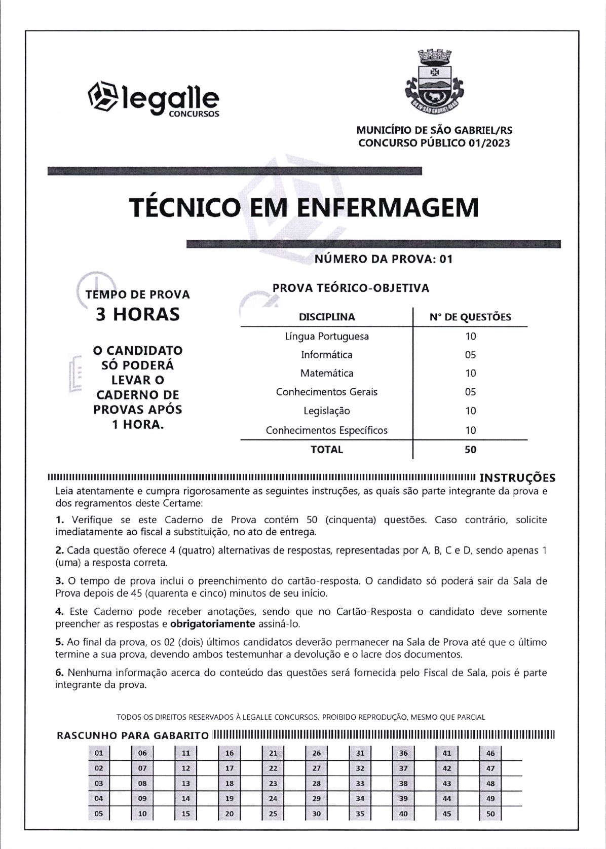 elessl1e tvtutttcÍpto or sÃo GABRIEVRS coNcuRso púguco ot tzoz3 , TECNICO EM ENFERMAGEM xúnarno DA PRovA: oí TEMPO DE PROVA 3 HORAS PROVA TEO RICO-O BJ ETIVA DISCIPUNA N'DE qursrÕes O CANDIDATO só pooenÁ LEVAR O CADERNO DE PRovAs após 1 HORA. Língua Portuguesa Informática Matemática Conhecimentos Gerais Legislação Conhecimentos Específicos 10 05 10 05 10 10 TOTAL 50 Leia atentamente e cumpra rigorosamente as seguintes instruções, as quais são parte integrante da prova e dos regramentos deste Certame: 1, Verifique se este Caderno de Prova contém 50 (cinquenta) questôes. Caso contrário, solicite imediatamente ao fiscal a substituição, no ato de entrega. 2. Cada questão oferece 4 (quatro) alternativas de respostas, representadas por A, B, C e D, sendo apenas 1 (uma) a resposta correta. 3. O tempo de prova inclui o preenchimento do cartão-resposta. O candidato só poderá sair da Sala de Prova depois de 45 (quarenta e cinco) minutos de seu início. 4. Este Caderno pode receber anotações, sendo que no Cartão-Resposta o candidato deve somente preencher as respostas e obrigatoriamente assiná-lo. 5. Ao final da prova, os 02 (dois) últimos candidatos deverão permanecer na Sala de Prova até que o último termine a sua prova, devendo ambos testemunhar a devolução e o lacre dos documentos. 6. Nenhuma informação acerca do conteúdo das questões será fornecida pelo Fiscal de Sala, pois é parte integrante da prova. ToDos os DrRÉrÍos RESERVADoS A LEGALLE coNcuRSos. pRorBrDo REpRoDUÇÃo, MESMo euE pARctAL RAscuNHo pARA GABARTTo llllllllllllllllllllllllllllllllllllllllllllllllllllllllllllllll!llllllllllllllllllllllllllllllllllllllllllllll o1 16 26 4t 02 o3 o4 07 t2 t7 27 32 37 42 47 o8 13 18 23 2A 33 38 43 r|8 o9 14 19 29 34 39 44 49 05 11 20 30 35 45 46o6 2L 31 36 22 24 10 15 25 40 50 L|NGUA PoRTUGUESA Para responder às questões 01 a 10, leia o texto abaixo. Burrocracia 1 Recebi convite para participar de um evento 2 literário em João Pessoa. Já quase não viajo a trabalho, 3 preciso ficar mais tempo no meu escritório, mas 4 respondi que, dependendo da data, talvez conseguisse 5 ir. Foi então que me chegou uma lista de documentos 6 que eu deveria providenciar para viabilizar minha 7 participação. Não acreditei. Eu teria que passar uma I semana percorrendo cartórios e ainda contratar um 9 advogado, ou dois. Muito grata, mas fica para a proxima. 10 Nunca vi um país se entravar tanto. Nada avanÇa 11 em ritmo razoável. Afora maledicências, pilantragens e 12 disputas de poder, ainda temos a questáo da papelada: 13 e um milhão de pareceres, assinaturas, carimbos e 14 rubricas que impedem o andar da carruagem. Pois é, 15 ainda estamos nos tempos da carruagem, trotando. 16 Basta uma enxurrada desabar sobre uma cidade e 17 se tem mais do mesmo: ruas alagadas nos pontos de 18 sempre. Ok, o asfalto náo absorve a água, o lixo é 19 jogado em locais impróprios e chove sempre o esperado 20 para o mês inteiro. Mas não _ pessoas dentro das 21 secretarias de governo sendo pagas para resolverem os 22 problemas urbanos? Vai chover de novo, e forte. E os 23 carros ficaráo boiando, poucos conseguirão chegar ao 24 trabalho, o comércio terá que fechar, moradores 25 perderão seus móveis, grávidas terão que ser retiradas 26 de barco de dentro de suas casas. E um déjà-vu 27 recorrente. 28 Como não imagino que haja almas satânicas por 29 _ das administrações, só posso concluir que a 30 burocracia tem algo a ver com isso. Quantos estudos, 31 laudos, aprovaçÕes, orçamentos, prazos remarcados, 32 projetos refeitos serão necessários para resolver 33 nossas pendências? E o país da novela - mesmo. 34 Fizemos progresso na emissão de documentos 35 pessoais - hoje se pode tirar uma certidáo de 36 nascimento ou uma carteira de identidade sem trâmites 37 e demoras, mas ainda falta, como falta, para a gente ser 38 uma naçáo que flui. A expressáo "é pra ontem", que 39 configura a pressa, passou a ser literal. Não 40 conseguimos sair do ontem e entrar no amanhã. 41 Os reféns da burocracia se defendem dizendo que 42 nâo é culpa deles, exige-se o cumprimento da lei, e 43 estão certos, vira bagunça. Mas alguém lá em 44 cima, com a caneta na mão, tem o dever de promover 45 mais agilidade nesse Brasil que so e rápido na 46 informalidade. Há que se encontrar um meio de 47 trabalhar de forma legal e ao mesmo tempo atender as 48 demandas em prazo de paÍs desenvolvido, que é o que 49 almejamos ser. 50 O que é preciso paê promover a 51 desburocralizaçáo? Claro, uns 3.479 estudos de 52 viabilidade. Pocoto, pocoto. Autora. Martha Medeiros (adaptado). Questão 01. O texto fazuma crítica bastante relevante e comum à burocracia e à ineficiência dos processos administrativos no Brasil. A este respeito, analise as assertivas. L O texto reconhece que a burocracia existe por motivos legais e para manter a ordem. No entanto, ele destaca que é possÍvel encontrar um equilÍbrio entre atender às exigências legais e ser ágil. ll. O texto Íaz uma conexão entre a burocracia e os problemas urbanos, como alagamentos recorrentes, sugerindo que a lentidão nos processos pode piorar situações já complicadas. Pode-se afirmar que: (A) Apenas a assertiva I está correta. (B) Apenas a assertiva ll está correta. (C) As assertivas I e ll estão corretas. (D) As assertivas I e ll estão incorretas. Questão 02. Na frase é um milhão de pareceres, assinaturas, carimbos e rubricas (1.13-14), a autora utiliza a para enfatizar a quantidade exagerada de documentos e procedimentos burocráticos envolvidos. Qualfigura de linguagem preenche, CORRETAMENTE, a lacuna acima? (A) hiperbole. (B) prosopopeia. (C) metáfora. (D) ironia. Questão 03. Preenche, CORRETA e respectivamente, as lacunas das linhas 20,29 e 43 a alternativa: há-trás-senão. a - trás - se náo- há-traz-senão. à - traz - se náo. Questão 04. Por meio da interpretação do texto, pode-se afirm