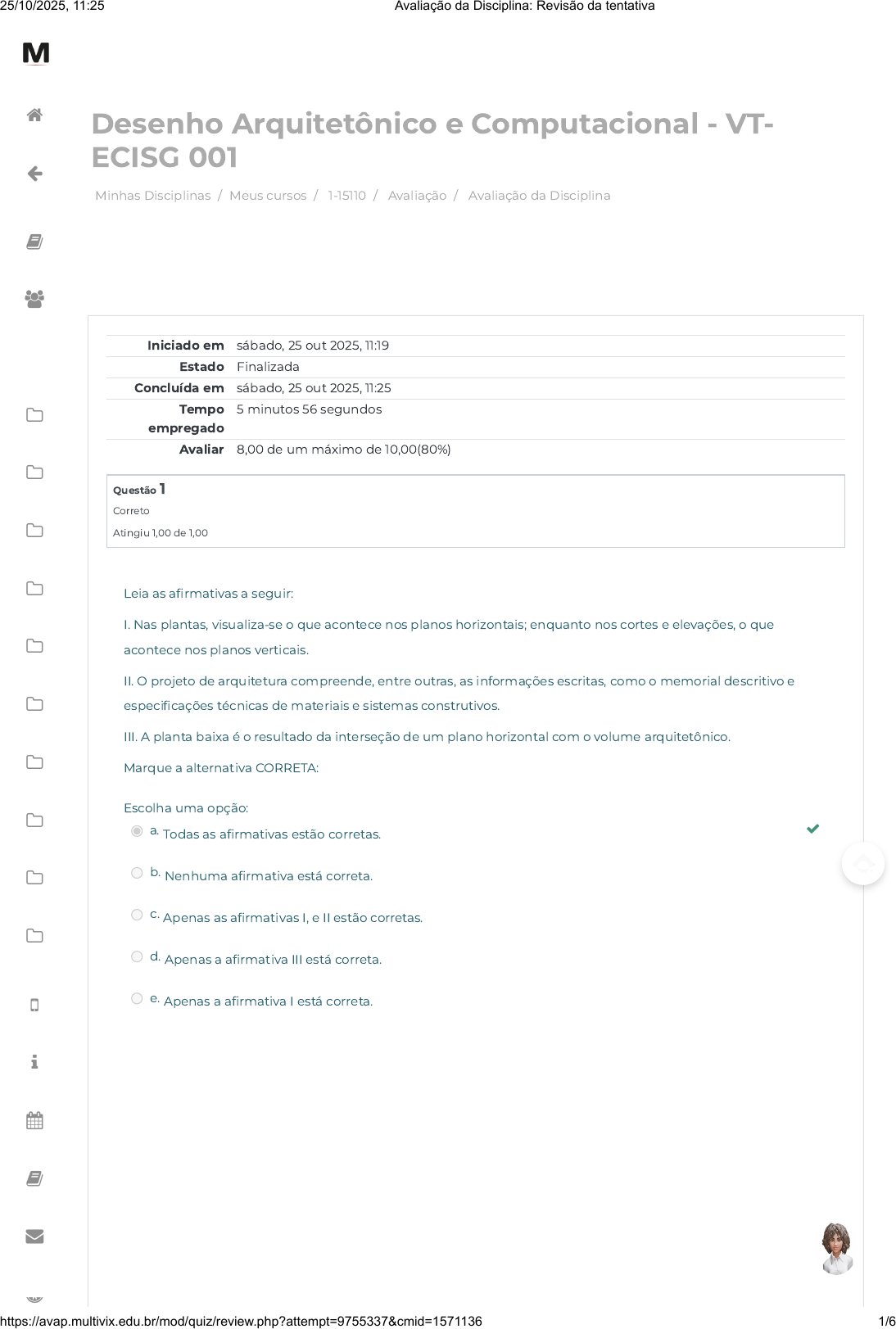 Minhas Disciplinas / Meus cursos / 1-15110 / Avaliação / Avaliação da Disciplina Desenho Arquitetônico e Computacional - VT- ECISG 001 Iniciado em sábado, 25 out 2025, 11:19 Estado Finalizada Concluída em sábado, 25 out 2025, 11:25 Tempo empregado 5 minutos 56 segundos Avaliar 8,00 de um máximo de 10,00(80%) Questão 1 Correto Atingiu 1,00 de 1,00 Leia as afirmativas a seguir: I. Nas plantas, visualiza-se o que acontece nos planos horizontais; enquanto nos cortes e elevações, o que acontece nos planos verticais. II. O projeto de arquitetura compreende, entre outras, as informações escritas, como o memorial descritivo e especificações técnicas de materiais e sistemas construtivos. III. A planta baixa é o resultado da interseção de um plano horizontal com o volume arquitetônico. Marque a alternativa CORRETA: Escolha uma opção: a. Todas as afirmativas estão corretas. b. Nenhuma afirmativa está correta. c. Apenas as afirmativas I, e II estão corretas. d. Apenas a afirmativa III está correta. e. Apenas a afirmativa I está correta. 25/10/2025, 11:25 Avaliação da Disciplina: Revisão da tentativa https://avap.multivix.edu.br/mod/quiz/review.php?attempt=9755337&cmid=1571136 1/6 https://avap.multivix.edu.br/my/ https://avap.multivix.edu.br/course/view.php?id=24503 https://avap.multivix.edu.br/course/view.php?id=24503§ion=11 https://avap.multivix.edu.br/mod/quiz/view.php?id=1571136 https://avap.multivix.edu.br/my/ https://avap.multivix.edu.br/course/view.php?id=24503 https://avap.multivix.edu.br/user/index.php?id=24503 https://avap.multivix.edu.br/course/view.php?id=24503§ion=1 https://avap.multivix.edu.br/course/view.php?id=24503§ion=2 https://avap.multivix.edu.br/course/view.php?id=24503§ion=3 https://avap.multivix.edu.br/course/view.php?id=24503§ion=4 https://avap.multivix.edu.br/course/view.php?id=24503§ion=5 https://avap.multivix.edu.br/course/view.php?id=24503§ion=6 https://avap.multivix.edu.br/course/view.php?id=24503§ion=8 https://avap.multivix.edu.br/course/view.php?id=24503§ion=9 https://avap.multivix.edu.br/course/view.php?id=24503§ion=10 https://avap.multivix.edu.br/course/view.php?id=24503§ion=11 https://avap.multivix.edu.br/hooks/portal/ https://avap.multivix.edu.br/mod/page/view.php?id=1252%2F%22%20target%3D%22_blank https://avap.multivix.edu.br/calendar/view.php/ https://avap.multivix.edu.br/local/staticpage/view.php?page=biblioteca https://multivix.edu.br/office-365/ https://multivix.edu.br/acessibilidade/ https://avap.multivix.edu.br/ https://avap.multivix.edu.br/ https://avap.multivix.edu.br/ https://avap.multivix.edu.br/ https://avap.multivix.edu.br/ https://avap.multivix.edu.br/ https://avap.multivix.edu.br/ Questão 2 Correto Atingiu 1,00 de 1,00 A ferramenta Grips do software AutoCAD possibilita a edição mais rápida das entidades de acesso aos comandos de edição mais usados. Dadas as afirmativas sobre essa ferramenta, I. Os Grips permitem converter linhas em polylines, ao unir duas entidades geométricas. II. Por meio dos Grips podem ser ativados os comandos Stretch, Move, Rotate, Scale e Mirror, ao teclar a barra de espaço. III. Ao clicar em um dos Grips, a ferramenta trabalhará no modo Strech, esticando a linha a partir daquele ponto. IV. É possível selecionar mais de um Grips de um objeto pressionando a tecla Shift. verifica-se que está(ão) correta(s): Escolha uma opção: a. II, III e IV, apenas. b. I, II, III e IV. c. II, apenas. d. I e III, apenas. e. I e IV, apenas. 25/10/2025, 11:25 Avaliação da Disciplina: Revisão da tentativa https://avap.multivix.edu.br/mod/quiz/review.php?attempt=9755337&cmid=1571136 2/6 https://avap.multivix.edu.br/my/ https://avap.multivix.edu.br/course/view.php?id=24503 https://avap.multivix.edu.br/user/index.php?id=24503 https://avap.multivix.edu.br/course/view.php?id=24503§ion=1 https://avap.multivix.edu.br/course/view.php?id=24503§ion=2 https://avap.multivix.edu.br/course/view.php?id=24503§ion=3 https://avap.multivix.edu.br/course/view.php?id=24503§ion=4 https://avap.multivix.edu.br/course/view.php?id=24503§ion=5 https://avap.multivix.edu.br/course/view.php?id=24503§ion=6 https://avap.multivix.edu.br/course/view.php?id=24503§ion=8 https://avap.multivix.edu.br/course/view.php?id=24503§ion=9 https://avap.multivix.edu.br/course/view.php?id=24503§ion=10 https://avap.multivix.edu.br/course/view.php?id=24503§ion=11 https://avap.multivix.edu.br/hooks/portal/ https://avap.multivix.edu.br/mod/page/view.php?id=1252%2F%22%20target%3D%22_blank https://avap.multivix.edu.br/calendar/view.php/ https://avap.multivix.edu.br/local/staticpage/view.php?page=biblioteca https://multivix.edu.br/office-365/ https://multivix.edu.br/acessibilidade/ https://avap.multivix.edu.br/ https://avap.multivix.edu.br/ https://avap.multivix.edu.br/ https://avap.multivix.edu.br/ https://avap.multivix.edu.br/ https://avap.multivix.edu.br/ https://avap.multivix.edu.br/ Questão 3 Incorreto Atingiu 0,00 de 1,00 Questão 4 Correto Atingiu 1,00 de 1,00 Um projeto de paisagismo será desenhado no software AutoCAD™. No projeto, uma árvore será plantada a igual distância, 2,00 m, de dois alinhamentos de passeios. Os alinhamentos são retas concorrentes, não ortogonais, próximas a um cruzamento entre caminhos de uma área ajardinada. O ponto em que será locada a muda para plantio será a intersecção entre duas retas desenhadas por meio do comando. Escolha uma opção: a. “mirror” (comando “espelhar”, na versão do software em português), aplicado às duas retas concorrentes, sendo utilizada a interseção entre as duas retas como ponto base e a distância de 2,00 m informada somente no desenho da primeira reta e repetida automaticamente no desenho da segunda. b. “off-set” (comando “deslocamento”, na versão do software em português), aplicado sucessivamente às duas retas concorrentes, sendo a distância de 2,00 m informada a cada utilização sucessiva do comando. c. “mirror” (comando “espe