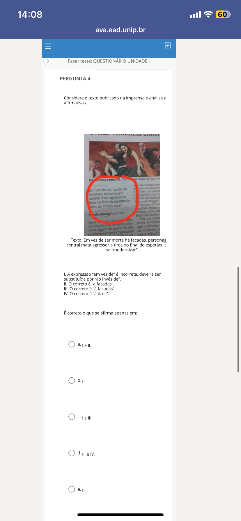 14:08 60 ava.ead.unip.br > Fazer teste: QUESTIONÁRIO UNIDADE I PERGUNTA 4 Considere texto publicado na imprensa e analise a afirmativas. Em vez de ser facadas, personagem central mata agressor a tiros no final do espetáculo ara se para REUTERS final morta Após nossa roina cigana da ópera de Texto: Em vez de ser morta há facadas, personag central mata agressor a tiros no final do se "modernizar" I.A expressão "em vez de" é incorreta, deveria ser substituída por "ao invés de". II. O correto facadas". III. correto facadas". IV. correto é "à tiros". É correto que se afirma apenas em: a. II. d. III IV. e. III.