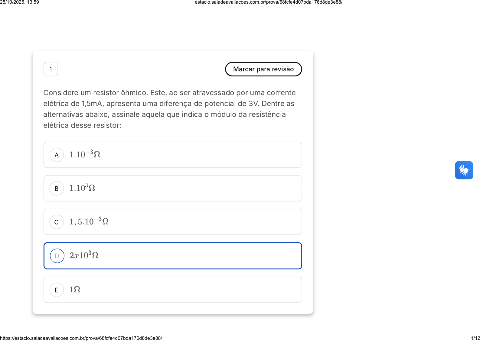 A B C D E 1 Marcar para revisão Considere um resistor ôhmico. Este, ao ser atravessado por uma corrente elétrica de 1,5mA, apresenta uma diferença de potencial de 3V. Dentre as alternativas abaixo, assinale aquela que indica o módulo da resistência elétrica desse resistor: 1.10−3Ω 1.103Ω 1, 5.10−3Ω 2x103Ω 1Ω 25/10/2025, 13:59 estacio.saladeavaliacoes.com.br/prova/68fcfe4d07bda176d8de3e88/ https://estacio.saladeavaliacoes.com.br/prova/68fcfe4d07bda176d8de3e88/ 1/12 A B C D E 2 Marcar para revisão (Prefeitura de Colônia Leopoldina - AL / 2019) Leia as afirmativas a seguir: I. Os fios e os cabos são os tipos mais conhecidos de condutores elétricos. II. O condutor elétrico é o produto destinado a conduzir a corrente elétrica. III. Isolantes são materiais que não conduzem corrente elétrica. Marque a alternativa correta: As três afirmativas são verdadeiras. A afirmativa I é verdadeira, II e III são falsas. A afirmativa II é verdadeira, I e III são falsas. As três afirmativas são falsas. A afirmativa III é verdadeira, I e II são falsas. 3 Marcar para revisão 25/10/2025, 13:59 estacio.saladeavaliacoes.com.br/prova/68fcfe4d07bda176d8de3e88/ https://estacio.saladeavaliacoes.com.br/prova/68fcfe4d07bda176d8de3e88/ 2/12 A B C Considere uma residência. Na tabela seguinte, tem-se a potência e o tempo de funcionamento de alguns aparelhos utilizados no mês. Considere os seguintes dados: Preço de energia elétrica por kWh custa R$0,40. O período para o cálculo da conta de energia elétrica mensal é de 30 dias e que a família gasta mensalmente R$200,00 com a conta de energia elétrica. Assinale a alternativa que apresenta o aparelho com maior consumo mensal além do impacto promovido pelo mesmo, em percentual, na conta mensal. Chuveiro; corresponde a 26,4% do custo mensal total; R$52,80 Geladeira, corresponde a 20% do custo mensal total; R$40,40 Chuveiro, corresponde a 18% do custo mensal total; R$53,60 25/10/2025, 13:59 estacio.saladeavaliacoes.com.br/prova/68fcfe4d07bda176d8de3e88/ https://estacio.saladeavaliacoes.com.br/prova/68fcfe4d07bda176d8de3e88/ 3/12 D E A B C Geladeira, corresponde a 21% do custo mensal total; R$71,60 Chuveiro, corresponde a 42% do custo mensal total; R$29,60 4 Marcar para revisão No ano de 2012 foi anunciado que uma empresa forneceria cerca de 230 turbinas para o segundo complexo de energia à base de ventos, localizado no Sudeste da Bahia. O chamado Complexo Eólico Alto Sertão, teria, por sua vez, no ano de 2014, uma capacidade geradora de 375MW (megawatts). Esse total é suficiente para abastecer uma cidade de 3 milhões de habitantes. Considerando as informações apresentadas, assinale a opção tecnológica que mais atende às informações: Redução da utilização elétrica Ampliação do uso bioenergético Expansão das fontes renováveis 25/10/2025, 13:59 estacio.saladeavaliacoes.com.br/prova/68fcfe4d07bda176d8de3e88/ https://estacio.saladeavaliacoes.com.br/prova/68fcfe4d07bda176d8de3e88/ 4/12 D E A B C Contenção da demanda urbano-industrial Intensificação da dependência geotérmica 5 Marcar para revisão Considere um circuito onde há um resistor de e por ele circule uma corrente de 3,0A. Este resistor está associado em paralelo com outro. A corrente total do circuito é de 4,5A. Qual o valor do segundo resistor? 10Ω 5,0 10 20 25/10/2025, 13:59 estacio.saladeavaliacoes.com.br/prova/68fcfe4d07bda176d8de3e88/ https://estacio.saladeavaliacoes.com.br/prova/68fcfe4d07bda176d8de3e88/ 5/12 D E 30 60 6 Marcar para revisão Com base no Método das Malhas e Lei de Kirchhoff das tensões para análise de circuitos, a equação que melhor relaciona as tensões e no circuito da figura é: Fonte: Autora V 1 V 2 SM1 Eletricidade Aplicada 25/10/2025, 13:59 estacio.saladeavaliacoes.com.br/prova/68fcfe4d07bda176d8de3e88/ https://estacio.saladeavaliacoes.com.br/prova/68fcfe4d07bda176d8de3e88/ 6/12 A B C D E V1 = 6i + 8 + V2 V1 = −6i + 8 + V2 V1 = 6i − 8 + V2 V1 = −6i − 8 − V2 V1 = −6i + 8 − V2 7 Marcar para revisão Com base na Lei de Kirchhoff das tensões (LKT), é possível afirmar que as tensões e no circuito da figura valem respectivamenteV1 V2 00 hora : 34 min : 35 seg Ocultar Questão 10 de 10 Respondidas (10) Em branco (0) Finalizar prova 1 2 3 4 5 6 7 8 9 10 25/10/2025, 13:59 estacio.saladeavaliacoes.com.br/prova/68fcfe4d07bda176d8de3e88/ https://estacio.saladeavaliacoes.com.br/prova/68fcfe4d07bda176d8de3e88/ 7/12 bruno Sublinhado bruno Nota RESPOSTA CORRETA A B C D E Fonte: Autora 10V e 20V. 30V e 15V. 25V e 15V. 30V e 25V. 10V e 15V. 25/10/2025, 13:59 estacio.saladeavaliacoes.com.br/prova/68fcfe4d07bda176d8de3e88/ https://estacio.saladeavaliacoes.com.br/prova/68fcfe4d07bda176d8de3e88/ 8/12 A B C D E 8 Marcar para revisão O voltímetro da figura informa a leitura de uma tensão contínua de 7,2 volts. Com base no valor dos resistores , e , a tensão à qual o resistor está submetido é de Fonte: Autora R1 R2 R3 R3 3,3 volts. 5,5 volts. 2,7 volts. 4,1 volts. 1,3 volts. 25/10/2025, 13:59 estacio.saladeavaliacoes.com.br/prova/68fcfe4d07bda176d8de3e88/ https://estacio.saladeavaliacoes.com.br/prova/68fcfe4d07bda176d8de3e88/ 9/12 A B C 9 Marcar para revisão Para o circuito ilustrado na figura, a corrente elétrica que circula pelo resistor é dada por Fonte: Autora R2 1A. 2A. 1,5A. 25/10/2025, 13:59 estacio.saladeavaliacoes.com.br/prova/68fcfe4d07bda176d8de3e88/ https://estacio.saladeavaliacoes.com.br/prova/68fcfe4d07bda176d8de3e88/ 10/12 D E 2,5A. 3A. 10 Marcar para revisão Considere o circuito da figura. A partir dos conceitos da Lei de Kirchhoff das correntes (LKC), o valor das correntes a , ilustradas na figura, são, respectivamente: Fonte: Alexander; Sadiku (2013, p. 60) I1 I4 25/10/2025, 13:59 estacio.saladeavaliacoes.com.br/prova/68fcfe4d07bda176d8de3e88/ https://estacio.saladeavaliacoes.com.br/prova/68fcfe4d07bda176d8de3e88/ 11/12 A B C D E I1 = 12A, I2 = −10A, I3 = 5A, I4 = −2A I1 = 10A, I2 = −