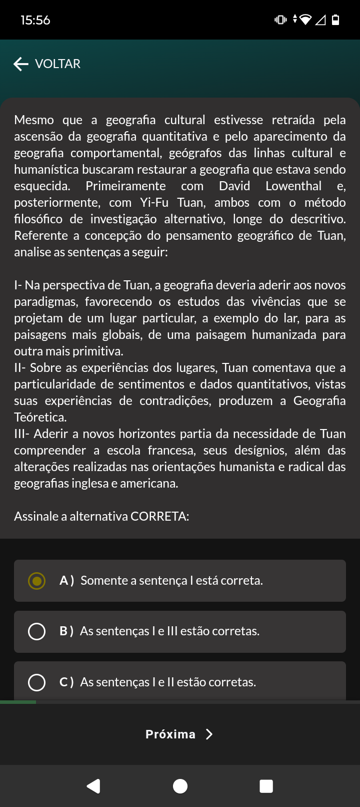 15:56 VOLTAR Mesmo que a geografia cultural estivesse retraída pela ascensão da geografia quantitativa e pelo aparecimento da geografia comportamental, geógrafos das linhas cultural e humanística buscaram restaurar a geografia que estava sendo esquecida. Primeiramente com David Lowenthal e, posteriormente, com Yi-Fu Tuan, ambos com método filosófico de investigação alternativo, longe do descritivo. Referente a concepção do pensamento geográfico de Tuan, analise as sentenças a seguir: I- Na perspectiva de Tuan, a geografia deveria aderir aos novos paradigmas, favorecendo os estudos das vivências que se projetam de um lugar particular, a exemplo do lar, para as paisagens mais globais, de uma paisagem humanizada para outra mais primitiva. II- Sobre as experiências dos lugares, Tuan comentava que a particularidade de sentimentos e dados quantitativos, vistas suas experiências de contradições, produzem a Geografia Teóretica. III- Aderir a novos horizontes partia da necessidade de Tuan compreender a escola francesa, seus desígnios, além das alterações realizadas nas orientações humanista e radical das geografias inglesa e americana. Assinale a alternativa CORRETA: A) Somente a sentença está correta. B) As sentenças e III estão corretas. C) As sentenças I e estão corretas. Próxima >