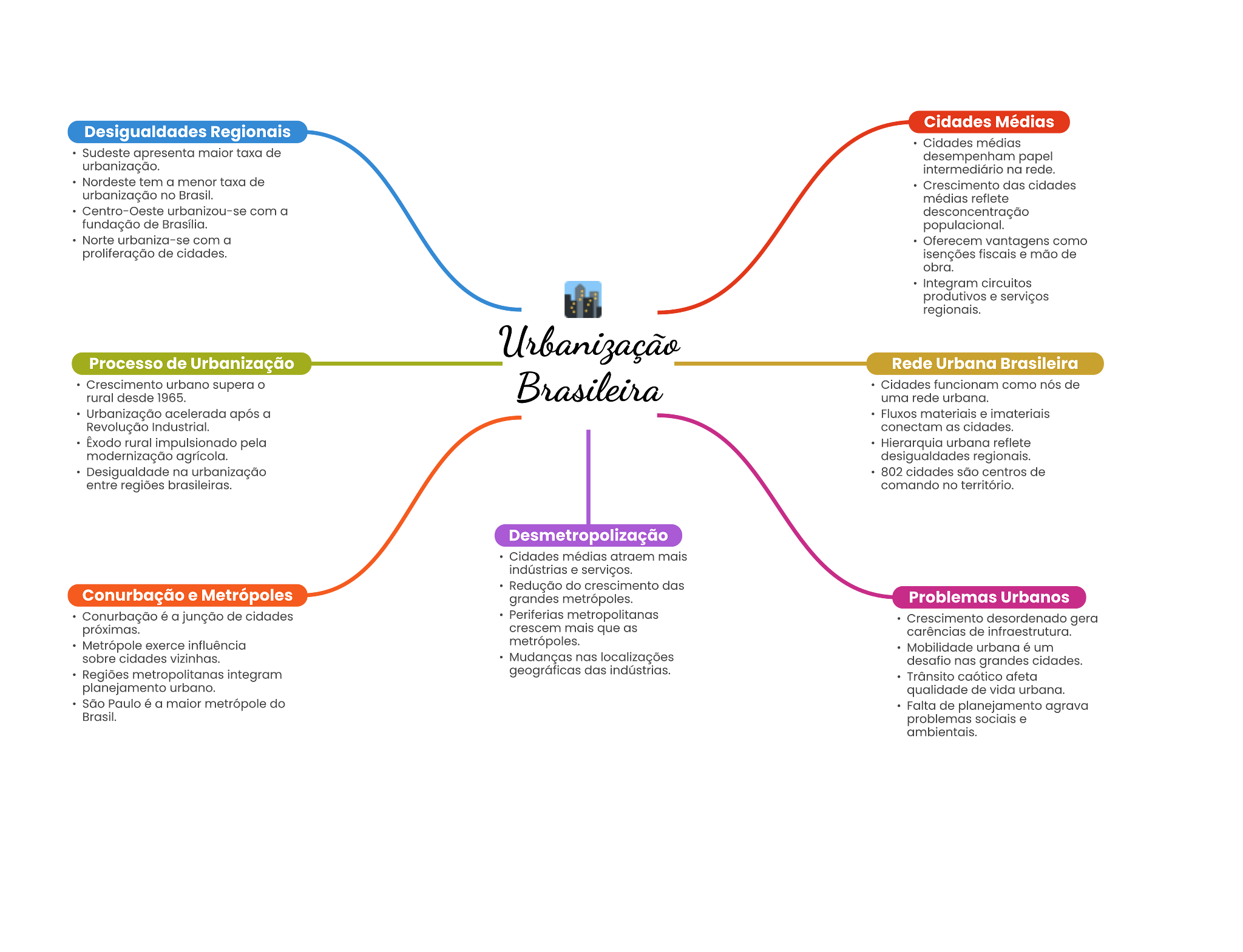 Cidades Médias Desigualdades Regionais Cidades médias apresenta maior de desempenham papel urbanização. na rede. Nordeste a menor de Crescimento das cidades no reflete urbanizou-se com a desconcentração fundação de populacional. Norte com a vantagens como proliferação de mão de obra. circuitos produtivos . serviços regionals. Processo de Urbanização Rede Urbana Brasileira Crescimento urbano supera Cidades funcionam como nós de rural 1965. uma rede urbana. Urbanização a Fluxos materials Revolução industrial. cidades. rural pela urbana regionals. Desigualdade na 802 cidades são centros de entre regiões brasileiras. comando no Desmetropolização Cidades médias serviços. Redução do crescimento das Conurbação e Metrópoles grandes metrópoles. Problemas Urbanos Conurbação a junção de desordenado gera crascem mais que as de influência Mobilidade urbana um sobre vizinhas. nas localizações desaño nas grandes cidades. Regiões metropolitanas integram geográficas das urbano. qualidade de vida urbana. São Paulo 6 a malor do Falta de agrava problemas