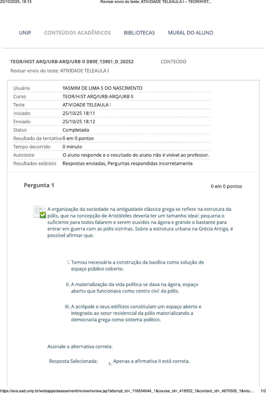 25/10/2025, 18:13 Revisar envio do teste: ATIVIDADE TELEAULA TEOR/HIST... UNIP CONTEÚDOS ACADÊMICOS BIBLIOTECAS MURAL DO ALUNO TEOR/HIST ARQ/URB-ARQ/URB II D89E_13901_D_20252 CONTEÚDO Revisar envio do teste: ATIVIDADE TELEAULA Usuário YASMIM DE LIMA S DO NASCIMENTO Curso TEOR/HIST ARQ/URB-ARQ/URB Teste ATIVIDADE TELEAULA Iniciado 25/10/25 18:11 Enviado 25/10/25 18:12 Status Completada Resultado da tentativa 0 em 0 pontos Tempo decorrido 0 minuto Autoteste O aluno responde e resultado do aluno não é visível ao professor. Resultados exibidos Respostas enviadas, Perguntas respondidas incorretamente Pergunta 1 0 em 0 pontos A organização da sociedade na antiguidade clássica grega se reflete na estrutura da pólis, que na concepção de Aristóteles deveria ter um tamanho ideal: pequena suficiente para todos falarem e serem ouvidos na ágora e grande bastante para entrar em guerra com as pólis vizinhas. Sobre a estrutura urbana na Grécia Antiga, é possível afirmar que: Tornou necessária a construção da basílica como solução de espaço público coberto. II. A materialização da vida política se dava na ágora, espaço aberto que funcionava como centro civil da pólis. III. A acrópole e seus edifícios constituíam um espaço aberto e integrado ao setor residencial da pólis materializando a democracia grega como sistema político. Assinale a alternativa correta: Resposta Selecionada: C. Apenas a afirmativa está correta. 1/225/10/2025, 18:13 Revisar envio do teste: ATIVIDADE TELEAULA TEOR/HIST... Pergunta 2 0 em 0 pontos Pode-se considerar que Vitruvio (século I a.C.) estabelece pela primeira vez a questão do método em arquitetura. Em sua obra Da arquitetura (Os dez livros da arquitetura) propõe que os objetivos da arquitetura se referem ao equilíbrio entre FIRMITAS (solidez), UTILITAS (utilidade) e VENUSTAS (beleza). Desse modo, sistema de controle da arquitetura clássica romana está diretamente relacionado à aplicação equilibrada e justa desses três fatores que constituem a tríade vitruviana. Assim, pode-se afirmar que: I. Uma obra com ênfase na utilitas resulta em uma obra de tendência funcionalista. II. Uma ênfase na firmitas torna uma obra mais afeita às soluções artísticas que técnicas. III. Uma acentuação na venustas em detrimento dos outros fatores resulta numa obra que se aproxima mais da escultura que da arquitetura. Assinale a alternativa correta: Resposta Selecionada: a. Apenas a afirmativa I está correta. Sábado, 25 de Outubro de 2025 18h12min26s GMT-03:00 OK 2/2