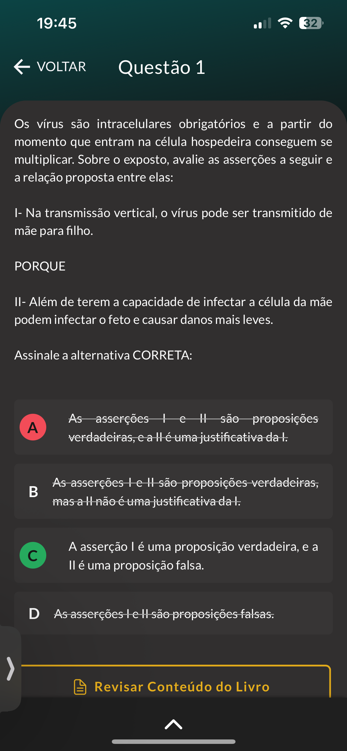 19:45 32 VOLTAR Questão 1 Os vírus são intracelulares obrigatórios e a partir do momento que entram na célula hospedeira conseguem se multiplicar. Sobre exposto, avalie as asserções a seguir e a relação proposta entre elas: I- Na transmissão vertical, vírus pode ser transmitido de mãe para filho. PORQUE II- Além de terem a capacidade de infectar a célula da mãe podem infectar feto e causar danos mais leves. Assinale a alternativa CORRETA: As asserções e H são proposições A verdadeiras, H é uma justificativa da As asserções le H são proposições verdadeiras, mas a H não é uma justificativa da I. A asserção I é uma proposição verdadeira, e a é uma proposição falsa. D As asserções le H são proposições falsas. Revisar Conteúdo do Livro
