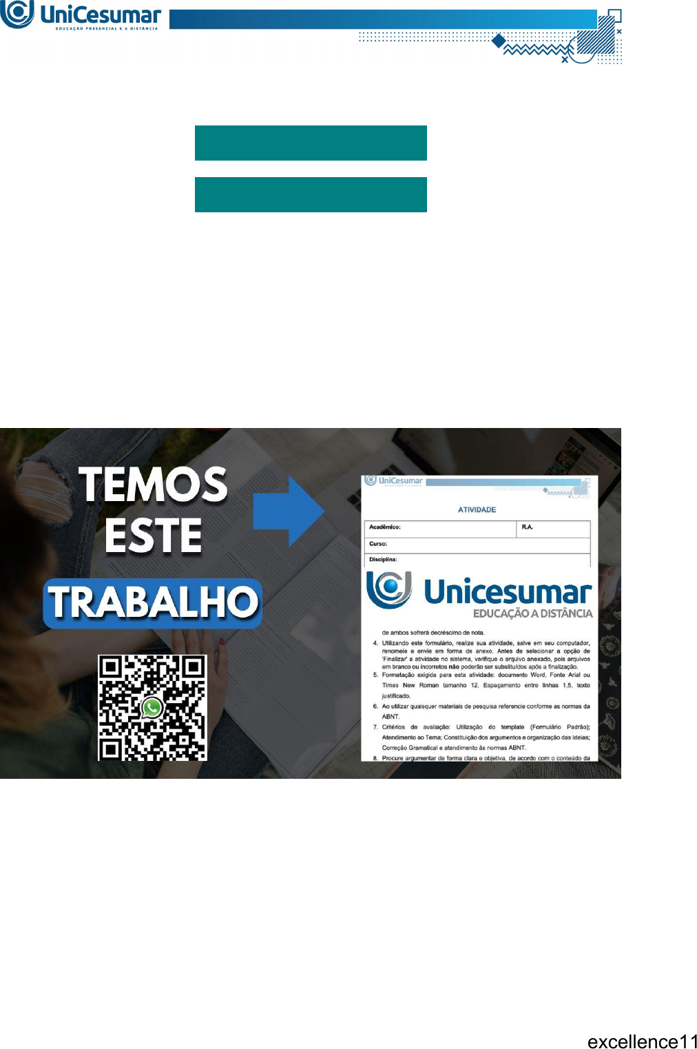 (99) 99119-3171 (99) 99119-3171 Olá!!! Somos da Assessoria Excellence Educacional e iremos te ajudar com este trabalho! Entre em contato conosco! PORTFÓLIO - GERON - IMERSÃO PROFISSIONAL: TÉCNICAS E PROCEDIMENTOS DE PRIMEIROS SOCORROS - 54_2025 PORTFÓLIO - GERON - IMERSÃO PROFISSIONAL: TÉCNICAS E PROCEDIMENTOS DE PRIMEIROS SOCORROS - 54_2025 Prezado estudante, Nesta atividade MAPA, você será convidado a explorar os componentes do atendimento da Ressuscitação Cardiopulmonar (RCP) em adultos e adolescentes. Esta atividade excellence11 conectará teoria e prática, abordando desde o reconhecimento da Parada Cardiorrespiratória (PCR) até as ações de compressões torácicas e o uso do Desfibrilador Externo Automático (DEA). Seu desafio: Imagine que você é o profissional de saúde responsável por iniciar o atendimento de uma vítima em PCR no ambiente extra-hospitalar. Sua missão é aplicar corretamente os passos da cadeia de sobrevivência, demonstrar a utilização do DEA e registrar a execução prática das manobras de compressão torácica. Ao final, você deverá refletir sobre como essas condutas aumentam a chance de sobrevivência da vítima. O objetivo desta atividade é criar um paralelo entre as diretrizes de RCP da American Heart Association (AHA) e a prática em primeiros socorros, estimulando a aplicação correta, rápida e segura. Você deve entregar sua atividade utilizando o formulário padrão respondendo as seguintes questões: 1. Quais são os componentes do atendimento da RCP para adultos e adolescentes? Liste todos os passos e explique a forma de execução de cada um. 2. Descreva a função do DEA (Desfibrilador Externo Automático) durante o atendimento da PCR. Explique como o equipamento auxilia o socorrista na tomada de decisão e na reversão dos ritmos chocáveis. 3. Parte prática – agora com auxílio de um colega ou familiar, registre em fotos a execução dos seguintes momentos: a) Você na posição correta para realizar compressão torácica em uma vítima no chão. b) O procedimento de reconhecimento da PCR (checagem de responsividade). Em uma vítima no chão. Obs: foto da atividade proposta precisa estar anexada ao formulário-padrão, devendo ser incluída de forma que não identifique rostos, preservando assim a identidade e a privacidade excellence11 Atenção: durante a simulação prática, não realize compressões reais para evitar lesões no colega ou familiar. Apenas demonstre a posição correta. Fonte: STIES, S. W.; ORTOLAN, X. R. Técnicas e procedimentos de primeiros socorros. Maringá: Unicesumar, 2019. Reimpr. 2022. excellence11