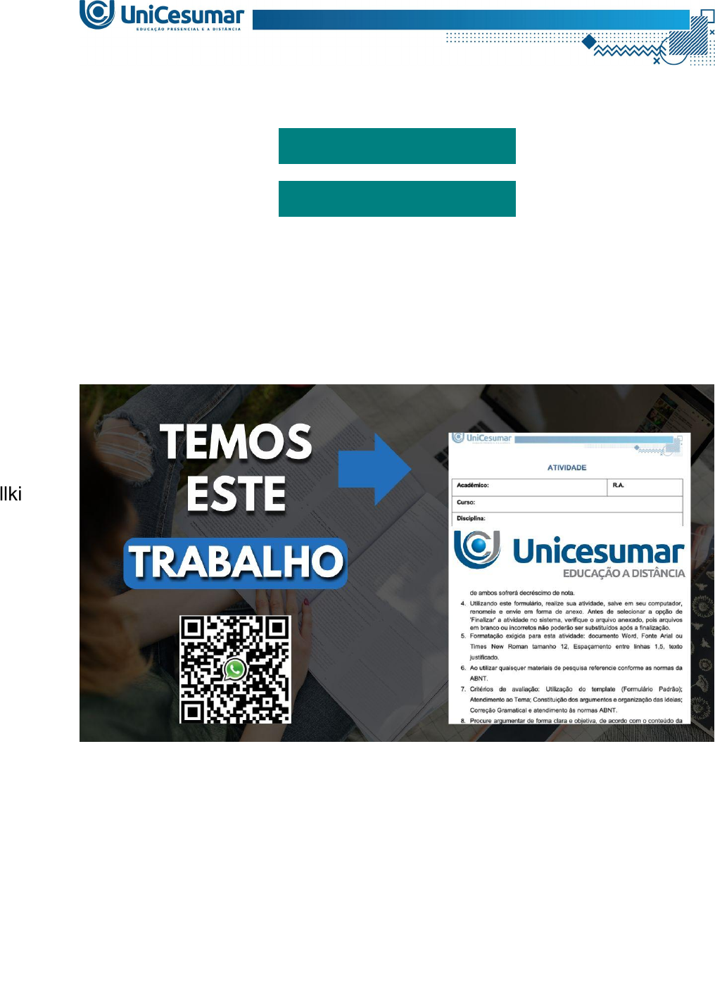 (99) 99119-3171 (99) 99119-3171 Olá!!! Somos da Assessoria Excellence Educacional e iremos te ajudar com este trabalho! Entre em contato conosco! MAPA - BEDU - GESTÃO ESPORTIVA - 54_2025 MAPA - BEDU - GESTÃO ESPORTIVA - 54_2025 Com o objetivo de auxiliar o Ministério do Esporte no desenvolvimento do Sistema Nacional de Informações e Indicadores Esportivos (SNIIE) e fortalecer a gestão esportiva nacional com base em governança, transparência e planejamento, o Instituto de Pesquisa Inteligência Esportiva (IPIE) criou um sistema de dados para entidades de administração do esporte públicas e privadas visando levantar dados quantitativos e qualitativos sobre a gestão do esporte nos estados e municípios brasileiros, permitindo um diagnóstico aprofundado das políticas esportivas nacionais. Assim, sabendo da importância sobre o conhecimento das políticas públicas e dados referentes ao esporte brasileiro, o objetivo desse trabalho é investigar a realidade da gestão esportiva no seu município por meio do site do IPIE llki (Informações Públicas de Investimento no Esporte), analisando dados públicos e refletindo sobre políticas públicas voltadas ao esporte. Portanto, para realização deste MAPA, você deverá seguir os passos abaixo. Fonte: INSTITUTO DE PESQUISA INTELIGÊNCIA ESPORTIVA – IPIE. Informações Públicas de Investimento no Esporte – GEEM. Disponível em: https://ipie.ufpr.br/geem/. PASSO A PASSO DA ATIVIDADE: A - Acesse o site: Link: https://ipie.ufpr.br/geem/ B - Pesquise o município escolhido. Utilize a barra de pesquisa para encontrar o seu município de origem. Caso o seu município de origem não possua informações disponíveis no site do IPIE, selecione outro município de sua escolha que esteja cadastrado no sistema. O site carregará a página com os dados específicos do município. Observe as informações disponíveis: estrutura esportiva, investimentos, projetos, políticas públicas, entre outros. C - Tire prints das telas: Tire um print da tela que mostre claramente a informação. Ex.: para orçamento esportivo, tire print da seção onde aparece o valor destinado. Para políticas públicas, capture a tela que mostre o nome da política ou projeto. Certifique-se de que o nome do município esteja visível no print, para comprovar que a pesquisa foi feita corretamente. D - Responda às questões a seguir utilizando os prints. 1) Qual é o nome do seu município e estado? Insira aqui o print da tela de pesquisa que consta essa informação. 2) O município possui Secretaria de Esporte própria ou vinculada a outra pasta? Insira aqui o print da tela de pesquisa que consta essa informação. 3) Há políticas públicas específicas voltadas ao esporte? Se sim, cite quais. (Aqui obrigatoriamente deverá conter o print da tela). Insira aqui o print da tela de pesquisa que consta essa informação. 4) Existe orçamento público voltado ao esporte? Insira aqui o print da tela de pesquisa que consta essa informação. 5) Quantos equipamentos esportivos estão cadastrados (ex: ginásios, quadras, campos)? Insira aqui o print da tela de pesquisa que consta essa informação. llki 6) O município participa de algum programa estadual ou federal voltado ao esporte? Insira aqui o print da tela de pesquisa que consta essa informação. E- As questões abaixo devem ser respondidas de forma discursiva. 7) Na sua opinião, como está a situação do esporte no município escolhido? Justifique. Insira aqui a resposta 8) De acordo com o material didático da disciplina, descreva sobre a importância de ações, programas, projetos e políticas públicas de esporte no município e como elas impactam a população, considerando a situação do município escolhido na pesquisa. Insira aqui a resposta ATENÇÃO! - A atividade deverá ser realizada individualmente. - Você deverá entregar esta atividade por meio do arquivo MODELO MAPA. - Utilize o livro da disciplina em formato PDF, disponível para baixar no ambiente da disciplina.llki