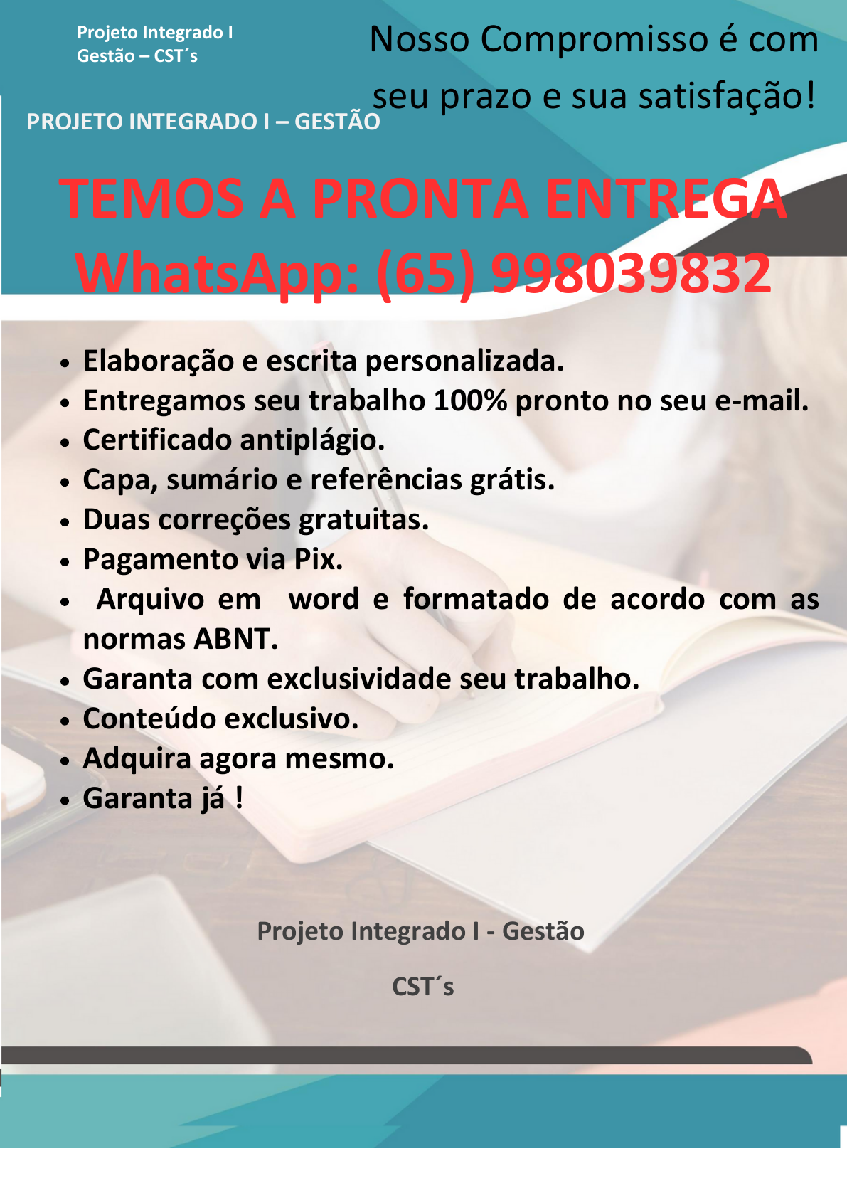 Projeto Integrado I Gestão – CST´s CST´s Projeto Integrado I - Gestão PROJETO INTEGRADO I – GESTÃO Nosso Compromisso é com seu prazo e sua satisfação! TEMOS A PRONTA ENTREGA WhatsApp: (65) 998039832 Elaboração e escrita personalizada. Entregamos seu trabalho 100% pronto no seu e-mail. Certificado antiplágio. Capa, sumário e referências grátis. Duas correções gratuitas. Pagamento via Pix. Arquivo em word e formatado de acordo com as normas ABNT. Garanta com exclusividade seu trabalho. Conteúdo exclusivo. Adquira agora mesmo. Garanta já ! Projeto Integrado I Gestão – CST´s 1. 2. 3. 4. 5. Objetivos da Aprendizagem: O Projeto Integrado é um procedimento metodológico de ensino aprendizagem que tem por objetivos: • Instigar os alunos, apoiados nas informações presentes na BNCC sobre a área da linguagem como ferramenta norteadora, para o planejamento de atividades diferenciadas. Relacionar teoria e prática, a fim de proporcionar atividades • embasamento extracurriculares. Desenvolveros estudos independentes, sistemáticos e o autoaprendizado. Favoreceraaprendizagem. Promoveraaplicação da teoria e conceitos para a soluçãodeproblemas práticos relativos à profissão. para atuação em • • • NORMAS PARAELABORAÇÃOEENTREGA DA PRODUÇÃO TEXTUAL O trabalho será realizadoindividualmente. Importante: Vocêdeverápostarotrabalhofinalizado no AVA, o que deverá ser feito na pasta específica (“atividadesinterdisciplinares”),obedecendo ao prazo limite de postagem, conforme dispostonoAVA.Nãoexisteprorrogação para a postagem da atividade. Deve conter,depoisdepronto,capaefolhaderosto padrão da Instituição, sendo organizado no que tangeàsuaapresentaçãovisual(tiposetamanhos de fontes, alinhamento do texto, espaçamentos,adentramentodeparágrafos,apresentação correta de citações e referências, entre outroselementosimportantes),conformemodelo disponível no AVA. A produçãotextualéumtrabalhooriginale,portanto, não poderá haver trabalhos idênticos aos de outrosalunosoucomreproduçãodemateriais extraídos da internet. Os trabalhos plagiadosserãoinvalidados,sendoosalunosreprovados na atividade. Lembre-se de que a prática doplágioconstituicrime,compenaprevista em lei (Lei n.º 9.610), e deve ser evitada no âmbitoacadêmico. Importante:Otrabalhodeveserenviadoemformato Word. Não serão aceitos, sob nenhuma hipótese, trabalhos enviados em PDF. Aseguir,apresentamosavocêalgunsdoscritérios avaliativos que nortearão a análise do TutoraDistânciaparaatribuiroconceitoàprodução textual: Normalizaçãocorretadotrabalho,comatendimento ao número de páginas solicitadas. Apresentaçãodeestruturacondizentecomaproposta apresentada (com introdução, desenvolvimento e conclusão). • • TEMOS A PRONTA ENTREGA WhatsApp: (65) 998039832 http://www.planalto.gov.br/ccivil_03/leis/L9610.htm http://www.planalto.gov.br/ccivil_03/leis/L9610.htm http://www.planalto.gov.br/ccivil_03/leis/L9610.htm Projeto Integrado I Gestão – CST´s • • • Bom trabalho! Equipe de professores Uso de linguagem acadêmica adequada, com clareza e correção, atendendo à norma padrão. Atendimento à proposta, contemplando todos os itens solicitados, com objetividade, criatividade, originalidade e autenticidade. Fundamentação teórica do trabalho, com as devidas referências dos autores eventualmente citados. Lembre-se de que seu Tutor a Distância está à disposição para lhe atender em suas dúvidas e, também, para repassar orientações sempre que você precisar. Aproveite esta oportunidade para realizar um trabalho com a qualidade acadêmica de nível universitário. TEMOS A PRONTA ENTREGA WhatsApp: (65) 998039832 Projeto Integrado I Gestão – CST´s Estudo de Caso: "Inovação Social na Indústria Têxtil" A Têxtil Verde, uma indústria de vestuário estabelecida em uma cidade de médio porte, enfrenta o desafio de reinventar sua abordagem empresarial para crescer em um mercado altamente competitivo. Ao realizar uma consultoria, verificou-se uma grande oportunidade em um nicho de mercado que busca produtos mais sustentáveis, impulsionada pelo aumento de consumidores cada vez mais conscientes e exigentes. Os diretores da empresa viram essa ideia muito oportuna e condizente com seus valores, uma vez que já haviam empreendido um projeto anterior focado em desenvolver uma cadeia de suprimentos ética e sustentável, reduzindo o impacto ambiental e promovendo condições de trabalho que gere respeito e satisfação no ambiente de trabalho. O novo projeto envolve a criação de parcerias estratégicas com fazendas de algodão orgânico, a implementação de práticas de produção ecoeficientes e a capacitação de comunidades locais em regiões de produção. A gestão de projetos torna-se crucial para coordenar as diferentes fases, desde o design sustentável até a comercialização dos produtos. O empreendedorismo da Têxtil Verde é evidente na abordagem inovadora para conquistar mercados que valorizam a produção ética. Além disso, a empresa compromete-se com a transparência, educando os consumidores sobre a procedência sustentável de seus produtos. Em seu novo projeto, a Têxtil Verde não apenas busca transformar operacionalmente a empresa, mas também construir uma marca consciente que ressoe com as expectativas do consumidor moderno, reforçando os benefícios tangíveis das práticas empresariais socialmente responsáveis e sustentáveis. Leitura proposta Para atingir os objetivos deste projeto integrado, você deverá seguir as instruções voltadas à elaboração do trabalho disponibilizadas ao longo do semestre, sob a orientação do Tutor a Distância. SITUAÇÃO PROPOSTA Projeto Integrado I Gestão – CST´s REFERÊNCIAS PARA ATIVIDADE: KURATKO, Donald F. Empreendedorismo: processo, prática. São Paulo: Cengage Learning Brasil, 2018. ATIVIDADES ATIVIDADE 1 Estudante, desenvolva um plano estratégico para a implementação bem-sucedid