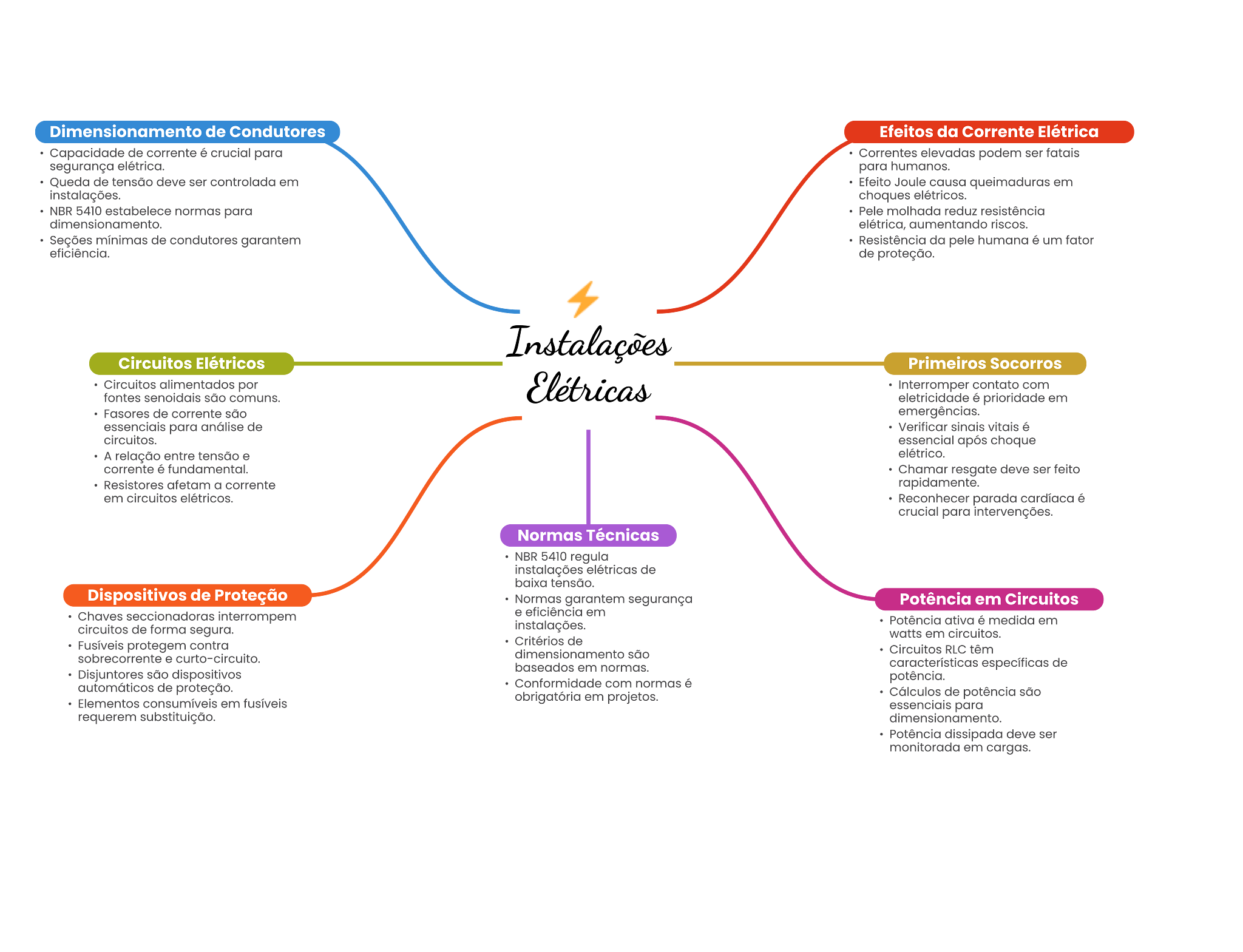 Dimensionamento de Condutores Efeitos da Corrente Elétrica Capacidade de corrente é crucial para Correntee elevadas podem ser segurança para humanos. Queda de tensão deve ser controlada em Efeito causa queimaduras em choques elétricos. NBR 5410 para molhada reduz resistência dimensionamento. elétrica, aumentando riscos. Seções de condutores garantem Resistência da pele humana um fator eficiência. de proteção. Circuitos Elétricos Primeiros Socorros Circultos allmentados por contato com fontes prioridade em Fasores de corrente para de Verificar single vitale é circultos. essencial choque A relação entre elétrico. corrente fundamental. Chamar resgate deve ser Resistores afetam a corrente rapidamente. em circultos elétricos. Reconhecer parada é crucial para Intervenções. Normas Técnicas NBR 5410 regula instalações elétricas de Dispositivos de Proteção Normas garantem segurança Potência em Circuitos Chaves seccionadoras eficiência em Potência ativa medida em circuitos de forma segura. watts em protegem contra de sobrecorrente dimensionamento são Circultos RLC têm em normas. coracterísticas específicas de Disjuntores são dispositivos Conformidade com normas potância. automáticos de proteção. obrigatória em projetos. de potência são Elementos em essenciale para requerem dimensionamento. Potância dissipada deve ser monitorada em cargas.