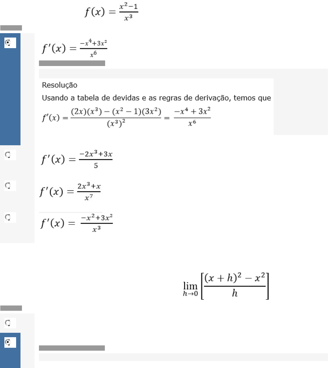 Questão 1/10 - Cálculo Diferencial e Integral a Uma Variável Calcule a derivada da função Nota: 10.0 A Você assinalou essa alternativa (A) Você acertou! B C D Questão 2/10 - Cálculo Diferencial e Integral a Uma Variável Use uma simplificação algébrica para achar o limite, se existe: Nota: 10.0 A 3x2 B 2x Você assinalou essa alternativa (B) Você acertou! C 4x D 5x3 Questão 3/10 - Cálculo Diferencial e Integral a Uma Variável Calcule a derivada da função f(x) = (x2 - 1)3 Nota: 10.0 A f'(x) = 3x4 - 2x2 + x B f'(x) = 6x5 - 12x3 + 6x Você assinalou essa alternativa (B) Você acertou! C f'(x) = 6x3 - x2 + 6 D f'(x) = 6x4 - 12x3 + 7x Questão 4/10 - Cálculo Diferencial e Integral a Uma Variável Calcule da função , por derivação implícita. Nota: 10.0 A Você assinalou essa alternativa (A) Você acertou! B C D Questão 5/10 - Cálculo Diferencial e Integral a Uma Variável Calcular o limite: Nota: 10.0 A 0 B 1 C -1 D 3 Você assinalou essa alternativa (D) Você acertou! E -3 Questão 6/10 - Cálculo Diferencial e Integral a Uma Variável Calcule a derivada da função Nota: 10.0 A f'(x) = x Você assinalou essa alternativa (A) Você acertou! Resolução Usando a tabela de devidas e as regras de derivação, temos que f'(x) = x B f'(x) = 2x2 C f'(x) = 1 D f'(x) = 0 Questão 7/10 - Cálculo Diferencial e Integral a Uma Variável Use o gráfico dado de f para dizer o valor de cada quantidade, se ela existir. Abaixo, marque a questão correta: Nota: 10.0 A B C Você assinalou essa alternativa (C) Você acertou! D Questão 8/10 - Cálculo Diferencial e Integral a Uma Variável Calcule o limite: Nota: 0.0Você não pontuou essa questão A 0 B 1 Você assinalou essa alternativa (B) C 2 D -1 E -2 Questão 9/10 - Cálculo Diferencial e Integral a Uma Variável Use uma simplificação algébrica para achar o limite, se existe: Nota: 10.0 A B Você assinalou essa alternativa (B) Você acertou! C D E Zero Questão 10/10 - Cálculo Diferencial e Integral a Uma Variável Calcular a derivada da função f(x) = (x+1)2 no ponto x0=2 Nota: 10.0 A 2 B 0 C 3 D 6 Você assinalou essa alternativa (D) Você acertou! E -3 image5.wmf image6.png image7.png image8.png image9.png image10.png image11.png image12.png image13.png image14.png image15.png image16.png image17.png image18.png image19.png image20.png image21.png image1.png image22.png image23.png image24.png image25.png image26.png image27.png image2.wmf image28.png image29.png image30.png image31.png image32.png image33.png image34.png image35.png image36.png image3.png image37.png image4.png