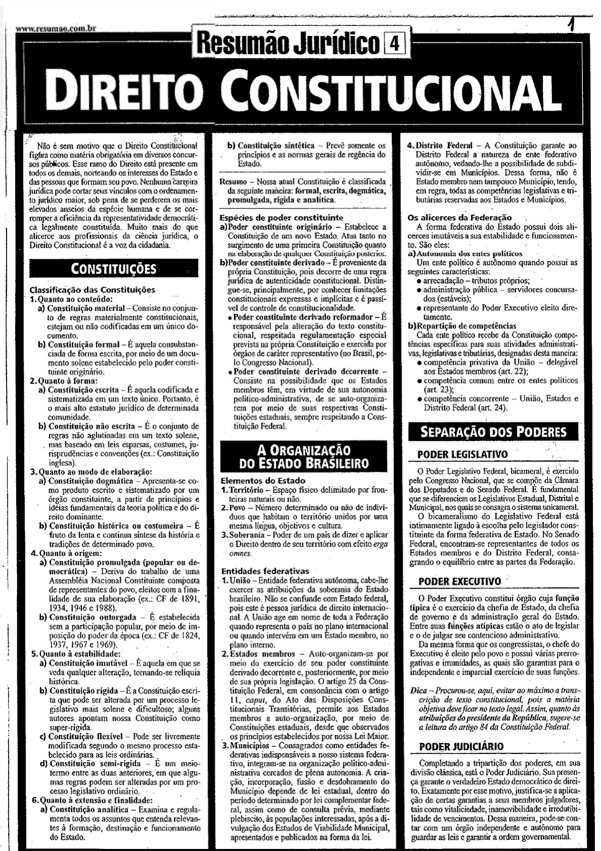 Resumão Jurídico 4 DIREITO CONSTITUCIONAL Não é sem motivo que o Direito b) Constituição sintética Prevê somente os 4. Distrito Federal A Constituição garante ao figtira como matéria obrigatória em diversos concur- principios e as normas gerais de regência do Distrito Federal a natureza de ente federativo públicos. Esse ramo do Direito está presente em Estado. autônomo, vedando-lhe a possibilidade de subdi- todos demais, norteando os interesses do Estado e vidir-se em Municípios. Dessa forma, não é das pessoas que formam seu povo. Nenhuma carreira Resumo Nossa atual Constituição é classificada Estado membro nem tampouco Município, tendo, jurídica pode cortar seus vínculos com ordenamen- da seguinte maneira: formal, escrita, dogmática, em regra, todas as competências legislativas e tri- to jurídico maior, sob pena de se perderem os mais promulgada, rígida e butárias reservadas aos Estados e Municípios. elevados anseios da espécie humana e de se cor- romper a eficiência da representatividade democráti- Espécies de poder constituinte Os alicerces da Federação ca legalmente Muito mais do que a) Poder constituinte originário Estabelece a A forma federativa do Estado possui dois ali- alicerce aos profissionais da ciência jurídica, 0 Constituição de um novo Estado. Atua tanto no cerces imutáveis a sua estabilidade e funcionamen- Direito Constitucional é a da cidadania. surgimento de uma primeira Constituição quanto to. São eles: na elaboração de qualquer Constituição posterior. a) Autonomia dos entes políticos CONSTITUIÇÕES b)Poder constituinte derivado É proveniente da Um ente político é autônomo quando possui as própria Constituição, pois decorre de uma regra seguintes características: jurídica de autenticidade constitucional. Distin- arrecadação tributos próprios; Classificação das Constituições gue-se, principalmente, por conhecer limitações administração pública servidores concursa- 1. Quanto ao conteúdo: constitucionais expressas e implicitas e é passi- dos (estáveis); a) Constituição material Consiste no conjun- vel de controle de constitucionalidade. representante do Poder Executivo eleito dire- to de regras materialmente constitucionais, Poder constituinte derivado reformador É tamente. estejam ou não codificadas em um único do- responsável pela alteração do texto constitu- b) Repartição de competências cumento. cional, respeitada regulamentação especial Cada ente político recebe da Constituição compe- b) Constituição formal É aquela consubstan- prevista na própria Constituição e exercida por tências para suas atividades administrati- ciada de forma escrita, por meio de um docu- órgãos de caráter representativo (no Brasil, pe- vas, legislativas e tributárias, designadas desta maneira: mento solene estabelecido pelo poder consti- lo Congresso Nacional). competência privativa da União delegável tuinte originário. Poder constituinte derivado decorrente aos Estados membros (art. 22); 2. Quanto à forma: Consiste na possibilidade que os Estados competência comum entre entes políticos a) Constituição escrita É aquela codificada e membros têm, em virtude de sua autonomia (art. 23); sistematizada em um texto único. Portanto, é politico-administrativa, de se auto-organiza- competência concorrente União, Estados e mais alto estatuto jurídico de determinada rem por meio de suas respectivas Consti- Distrito Federal (art. 24). comunidade. tuições estaduais, sempre respeitando a Cons- b) Constituição não escrita É conjunto de tituição Federal. regras não aglutinadas em um texto solene, SEPARAÇÃO DOS PODERES mas baseado em leis esparsas, costumes, ju- risprudências e convenções (ex.: Constituição A ORGANIZAÇÃO PODER LEGISLATIVO inglesa). DO ESTADO 3. Quanto ao modo de elaboração: Poder Legislativo Federal, bicameral, é exercido a) Constituição dogmática Apresenta-se Elementos do Estado pelo Congresso Nacional, que se compõe da Câmara mo produto escrito e sistematizado por um 1. Território Espaço físico delimitado por fron- dos Deputados e do Senado Federal. fundamental órgão constituinte, a partir de e teiras naturais ou não. que se diferenciem os Legislativos Estadual, Distrital e idéias fundamentais da teoria e do di- 2. Povo Número determinado ou não de indivi- Municipal, nos quais se consagra sistema unicameral. reito dominante. duos que habitam território unidos por uma 0 bicameralismo do Legislativo Federal está b) Constituição histórica ou costumeira É mesma objetivos e cultura. intimamente ligado à escolha pelo legislador cons- fruto da lenta e da história e Soberania Poder de um país de dizer aplicar tituinte da forma federativa de Estado. No Senado tradições de determinado povo. Direito dentro de seu território com efeito erga Federal, encontram-se representantes de todos 4. Quanto à origem: omnes. Estados membros e do Distrito Federal, consa- a) Constituição promulgada (popular ou de- grando equilibrio entre as partes da Federação. mocrática) Deriva do trabalho de uma Entidades federativas Assembléia Nacional Constituinte composta 1. União Entidade federativa autônoma, cabe-lhe PODER EXECUTIVO de representantes do povo, eleitos com a fina- exercer as atribuições da soberania do Estado lidade de sua elaboração (ex.: CF de 1891, brasileiro. Não se confunde com Estado federal, 0 Poder Executivo constitui órgão cuja função 1934, 1946 e 1988). pois este é pessoa jurídica de direito internacio- típica é exercício da chefia de Estado, da chefia b) Constituição outorgada É estabelecida nal. A União age em nome de toda a Federação de governo e da administração geral do Estado. sem a participação popular, por meio de im- quando representa país no plano internacional Entre suas funções atípicas estão ato de legislar posição do poder da época (ex.: CF de 1824, ou quando intervém em um Estado memb