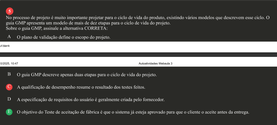 5 No processo de projeto é muito importante projetar para 0 ciclo de vida do produto, existindo vários modelos que descrevem esse ciclo. guia GMP apresenta um modelo de mais de dez etapas para 0 ciclo de vida do projeto. Sobre guia GMP, assinale a alternativa CORRETA: A plano de validação define escopo do projeto. 0/2025, 10:47 Autoatividades Webaula 3 B O guia GMP descreve apenas duas etapas para ciclo de vida do projeto. A qualificação de desempenho resume resultado dos testes feitos. D A especificação de requisitos do usuário é geralmente criada pelo fornecedor. E objetivo do Teste de aceitação de fábrica é que 0 sistema já esteja aprovado para que 0 cliente 0 aceite antes da entrega.