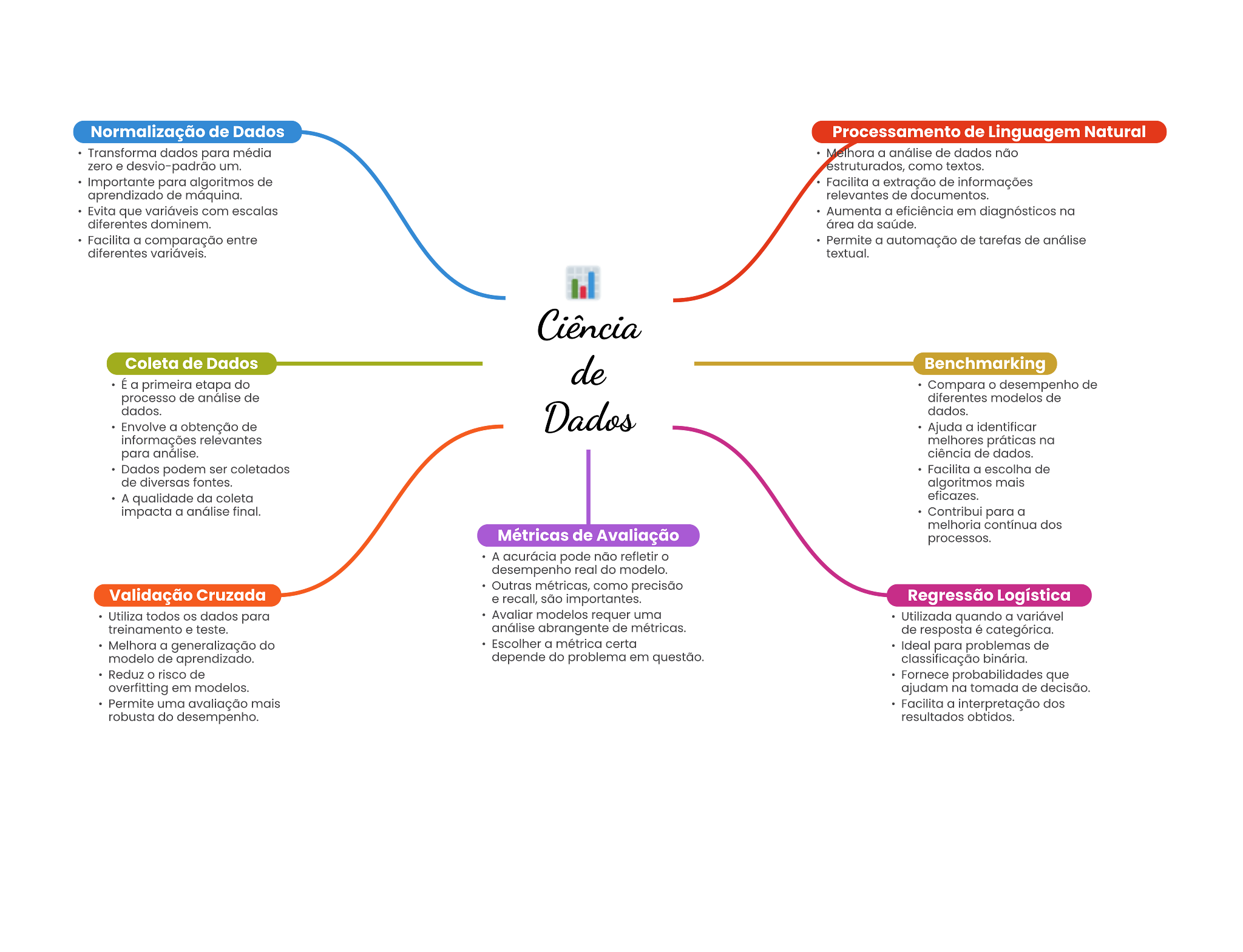 Normalização de Dados Processamento de Linguagem Natural Transforma dados para média a de dados não zero . desvio-padrão um. como para de Facilita a extração de de maquina. relevantes de documentos. Evita que com escalas a eficiência em diagnósticos na diferentes dominem. da Facilita a comparação entre Permite a automação de tarefas de diferentes textual. Coleta de Dados Benchmarking a primeira etapa do Compara desempenho de processo de de diferentes modelos de dados. dados. Envolve a obtenção de Ajuda a identificar informações relevantes melhores na para ciência de Dados podem ser Facilita a de de fontes. algoritmos mais A qualidade da coleta a final. Contribui para a melhoria continua dos Métricas de Avaliação processos. A acurácia pode não refletir desempenho real do modelo. métricas, como precisão Validação Cruzada são Regressão Logística Utiliza todos dados para Avaliar modelos requer uma quando a variável abrangente de métricas. de resposta categórica. Melhora a generalização do Escolher a certa Ideal para problemas de modelo de aprendizado. depende do problema em questão. binária. Reduz risco de Fornece probabilidades que overfitting em modelos. ajudam na de decisão. Permite uma avaliação Facilita interpretação dos robusta do desempenho. resultados obtidos.
