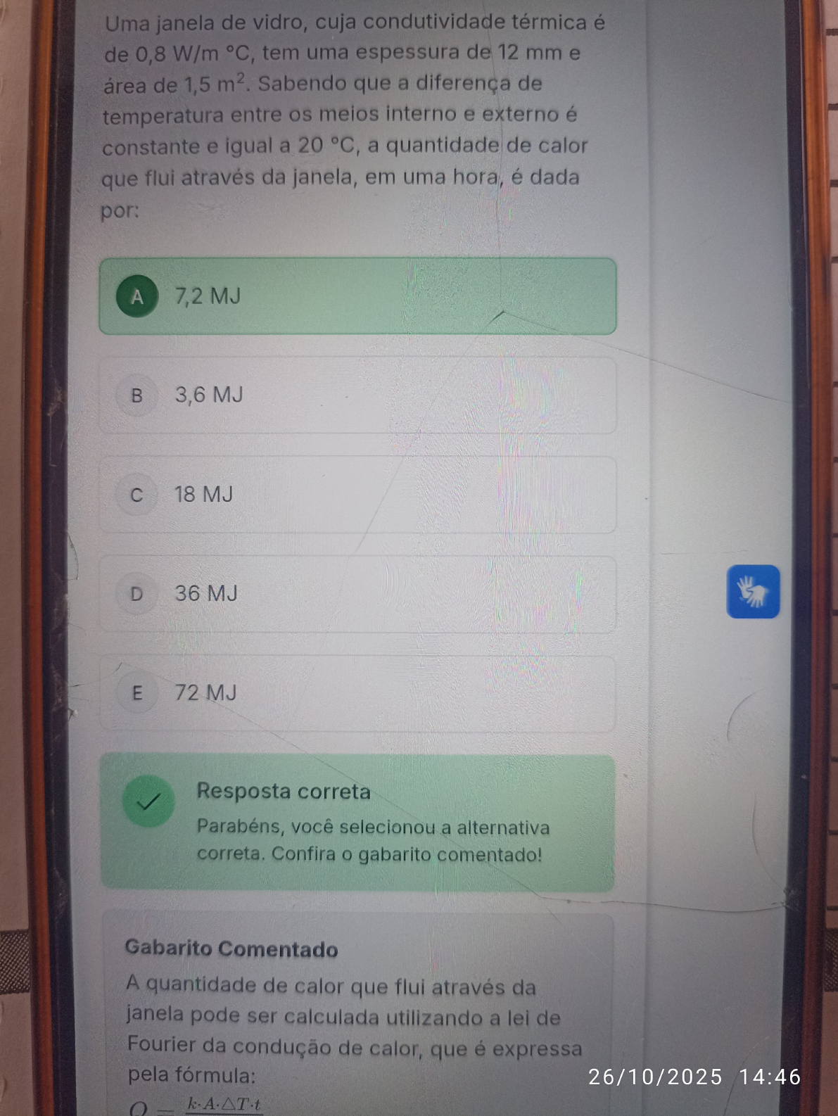Uma janela de vidro, cuja condutividade térmica é de 0,8 W/m °C, tem uma espessura de 12 mm e área de 1,5 m². Sabendo que a diferença de temperatura entre os meios interno e externo é constante e igual a 20 °C, a quantidade de calor que flui através da janela, em uma hora, é dada por: A 7,2 MJ B 3,6 MJ C 18 MJ D 36 MJ E 72 MJ Resposta correta Parabéns, você selecionou a alternativa correta. Confira gabarito comentado! Gabarito Comentado A quantidade de calor que flui através da janela pode ser calculada utilizando a lei de Fourier da condução de calor, que é expressa pela fórmula: 26/10/2025 14:46(UEFS 2017) Determinados aparelhos elétricos precisam ter seu funcionamento interrompido quando a temperatura atinge certo valor, chamada de Temperatura Crítica (TC). Para fazer esse controle, alguns aparelhos utilizam um dispositivo baseado na dilatação térmica desigual, sofrida por metais diferentes. Ele interrompe a corrente elétrica (i) no aparelho quando a temperatura atinge um valor igual a conforme mostram as figuras a seguir: FIGURA 1 FIGURA 2 T=T Metais Coeficientes de dilatação linear Aço 11 Ferro 12 Alumínio 24 Zinco 64 Dispositivo. 2017. Fonte: Fórum PiR2. Para que dispositivo funcione como nas figuras 1 e 2, considerando os valores dos coeficientes de dilatação linear da tabela, os metais A e B da lâmina bimetálica representada podem ser, respectivamente: A Aço e alumínio. 26/10/2025 1Considere as afirmativas a seguir: I. Calor é uma forma de energia que fica armazenada nos corpos e depende de sua temperatura. II. Quanto maior for a temperatura de um corpo, maior será o calor que ele possui. III. Quanto maior for calor específico de um corpo, maior será o calor necessário para aumentar sua temperatura. IV. O calor pode variar a temperatura de uma substância ou mudar seu estado de agregação. Sendo (V) as afirmativas verdadeiras e (F) as falsas, podemos dizer que: A F; F; III V; IV V B C D E Resposta correta Parabéns, você selecionou a alternativa 26/10/2025 14:4 correta. Confira gabarito comentado!7 Marcar para revisão As substâncias, tanto em estado líquido quanto em estado sólido, possuem uma característica intrínseca de se dilatar (na maioria dos casos) com aumento da temperatura. Para determinar quanto a substância se dilatará, é necessário conhecer seu coeficiente de dilatação térmica. Em líquidos, normalmente, esse coeficiente é fornecido em termos volumétricos. Já em sólidos, normalmente, esse coeficiente é fornecido em termos lineares. Imagine que um material possui coeficiente de dilatação volumétrico igual a 1,0 X 10⁻⁴ Isso significa que: material sofre uma variação percentual A em seu volume igual a 0,01% para cada 1 de variação de temperatura. O material sofre uma variação em seu B volume igual a 100 cm3 para cada 1 de variação de temperatura. O material sofre uma variação em seu C comprimento igual a 100 cm para cada 1 °C de variação de temperatura. 26/10/2025 14:46 O material sofre uma variação percentualDeseja-se encaixar um cilindro de aço com diâmetro de 80 cm em um orifício de 79,5 cm de diâmetro feito em uma placa de alumínio. Dados: Coeficiente de dilatação linear do aço = 1,2 X 10 - Coeficiente de dilatação do alumínio = 2,4 X 10- 5 A que temperatura devemos elevar esses dois elementos aproximadamente, sabendo que, inicialmente, ambos se encontram a 20 °C? A 550 B 410 °C C 430 D 530 °C E 620 °C Resposta correta Parabéns, você selecionou a 26/10/2025 correta. Confira gabarito comentado!9 Marcar para revisão Existem três formas de propagação de calor: radiação, convecção e condução. A forma de propagação por condução acontece por meio do contato de corpos com: A Sólidos e fluidos. B Apenas sólidos. C Apenas líquidos. D Apenas gases. E Apenas fluidos. Resposta correta Parabéns, você selecionou a alternativa correta. Confira gabarito comentado! Gabarito Comentado A alternativa correta é: Sólidos e fluidos. A condução é um dos métodos de propagação de calor que ocorre através do contato direto entre as partículas. Nesse 26/10/2025 14:47 processo, as partículas transferem energia