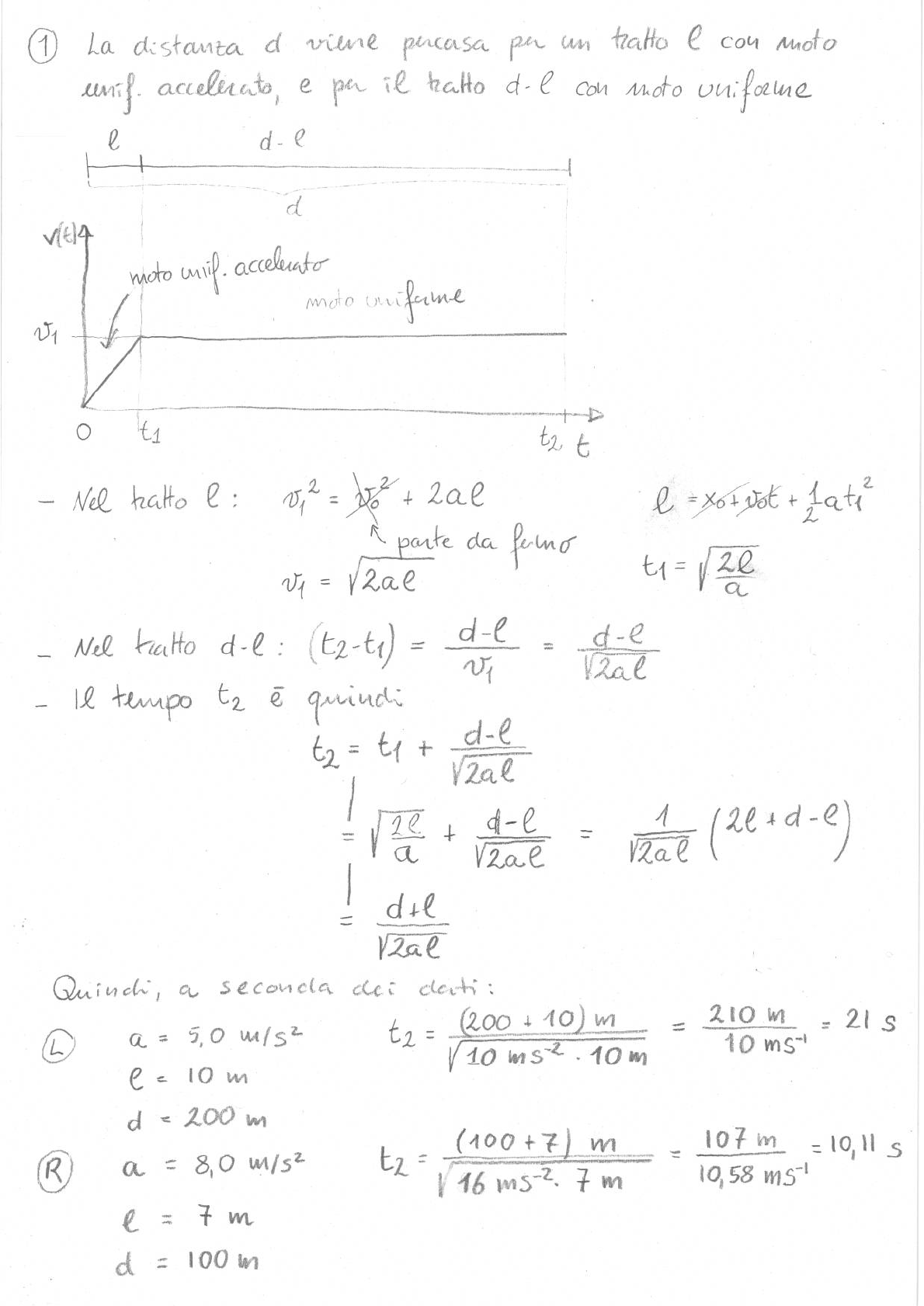 1 La distanta d viene percasa per an e moto unif. accelerato, e per il halto d-e con moto uniforme e d moto moto t1 t Nel = Do + 2al l = + 7 parte da femo = t1 = 2l a - Nel = = 12al d-e - Il tempo e quindi t2 = t1 + d-e / = 2l a + d-e = 12al 1 ( = d+l 12al Quinch, a seconda dei dati: a = 5,0 t2 = (200 + 10) = 210 = 21 S L V 10 10 m 10 e = 10 m d = 200 m (100 +7) m 107 m 11 R t2 " 11'01 S a = 8,0 = 16 7 m 10,58 ms⁻¹ e = 7 m d = 100 in2 Fo T T m2 me Le m,g e Sono bilanciate da ed Non queste non giocano nel moto quindi non le disegno a) a = Fo (applico il II principio sistema me b) T = m2a (applico il II principio a la stessa c) T = Fo + se T Quindi, a seconda L Fo = N a) a = 6,2 N = 2,605 ms-2 (1,4+0,98) to kg m, = 1,4 kg b) T = 0,98 2,605ms-2 = 2,55 N = 0,98 kg R Fo = 6,0 N a) a = 6,0 N = 2,727 ms-2 (1,2+1,0) kg m, = 1,2 T = 1,0 2,727 m = 2,73 N m2 = 1,0 kg 3 = v d a) Per il teorema - energia, Si ha La= = = 2 1 + forza é ab) = - d a seconda dei dati : L + m2 = 1260 kg v = 70 km/h = 19,44 ms⁻¹ d = 28 m L = - 2 1 Kg) (19,44 = - 238 KJ Fa = 238 KJ = 8,51 KN 28 m R m, + = 1260 kg = 60 = 16,67 ms⁻¹ d = 24 m L = - 2 1 kg) 2 = - 175 KJ Fa = + 175 KJ = 7,29 KN 24 m 4 F D d A = II 4 a = II d² 4 a) Ap = = 4 F A IT D² per il principio di Pascal, tale si trasmette, inalterata, a tulto il fluido (incluso quello che ago).b) Per v, applico il di noulli tza il punto I ed il punto II I II v a che esce A In PI = + Ap vedi NOTA ~ 0 0 VI A»a e VIA = owero VI = VI = D² hI= hI = h In II: Po mel momento in esce, il fluido tzova a (si fa un analogo ph il di VII = = h, =h = di assume quinch la NOTA *1 siassume VI ~ siha: + = + 2 1 + = = 2F = = PA = P 1 Quindi, a seconda de: dati : = 20p P (1- = P D4 24p P L = IT 4 F D² = 4 (8.10-3m) 2N = N = b) 2 = 8,92 m/s P R = 4 IT D² = 4 1,5 N 2 = 4 Pa b) = = 2.2,98.104 Pa = 7,73 m/s 103 kgm-3