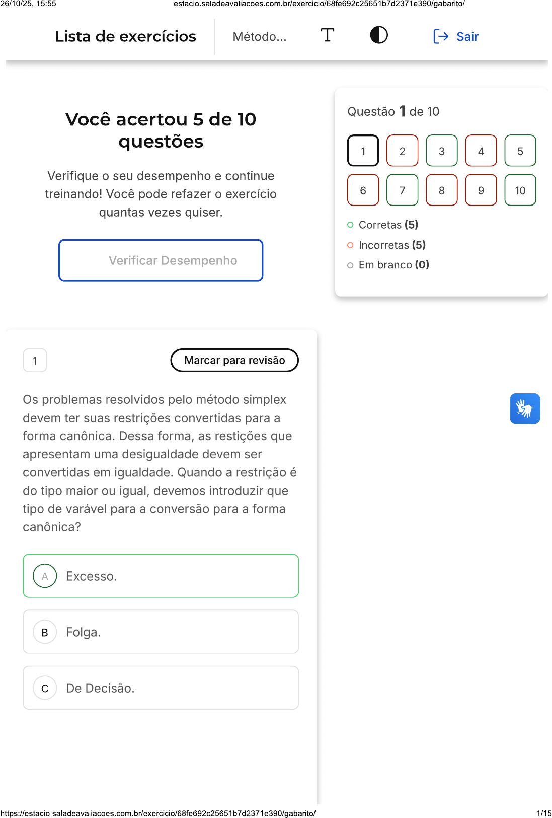 26/10/25, 15:55 Lista de exercícios Método... T Sair Questão 1 de 10 Você acertou 5 de 10 questões 1 2 3 4 5 Verifique seu desempenho e continue treinando! Você pode refazer exercício 6 7 8 9 10 quantas vezes quiser. Corretas (5) Incorretas (5) Verificar Desempenho Em branco 1 Marcar para revisão Os problemas resolvidos pelo método simplex devem ter suas restrições convertidas para a forma canônica. Dessa forma, as restições que apresentam uma desigualdade devem ser convertidas em igualdade. Quando a restrição é do tipo maior ou igual, devemos introduzir que tipo de varável para a conversão para a forma canônica? A Excesso. Folga. c De Decisão. 1/1526/10/25, 15:55 estacio.saladeavaliacoes.com.br/exercicio/68fe692c25651b7d2371e390/gabarito/ D De Ajuste. E Canônicas. Resposta correta Parabéns, você selecionou a alternativa correta. Confira gabarito comentado! Gabarito Comentado A resposta correta é: Excesso. Sempre que a restrição for de menor ou igual, ao converter para a form canônica devemos criar uma variável de folga, porém, se a restrição for de maior ou igual, devemos criar uma variável de excesso. 2 Marcar para revisão Em um problema de Programação Linear (PL), a dualidade estabelece uma relação entre problema primal e seu respectivo dual. Quando ambos possuem soluções ótimas finitas, existe uma conexão direta entre os valores da função objetivo de cada um. Qual a importância do Teorema da Fundamentalidade da Programação Linear para a prática? Permite garantir que um problema de A PL sempre terá solução. Permite determinar a solução ótima de B um problema de PL de forma analítica. 2/1526/10/25, 15:55 estacio.saladeavaliacoes.com.br/exercicio/68fe692c25651b7d2371e390/gabarito/ Permite determinar se um problema de c PL possui solução ótima finita. Permite determinar o valor ótimo da D função objetivo de um problema de PL. E Permite todas as alternativas acima. X Resposta incorreta Opa! A alternativa correta é a letra C. Confira gabarito comentado! Gabarito Comentado Teorema da Fundamentalidade da Programação Linear é uma ferramenta fundamental para a análise de problemas de PL, pois permite determinar se um problema possui solução ótima finita e, caso contrário, fornece informações sobre a inviabilidade do problema. 3 Marcar para revisão Um treinador necessita formar um time de nadadores para competir em uma prova olímpica de 400 metros medley. Os nadadores apresentam as seguintes médias de tempo em cada estilo: 3/1526/10/25, 15:55 estacio.saladeavaliacoes.com.br/exercicio/68fe692c25651b7d2371e390/gabarito/ Nadador Tempo (s) / 100m Livre Peito Borboleta Costas 1 54 54 51 53 2 51 57 52 52 3 50 53 54 56 4 56 54 55 53 treinador deseja designar os nadadores para os diferentes estilos de modo a obter menor tempo possível para completar medley. Considere que a variável de decisão do modelo matemático para este problema é xij, que recebe valor igual a "1" se decidirmos que o estilo "i" será alocado ao designado "j", sendo se decidirmos contrário, de tal forma: X₁₁= 1, se nado livre é alocado ao nadador 1; zero, caso contrário. X₁₂= 1, se o estilo peito é alocado ao nadador 1; zero, caso contrário. X₁₃ =1, se estilo borboleta é alocado ao nadador 1; zero, caso contrário. se estilo costas é alocado ao nadador 1; zero, caso contrário. X₂₁= 1, se nado livre é alocado ao nadador 2; zero, caso contrário. X₂₂= 1, se o estilo peito é alocado ao nadador 2; zero, caso contrário. X₂₃= 1, se o estilo borboleta é alocado ao nadador 2; zero, caso contrário. 1, se estilo costas é alocado ao nadador 2; zero, caso contrário. 1, se nado livre é alocado ao nadador 3; zero, caso contrário. X₃₂= 1, se estilo peito é alocado ao nadador 3; zero, caso contrário 1, se estilo borboleta é alocado ao nadador 3; zero, caso contrário. 1, se estilo costas é alocado ao nadador 3; zero, caso contrário. X₄₁= 1, se nado livre é alocado ao nadador 4; zero, caso contrário. 4/1526/10/25, 15:55 X₄₂= 1, se estilo peito é alocado ao nadador 4; zero, caso contrário. 1, se estilo borboleta é alocado ao nadador 4; zero, caso contrário. X₄₄= 1, se estilo costas é alocado ao nadador 4; zero, caso contrário. Assim, na configuração da equipe que minimiza tempo total para completar medley, é correto afirmar que: nadador 2 é alocado para estilo A borboleta. nadador 2 é alocado para o nado livre. nadador 2 é alocado para estilo c costas. nadador 2 é alocado para estilo D peito. nadador 2 não é alocado para E nenhum estilo. Resposta correta Parabéns, você selecionou a alternativa correta. Confira o gabarito comentado! Gabarito Comentado A resposta certa é: nadador 2 é alocado para o estilo costas. 5/1526/10/25, 15:55 estacio.saladeavaliacoes.com.br/exercicio/68fe692c25651b7d2371e390/gabarito/ 4 Marcar para revisão Teorema da Fundamentalidade da Programação Linear estabelece propriedades essenciais sobre a existência e natureza das soluções ótimas em problemas de Programação Linear (PL). Se uma solução ótima finita existir, certas condições devem ser sempre verificadas, garantindo que problema tenha pelo menos uma solução viável que otimiza a função objetivo. Qual a relação entre Teorema da Fundamentalidade da Programação Linear e Teorema da Dualidade? São teoremas completamente A independentes. Teorema da Dualidade é um B corolário do Teorema da Fundamentalidade. Teorema da é um c corolário do Teorema da Dualidade. Ambos os teoremas são aplicados D apenas em problemas de PL com variáveis inteiras. Ambos os teoremas são aplicados E apenas em problemas de PL com funções objetivo lineares. X Resposta incorreta Opa! A alternativa correta é a letra B. Confira gabarito comentado! 6/1526/10/25, 15:55 estacio.saladeavaliacoes.com.br/exercicio/68fe692c25651b7d2371e390/gabarito/ Gabarito Comentado Teorema da Dualidade é um corolário do Teorema da Funda