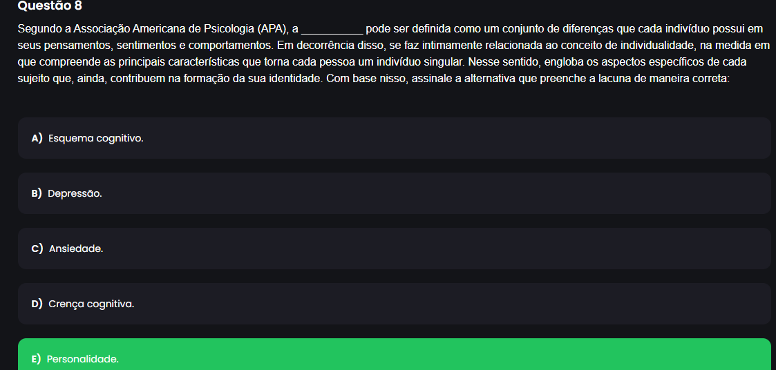 Questão 8 Segundo a Associação Americana de Psicologia (APA), a pode ser definida como um conjunto de diferenças que cada indivíduo possui em seus pensamentos, sentimentos e comportamentos. Em decorrência disso, se faz intimamente relacionada ao conceito de individualidade, na medida em que compreende as principais características que torna cada pessoa um indivíduo singular. Nesse sentido, engloba os aspectos específicos de cada sujeito que, ainda, contribuem na formação da sua identidade. Com base nisso, assinale a alternativa que preenche a lacuna de maneira correta: A) Esquema cognitivo. B) Depressão. c) Ansiedade. D) Crença cognitiva. E) Personalidade.