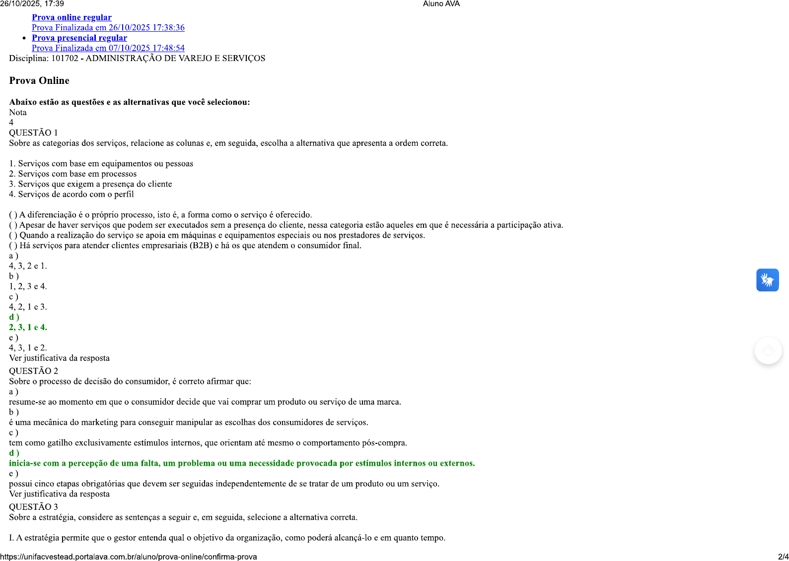 26/10/2025, 17:39 Aluno AVA Prova online regular Prova Finalizada em 26/10/2025 17:38:36 Prova presencial regular Prova Finalizada em 07/10/2025 17:48:54 Disciplina: 101702 ADMINISTRAÇÃO DE VAREJO E SERVIÇOS Prova Online Abaixo estão as questões e as alternativas que você selecionou: Nota 4 QUESTÃO 1 Sobre as categorias dos serviços, relacione as colunas e, em seguida, escolha a alternativa que apresenta a ordem correta. 1. Serviços com base em equipamentos ou pessoas 2. Serviços com base em processos 3. Serviços que exigem a presença do cliente 4. Serviços de acordo com o perfil () A diferenciação é o próprio processo, isto é, a forma como o serviço é oferecido. () Apesar de haver serviços que podem ser executados sem a presença do cliente, nessa categoria estão aqueles em que é necessária a participação ativa. () Quando a realização do serviço se apoia em máquinas e equipamentos especiais ou nos prestadores de serviços. () Há serviços para atender clientes empresariais (B2B) e há os que atendem o consumidor final. a) b) c) 4, 2, 1 e 3. d) 2,3,1e4. e) 4, 3, 1 e 2. Ver justificativa da resposta QUESTÃO 2 Sobre o processo de decisão do consumidor, é correto afirmar que: a) resume-se ao momento em que o consumidor decide que vai comprar um produto ou serviço de uma marca. b) é uma mecânica do marketing para conseguir manipular as escolhas dos consumidores de serviços. c) tem como gatilho exclusivamente estímulos internos, que orientam até mesmo o comportamento pós-compra. d) inicia-se com a percepção de uma falta, um problema ou uma necessidade provocada por estímulos internos ou externos. e) possui cinco etapas obrigatórias que devem ser seguidas independentemente de se tratar de um produto ou um serviço. Ver justificativa da resposta QUESTÃO 3 Sobre a estratégia, considere as sentenças a seguir e, em seguida, selecione a alternativa correta. I. A estratégia permite que o gestor entenda qual o objetivo da organização, como poderá alcançá-lo e em quanto tempo. 2/426/10/2025, 17:39 Aluno AVA II. Com a guerra da concorrência, a estratégia permite conhecer as suas competências e capacidades, explorar seus diferenciais de acordo com o mercado e buscar uma vantagem competitiva. III. A estratégia pode conter etapas como arquitetura, planejamento e gestão estratégica, que visam otimizar os processos e resultados organizacionais. IV. A estratégia combina elementos tanto do mercado como da realidade e do momento da empresa para, assim, desenvolver o seu plano de ações orientado pela sua visão organizacional. a) Todas as afirmativas estão corretas. b) Somente a afirmativa IV está correta. c) As afirmativas II, III e IV estão corretas. d) Somente a afirmativa I está correta. e) As afirmativas II e IV estão corretas. Ver justificativa da resposta QUESTÃO 4 Relacione as colunas e, em seguida, selecione a alternativa com a sequência correta. 1. Pessoas 2. Processos 3. Perfil 4. Produtividade () Também conhecido como physical evidence. () Fator que envolve aspectos humanos como a contratação e o treinamento das equipes. () Está associada à qualidade e ao resultado do serviço. () Precisam ser claros, simples e passivos de serem replicados por diferentes pessoas da mesma maneira. a) b) 3, 4, 1 e 2. 3,1,4e2. d) Ver justificativa da resposta QUESTÃO 5 Quando falamos de e-commerce, está correto afirmar que: a) apesar de estar na internet, possui horários de funcionamento restritos. sua aplicação se restringe à divulgação de conteúdo. é como uma loja virtual da empresa. d) são as lojas físicas do varejo de eletrônicos. e) pode ser considerado um shopping virtual da empresa. Ver justificativa da resposta QUESTÃO 6 3/426/10/2025, 17:39 Aluno AVA Para desenvolver um atendimento bem-sucedido, recomenda-se atenção a alguns pré-requisitos. Selecione a alternativa que os apresenta. a) Conhecer, ouvir, falar e perceber. b) Conhecer, ouvir, contactar e vender. c) Vender, ouvir, persuadir e conhecer. d) Contactar, perceber, ouvir e falar. e) Conhecer, vender, falar e persuadir. Ver justificativa da resposta QUESTÃO 7 Complete a sentença a seguir com a alternativa correta. seria o processo de formalização da tomada de decisão que auxilia na identificação da rota, na delimitação do que a empresa precisará fazer para alcançar o objetivo, a visão da empresa. a) Macroeconomia b) Arquitetura estratégica Planejamento estratégico d) Cenários econômicos e) Gestão estratégica Ver justificativa da resposta QUESTÃO 8 Sobre os programas de fidelidade, leia as afirmativas a seguir e, em seguida, selecione a alternativa correta. I. Também podem ser conhecidos como programas de vantagem ou de frequência. II. Possuem mecânicas que flexibilizam sua adoção em diversos segmentos. III. Podem funcionar com pagamentos mensais ou anuais para que o consumidor tenha acesso a benefícios adicionais. IV. Não conseguem gerar um banco de dados de consumidores qualificado, que permita identificar o perfil e o comportamento de compra do público-alvo. a) Somente a afirmativa IV está correta. b) Todas as afirmativas estão corretas. c) Somente as afirmativas I e IV estão corretas. d) Somente a afirmativa II está correta. e) Somente as afirmativas I, II e III estão corretas. Ver justificativa da resposta 4/4