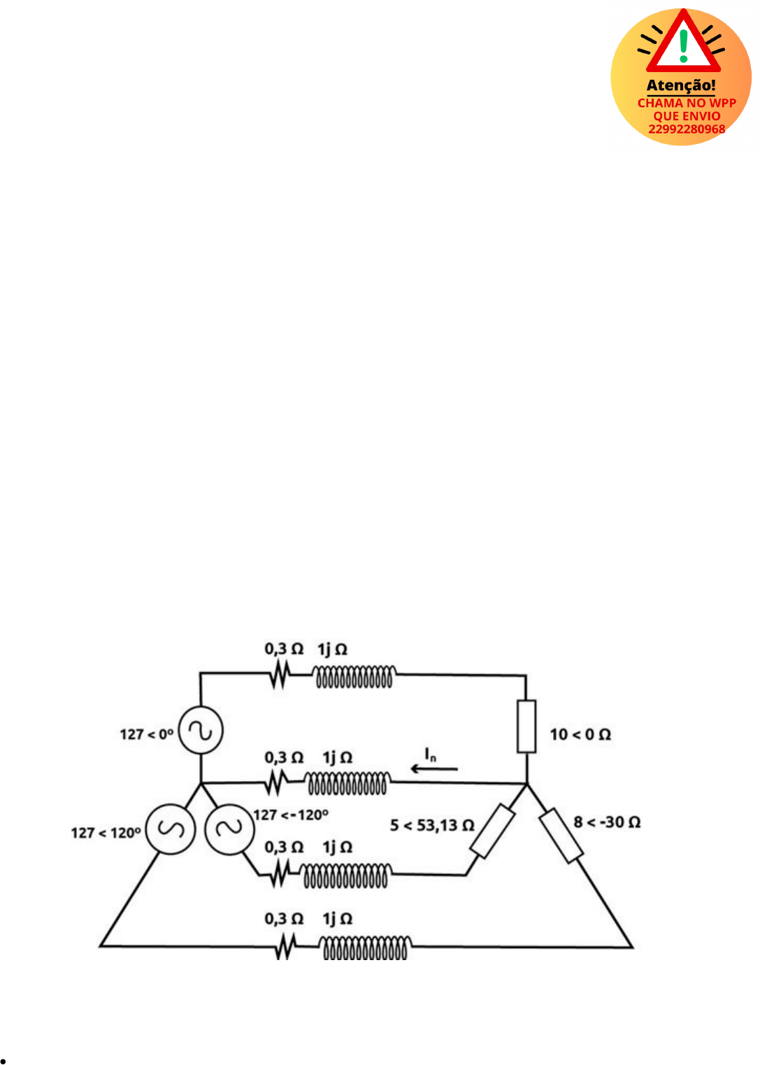 Enunciado da Avaliação 2 “A entrega da atividade deve ser realizada através do item Entrega da Atividade 2 [AVA 2], conforme o prazo estipulado em calendário acadêmico.” Atividade 2 Cálculo de circuito elétrico trifásico desequilibrado. Circuitos elétricos trifásicos são a base para modelagem de diversas aplicações na engenharia elétrica, como geração e transmissão de energia. É fundamental, em qualquer das aplicações, que o estudante possa identificar e calcular corretamente os parâmetros. Você está atuando como engenheiro eletricista em uma renomada empresa da área de distribuição de energia. São observados muitos problemas devidos ao desbalanço da carga. Cargas trifásicas desequilibradas são bastante comuns em sistemas de distribuição de energia elétrica, considerando sua capilaridade e alcance. Nesse contexto, considere que a modelagem de um ramo de distribuição levou ao circuito a seguir. Pede-se para calcular a corrente de neutro do circuito, conforme indicado. Procedimentos para a elaboração do TD: Para essa elaboração, será necessário calcular a corrente em cada uma das impedâncias e, na sequência, realizar sua soma, o que levará à corrente de neutro. A resposta deve ser apresentada em um arquivo doc. ou PDF, contendo o desenvolvimento, além da capa com o nome completo, matrícula e período. Referências: BARRETO, G. et al. Circuitos de corrente alternada: fundamentos e prática. São Paulo: Oficina de Textos. 2012. ISBN: 9788579750441. Biblioteca virtual Pearson. NILSSON, J. W.; RIEDEL, S. A. Circuitos elétricos. São Paulo: Pearson, 2016. ISBN: 9788543004785. Biblioteca Pearson. . Orientações Gerais para a realização da atividade: A pontuação máxima desta atividade avaliativa é de 100 pontos (100%); Seu desempenho nesta avaliação compõe a nota final das Avaliações Online (A1); O Trabalho que não for postado/enviado até o prazo terá nota zero, assim como aqueles que forem apenas salvos e não enviados para correção na data estipulada no calendário da disciplina; O Trabalho deverá ser postado somente no local específico para essa ação no Ambiente Virtual de Aprendizagem.