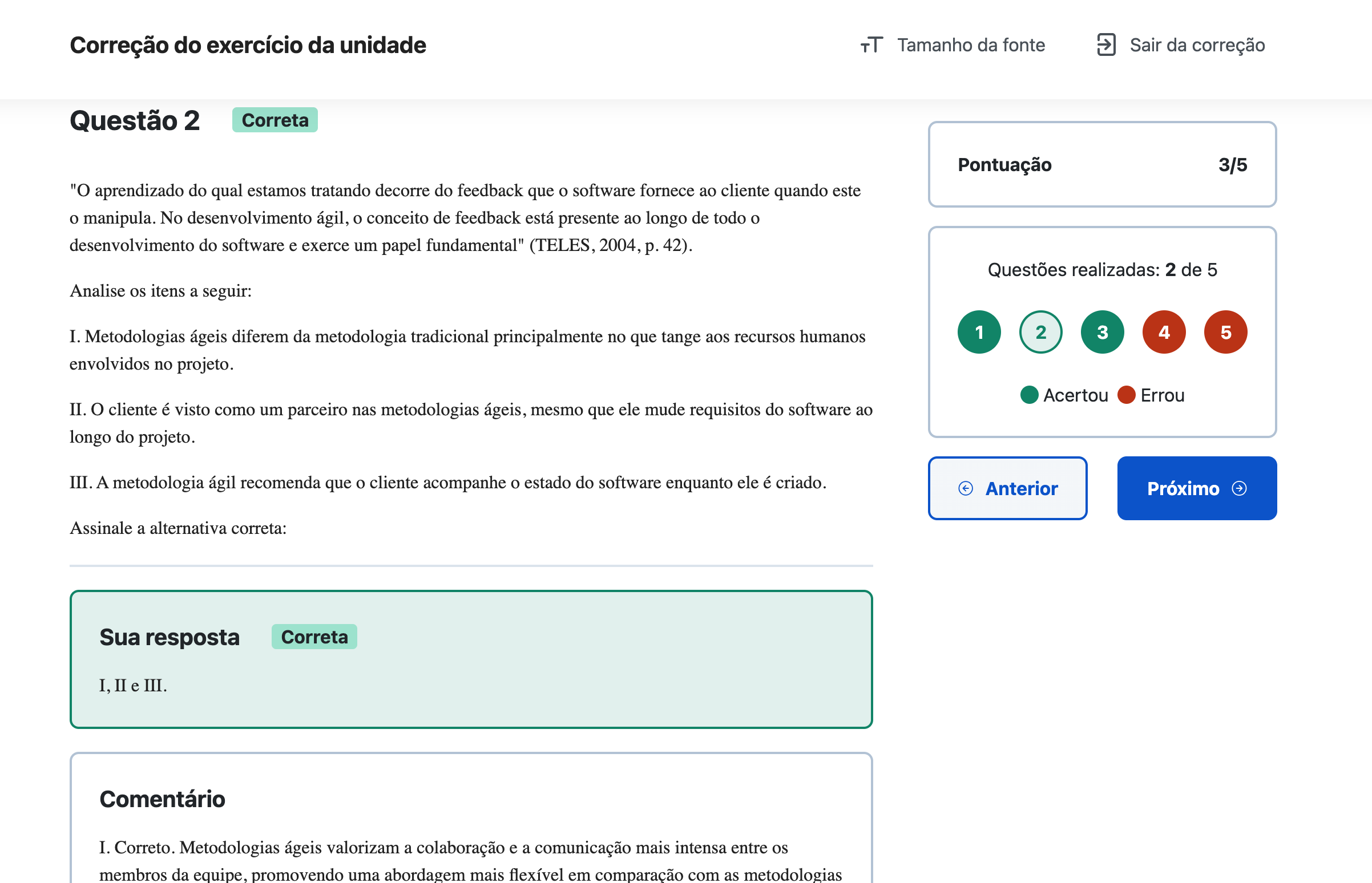 Correção do exercício da unidade TT Tamanho da fonte Sair da correção Questão 2 Correta Pontuação 3/5 "O aprendizado do qual estamos tratando decorre do feedback que o software fornece ao cliente quando este o manipula. No desenvolvimento ágil, o conceito de feedback está presente ao longo de todo o desenvolvimento do software e exerce um papel fundamental" (TELES, 2004, p. 42). Questões realizadas: 2 de 5 Analise os itens a seguir: I. Metodologias ágeis diferem da metodologia tradicional principalmente no que tange aos recursos humanos 1 2 3 4 5 envolvidos no projeto. Acertou Errou II. cliente é visto como um parceiro nas metodologias ágeis, mesmo que ele mude requisitos do software ao longo do projeto. III. A metodologia ágil recomenda que o cliente acompanhe o estado do software enquanto ele é criado. Anterior Próximo Assinale a alternativa correta: Sua resposta Correta I, II e III. Comentário I. Correto. Metodologias ágeis valorizam a colaboração e a comunicação mais intensa entre os membros da equipe, promovendo uma abordagem mais flexível em comparação com as metodologias