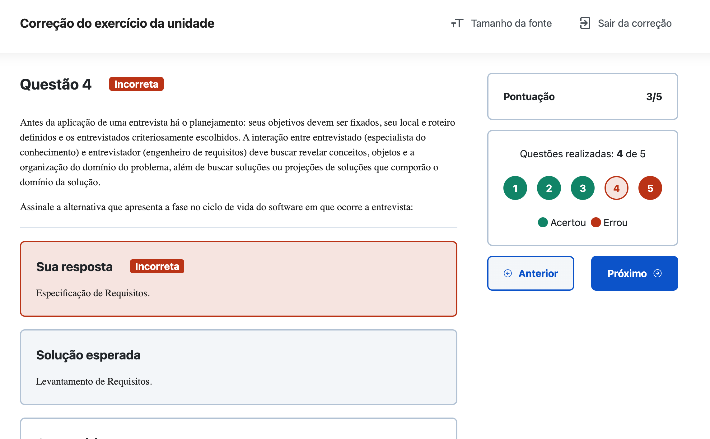 Correção do exercício da unidade Tamanho da fonte Sair da correção Questão 4 Incorreta Pontuação 3/5 Antes da aplicação de uma entrevista há o planejamento: seus objetivos devem ser fixados, seu local e roteiro definidos e os entrevistados criteriosamente escolhidos. A interação entre entrevistado (especialista do conhecimento) e entrevistador (engenheiro de requisitos) deve buscar revelar conceitos, objetos e a Questões realizadas: 4 de 5 organização do domínio do problema, além de buscar soluções ou projeções de soluções que comporão o domínio da solução. 1 2 3 4 5 Assinale a alternativa que apresenta a fase no ciclo de vida do software em que ocorre a entrevista: Acertou Errou Sua resposta Incorreta Anterior Próximo Especificação de Requisitos. Solução esperada Levantamento de Requisitos.