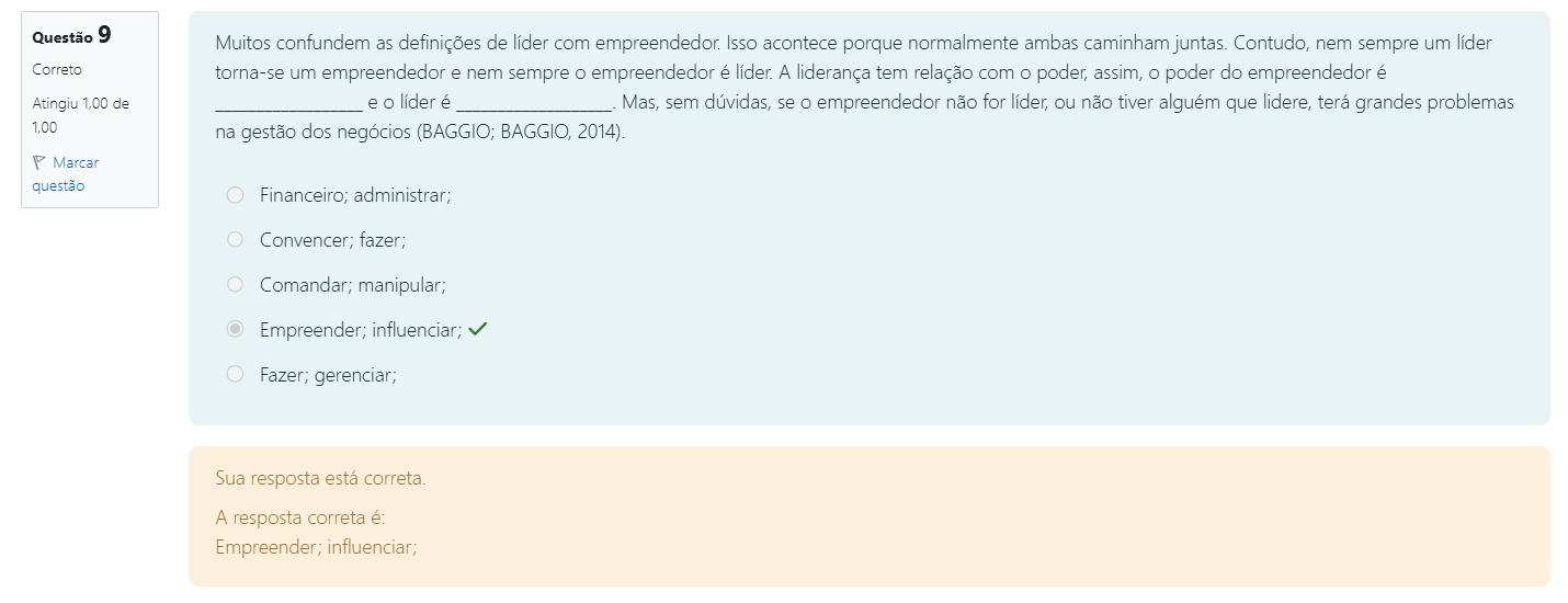 Questão 9 Muitos confundem as definições de com empreendedor. Isso acontece porque normalmente ambas caminham juntas. Contudo, nem sempre um líder Correto torna-se um empreendedor e nem sempre empreendedor é líder. A liderança tem relação com poder, assim, poder do empreendedor é Atingiu 1,00 de Mas, sem dúvidas, se empreendedor não for ou não tiver alguém que lidere, terá grandes problemas 1,00 na gestão dos negócios (BAGGIO; BAGGIO, 2014). Marcar questão Financeiro; administrar; Convencer; fazer; Comandar; manipular; Empreender; influenciar; Fazer; gerenciar; Sua resposta está correta. A resposta correta é: Empreender; influenciar;