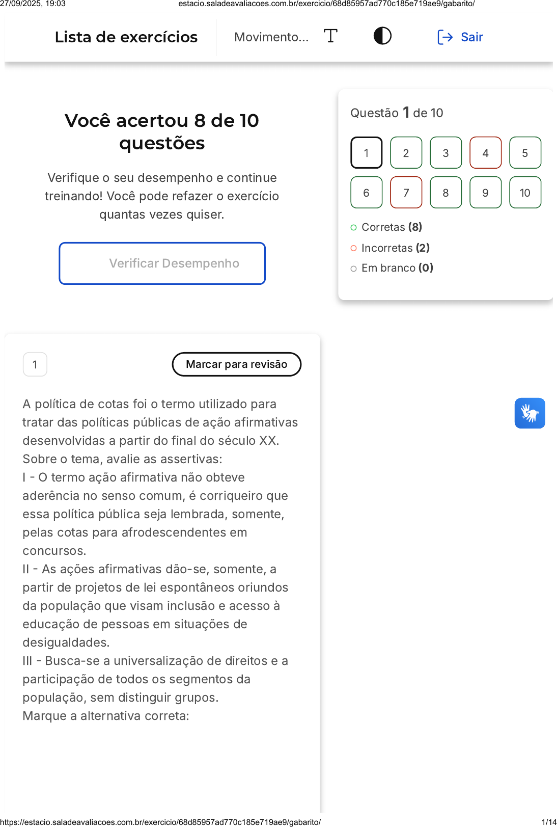 Você acertou 8 de 10 questões Verifique o seu desempenho e continue treinando! Você pode refazer o exercício quantas vezes quiser. Verificar Desempenho 1 Marcar para revisão A política de cotas foi o termo utilizado para tratar das políticas públicas de ação afirmativas desenvolvidas a partir do final do século XX. Sobre o tema, avalie as assertivas: I - O termo ação afirmativa não obteve aderência no senso comum, é corriqueiro que essa política pública seja lembrada, somente, pelas cotas para afrodescendentes em concursos. II - As ações afirmativas dão-se, somente, a partir de projetos de lei espontâneos oriundos da população que visam inclusão e acesso à educação de pessoas em situações de desigualdades. III - Busca-se a universalização de direitos e a participação de todos os segmentos da população, sem distinguir grupos. Marque a alternativa correta: Questão 1 de 10 Corretas (8) Incorretas (2) Em branco (0) 1 2 3 4 5 6 7 8 9 10 Lista de exercícios Movimento… Sair 27/09/2025, 19:03 estacio.saladeavaliacoes.com.br/exercicio/68d85957ad770c185e719ae9/gabarito/ https://estacio.saladeavaliacoes.com.br/exercicio/68d85957ad770c185e719ae9/gabarito/ 1/14 A B C D E I II III I e II I e III Resposta correta Parabéns, você selecionou a alternativa correta. Confira o gabarito comentado! Gabarito Comentado As ações afirmativas tiveram como resultado práticas para o reconhecimento sócio-cultural, promoção da igualdade e universalização de direitos civis, políticos e sociais, uma política de universalização de direitos. As organizações ligadas ao movimento negro investiram em iniciativas voltadas para a educação, principalmente na linha do acesso ao ensino superior e na formação de educadores. 2 Marcar para revisão Alguns autores discutiram e foram importantes para pensar a questão do racismo no Brasil. Um 27/09/2025, 19:03 estacio.saladeavaliacoes.com.br/exercicio/68d85957ad770c185e719ae9/gabarito/ https://estacio.saladeavaliacoes.com.br/exercicio/68d85957ad770c185e719ae9/gabarito/ 2/14 A B C D E bom exemplo é Gilberto Freyre que defendia: Uma democracia racial Uma guerra infinita. Uma solução que foi organizada pela religião. Ser o racismo um tema superado em nossa história Uma estrutura hierarquizada, mas também afetiva. Resposta correta Parabéns, você selecionou a alternativa correta. Confira o gabarito comentado! Gabarito Comentado Freyre não cria o conceito de democracia racial, e muito se discute o equívoco de seu trabalho ao chamar atenção das hierarquias (Casa Grande e Senzala). No entanto, sua obra fortalece a forma como a resistência e a proximidade ressignificaram as relações raciais. 3 Marcar para revisão A força dos movimentos de São Paulo mostraram ser um ponto importante de 27/09/2025, 19:03 estacio.saladeavaliacoes.com.br/exercicio/68d85957ad770c185e719ae9/gabarito/ https://estacio.saladeavaliacoes.com.br/exercicio/68d85957ad770c185e719ae9/gabarito/ 3/14 A B C D E irradiação nacional. Ali foram organizadas ações de uma imprensa negra que é entendida como vital no nascedouro de uma consciência da condição de descendente de ex- escravizados. Alguns dos veículos de comunicação estão descritos abaixo: I - Clarim d'Alvorada. II - A voz da raça. III - Jornal do Brasil. Os veículos que tem relação com a Frente Negra Brasileira são: I, apenas. II, apenas. III, apenas. I e II, apenas. II e III, apenas. Resposta correta Parabéns, você selecionou a alternativa correta. Confira o gabarito comentado! Gabarito Comentado O Clarim e A voz da Raça, impressos e radiofónicos foram importantes veículos de comunicação da Frente Negra Brasileira. Já o Jornal do Brasil, fundado pela condessa Pereira Carneiro, tem um papel destacado 27/09/2025, 19:03 estacio.saladeavaliacoes.com.br/exercicio/68d85957ad770c185e719ae9/gabarito/ https://estacio.saladeavaliacoes.com.br/exercicio/68d85957ad770c185e719ae9/gabarito/ 4/14 A B C D E em bandeiras, mas nunca foi um jornal vinculado a um movimento negro. 4 Marcar para revisão Art. 1° - Fica fundada nesta cidade de São Paulo, para se irradiar por todo o Brasil, a Frente Negra Brasileira, união política e social da Gente Negra Nacional, para a afirmação dos direitos históricos da mesma, em virtude da sua atividade material e moral no passado e para reivindicação de seus direitos sociais e políticos, atuais, na Comunhão Brasileira. (Estatuto da Frente Negra Brasileira. Diário Oficial do Estado de São Paulo, 4 nov. 1931.) Sobre a Frente Negra Brasileira, assinale a alternativa correta. Tinha um apelo exclusivamente regional no estado de São Paulo Tinha um caráter nacional com filiais nos estados Foi um movimento com caráter rural Seu principal foco era a educação universitária. Foi um importante jornal de cultura black. 27/09/2025, 19:03 estacio.saladeavaliacoes.com.br/exercicio/68d85957ad770c185e719ae9/gabarito/ https://estacio.saladeavaliacoes.com.br/exercicio/68d85957ad770c185e719ae9/gabarito/ 5/14 A B Resposta incorreta Opa! A alternativa correta é a letra D. Confira o gabarito comentado! Gabarito Comentado Em 1931 foi criada a Frente Negra Brasileira (FNB), com forte caráter nacionalista e com filiais em outros estados. A FNB tinha um caráter urbano e a criação do Departamento de Instrução e cultura para os membros demarcava seu principal intento: solucionar os problemas da população negra por meio da educação 5 Marcar para revisão As mobilizações sociais assumem novas características conforme o contexto em que vivemos. Sobre novos movimentos sociais e mundo contemporâneo, analise as assertivas: I- Os novos movimentos sociais são diferentes das ações coletivas de antes por politizarem a esfera privada e tornarem públicas as problemáticas das minorias sociais. II- Envolvem negros e indígenas exclusivamente, pois é onde cabe o debate. III- Realizam pressão política, movimentos culturais, rediscutem para dentro e fora sua co