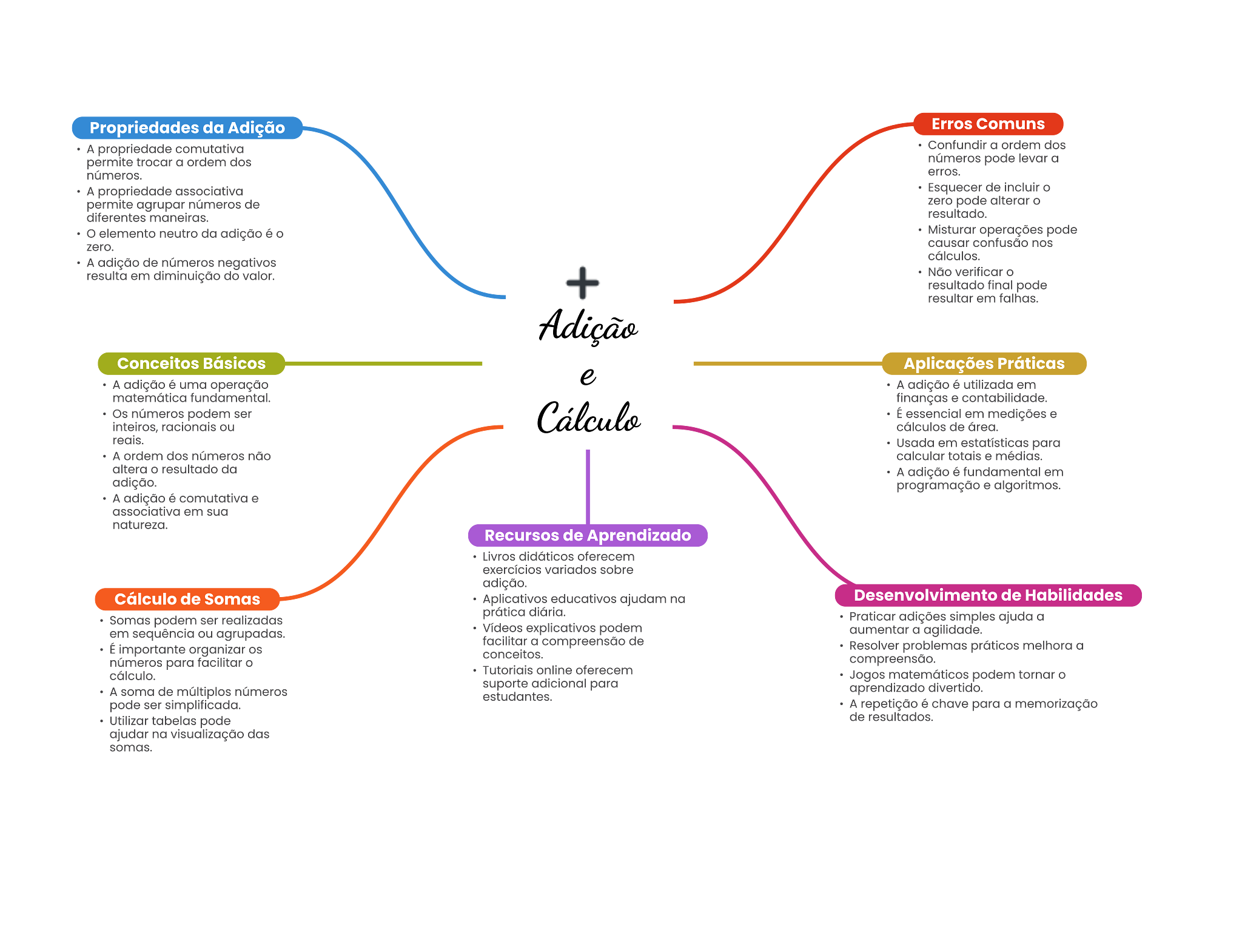 Propriedades da Adição Erros Comuns A propriedade comutativa Confundir a ordem dos permite trocor a ordern dos números pode levar a números. erros. A propriedade associativa Esquecer de incluir permite agrupar números de zero pode alterar o diferentes resultado. elemento neutro da adição Misturar operações pode zero. causar nos cálculos. A adição de números negativos resulta em do valor. Não verificar resultado final pode resultar em Conceitos Básicos Aplicações Práticas A adição é uma operação A adição utilizada em fundamental. finanças contabilidade. Os números podem essencial em medições e inteiros, racionale ou cálculos de área. Usada em estatísticas para A ordem dos números não altera o resultado da A adição é fundamental em adição. programação A adição é comutativa associativa em sua Recursos de Aprendizado Livros oferecem exercícios sobre adição. Cálculo de Somas Aplicativos educativos ajudam na Desenvolvimento de Habilidades podem ser diária. Praticar adições ajuda a em sequência ou agrupadas. Videos explicativos podem a É importante organizar os a compreensão de Resolver problemas práticos melhora números para facilitor Tutoriale online oferecem podem tornar A de números suporte adicional para aprendizado divertido. estudantes. pode ser A repetição chave para a memortzação Utilizar tabelas pode de resultados. ajudar na visualização das somas.