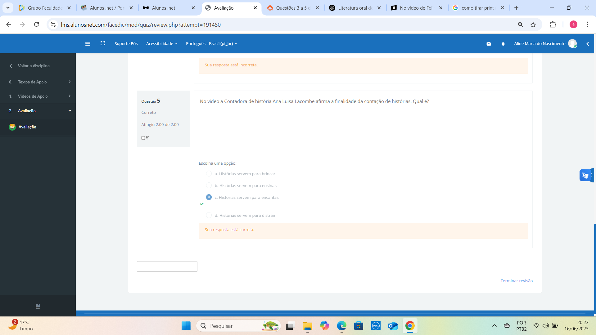 Grupo Faculdade Alunos .net / Por Alunos .net Avaliação Questões 3 a 5 Literatura oral No vídeo de Feli como tirar print + X a : Suporte Pós Acessibilidade Português Brasil (pt_br) Aline Maria do Nascimento 1. Vídeos de Apoio > Questão 5 No vídeo a Contadora de história Ana Luisa Lacombe afirma a finalidade da contação de histórias. Qual é? 2. Avaliação Correto Avaliação Atingiu 2,00 de 2,00 P Escolha uma opção: a. Histórias servem para brincar. b. Histórias servem para ensinar. C. Histórias servem para encantar. d. Histórias servem para distrair. Sua resposta está correta. Terminar revisão 2 17°C POR 20:23 Limpo Pesquisar PTB2 16/06/2025