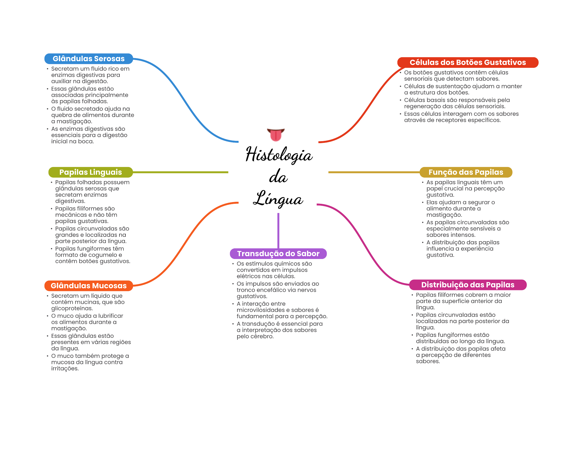 Glândulas Serosas Células dos Botões Gustativos Secretam um fluido rico em enzimas para botões gustativos na digestão. que detectam sabores. Essas estão de sustentação ajudam a manter associadas principaimente a estrutura dos botões. folhadas. fluido secretado ajuda na regeneração quebra de durante com sabores mastigação. através de receptores específicos. As enzimos digestivas para a na boca. Papilas Linguais Função das Papilas Papilas folhadas possuem As um que papel crucial na percepção gustativa. ajudam a segurar Papilas alimento durante a mecânicas não As são Papilas são a na sabores intensos. parte posterior da lingua. A distribuição dos fungiformes têm influencia a experiência formato de Transdução do Sabor gustativa. contêm gustativos. Os químicos são convertidos em elétricos nas Glândulas Mucosas Os são enviados ao Distribuição das Papilas tronco via nervos Secretam um líquido que gustativos. cobrem a que A entre parte da superficie anterior da . sabores lingua. muco ajuda a lubrificar fundamental para a percepção. circunvaladas estão alimentos a A essencial para na parts posterior da a dos lingua. Essas pelo Papilas estão presentes em regiões longo da lingua. da lingua. A distribuição dos papilas afeta muco a a percepção de diferentes mucosa da lingua contra