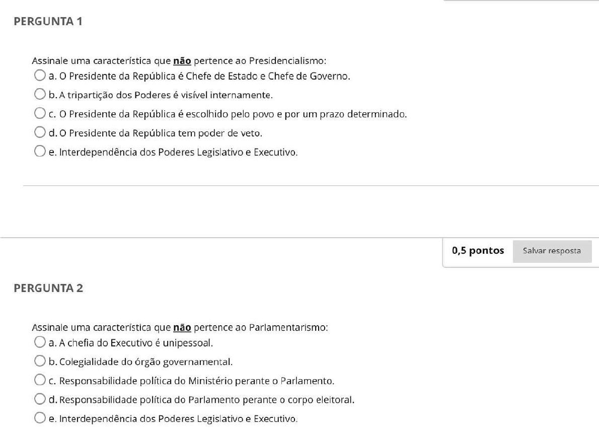 PERGUNTA 1 Assinale uma característica que não pertence ao Presidencialismo: a. Presidente da República é Chefe de Estado e Chefe de Governo. b.A tripartição dos Poderes é visível internamente. C. O Presidente da República é escolhido pelo povo e por um prazo determinado. Presidente da República tem poder de veto. e. Interdependência dos Poderes Legislativo e Executivo. 0,5 pontos Salvar resposta PERGUNTA 2 Assinale uma característica que não pertence ao Parlamentarismo: a. A chefia do Executivo é unipessoal. b. Colegialidade do órgão governamental. C. Responsabilidade política do Ministério perante 0 Parlamento. d. Responsabilidade política do Parlamento perante corpo eleitoral. e. Interdependência dos Poderes Legislativo e Executivo.0,5 pontos Salvar resposta PERGUNTA 3 Assinale uma característica que não pertence ao Semipresidencialismo: a. chefe de Estado (presidente) é eleito por votação popular, de forma direta ou indireta, com um mandato determinado. b.o chefe de Estado compartilha 0 Poder Executivo com primeiro-ministro em uma estrutura dupla de autoridade. C. presidente da República é chefe de Estado e chefe de Governo. d. Embora independente do Parlamento, presidente não tem direito de governar sozinho ou diretamente, e, portanto, sua vontade deve ser canalizada e processada pelo seu governo. e. 0 primeiro-ministro e seu gabinete independem do presidente, na medida em este depende do Parlamento. 0,5 pontos Salvar resposta PERGUNTA 4 É dotada de soberania: a. A União. b.A República Federativa do Brasil. C. Os Estados. Distrito Federal. e. Os municípios.PERGUNTA 5 Assinale a alternativa que não corresponde a uma característica dos Estados membros: a. Se auto-organizam pela sua Constituição Estadual e pelas leis produzidas pela sua Assembleia Legislativa. b. A eleição para governador acontece em 1° turno, no primeiro domingo de outubro, e, em 2° turno, se houver, no último domingo de outubro. C. mandato de governador é de 4 anos. d. Poder Legislativo é exercido pelos deputados estaduais. e. Tem competência para legislarem sobre assuntos de interesse local.PERGUNTA 6 Não é uma característica dos senadores: a. Mandato de 8 anos. b. Renovação total em cada eleição. C. Idade mínima de 35 anos. d. Serem eleitos com 2 suplentes cada. e. Serem em número de 3 para cada estado e 3 para o Distrito Federal. 0,5 pontos Salvar resposta PERGUNTA 7 Não é uma característica dos deputados federais: a. Idade mínima de 21 anos. b. Mandato de 4 anos. C. Possibilidade de renovação total da Câmara dos Deputados. d.A representação dos Estados na Câmara dos Deputados ser proporcional à população. e. Ser eleito com 2 suplentes cada.0,5 pontos Salvar resposta PERGUNTA 8 Sobre presidente da República, não podemos afirmar que: a. Exerce as funções de chefe de Estado e chefe de Governo. b. primeiro turno de sua eleição ocorre no 1° domingo de outubro e 2° turno, se houver, no último domingo de outubro. C. A eleição do presidente da República importará a do vice. d. Será considerado eleito presidente candidato que, registrado por partido político, obtiver a maioria absoluta de votos, computados os em branco e os nulos. e. Se nenhum candidato alcançar maioria absoluta na primeira votação, far-se-á nova eleição em até 20 dias após a proclamação do resultado, concorrendo os dois candidatos mais votados e considerando-se eleito aquele que obtiver a maioria dos votos válidos. 0,5 pontos Salvar resposta PERGUNTA 9 Sobre Poder Judiciário, não podemos afirmar que: a. ingresso, no cargo de juiz substituto, se dá por concurso de provas e títulos. b.É necessário ser bacharel em Direito para ingressar no Judiciário como juiz substituto. C. São necessários 3 anos de atividade jurídica para ingressar no Judiciário como juiz substituto. d.A Justiça Desportiva é órgão integrante do Poder Judiciário. Tribunal de Contas não integra a estrutura do Poder Judiciário.0,5 pontos Salvar resposta PERGUNTA 10 Julgue as assertivas e assinale a alternativa correta: I. No presidencialismo, presidente da República é chefe de Estado e chefe de Governo. II. É livre a criação, a fusão, a incorporação e a extinção de partidos políticos, resguardados a soberania nacional, regime democrático, pluripartidarismo e os direitos fundamentais da pessoa humana. III. Soberania é a liberdade de ação conferida à União, aos estados membros, ao Distrito Federal e aos municípios. Liberdade, esta, limitada pela Constituição Federal (CF, art. 18, caput). IV. Será considerado eleito presidente da República candidato que, registrado por partido político, obtiver a maioria absoluta de votos, não computados os em branco e os nulos. a. Todas as assertivas estão corretas. b. Todas as assertivas estão incorretas. C. Somente uma assertiva está incorreta. d. Somente duas assertivas estão incorretas. e. Somente três assertivas estão incorretas.