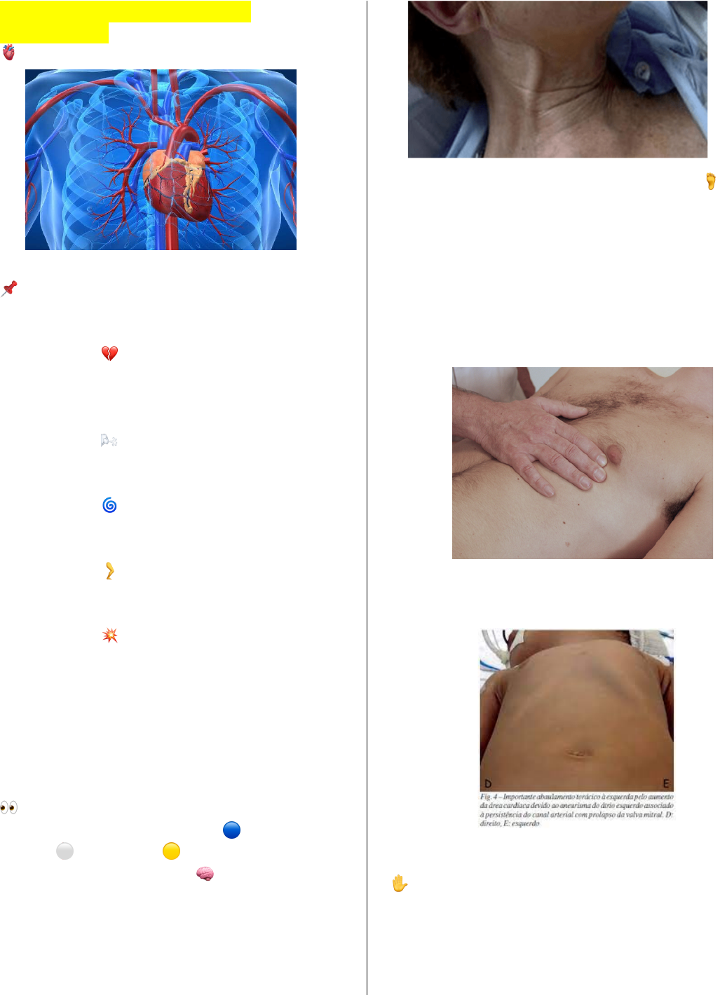 Dispneia, Dor Torácica e Edema Problema 3 1. Revisar semiologia do aparelho cardiovascular 🫀 Semiologia do Aparelho Cardiovascular 1. Anamnese 📌 O histórico clínico é essencial para direcionar o exame físico. • Sintomas principais: o 💔 Dor torácica → avaliar início, localização, irradiação, intensidade, fatores de ghmelhora/piora (ex.: angina). o 🌬 Dispneia → classificar (esforço, repouso, ortopneia, dispneia paroxística noturna). o 🌀 Síncope/tonteira → pode indicar arritmia, obstrução ou queda de débito cardíaco. o 🦵 Edema → geralmente vespertino, melhora ao repouso, sugere insuficiência cardíaca. o 💥 Palpitações → percepção anormal dos batimentos cardíacos. • Fatores de risco: HAS, DM, dislipidemia, tabagismo, etilismo, sedentarismo, história familiar. 2. Inspeção Geral 👀 Avaliar o paciente globalmente: • Estado geral: cianose (🔵), palidez (⚪), icterícia (🟡). • Turgência jugular (🧠) → indica congestão venosa sistêmica. • Edema periférico (pés, tornozelos 🦶). • Cianose de extremidades ou central. 3. Inspeção Pré-cordial • Ictus cordis (choque da ponta) → localizado no 5º espaço intercostal esquerdo, linha hemiclavicular. o Deslocado para baixo/esquerda → cardiomegalia. • Abaulamentos, retrações ou pulsações anormais no precórdio. 4. Palpação ✋ Importante para confirmar achados: • Ictus cordis: localização, extensão, intensidade. • Frêmito: vibração palpável associada a sopros (ex.: estenose aórtica). • Choques anormais: sistólicos ou diastólicos. 5. Percussão 🥁 Hoje pouco utilizada, mas pode ajudar a delimitar área cardíaca. • Som maciço define borda cardíaca. • Usada como complemento à radiografia/técnicas modernas. 6. Ausculta Cardíaca 🎧 Etapa central da semiologia! • Focos de ausculta principais: o 🔴 Aórtico → 2º EIC direito. o 🟢 Pulmonar → 2º EIC esquerdo. o 🔵 Tricúspide → 4º/5º EIC esquerdo, paraesternal. o 🟡 Mitral (apical) → 5º EIC esquerdo, linha hemiclavicular. • Sons cardíacos: o 1ª bulha (B1): fechamento das valvas AV (mitral + tricúspide). o 2ª bulha (B2): fechamento das valvas semilunares (aórtica + pulmonar). o 3ª bulha (B3): pode ser fisiológica em jovens; em adultos → IC. o 4ª bulha (B4): sempre patológica, indica dificuldade de enchimento (hipertrofia, rigidez ventricular). Alterações: • Sopros: sons turbulentos, avaliados por tempo (sistólico/diastólico), intensidade e localização. • Estalidos (ex.: abertura da mitral). • Atrito pericárdico (ex.: pericardite). 7. Exame Complementar do Aparelho Circulatório • Pulso arterial: frequência, ritmo, amplitude, simetria. • Pressão arterial: medir corretamente em ambos os braços. • Exame venoso: turgência jugular, refluxo hepatojugular. 8. Integração dos Achados 🧩 A semiologia cardiovascular permite levantar hipóteses diagnósticas: • Insuficiência cardíaca → dispneia, estertores, B3, edema. • Doença valvar → sopros típicos (estenose/insuficiência). • Síndromes coronarianas → dor torácica típica, alterações em B4. • Arritmias → palpitações, pulso irregular. 2) Conhecer as valvopatias mais frequentes na prática clínica 🫀 Valvopatias mais Frequentes 1. Estenose Aórtica (EA) 🔴 O que é? • Obstrução à saída de sangue do VE → sobrecarga pressórica. • Geralmente degenerativa (idosos) ou congênita (válvula bicúspide). 📌 Clínica clássica (tríade de sintomas): • 🌬 Dispneia (IC esquerda). • ⚡ Angina. • 🌀 Síncope de esforço. 👂 Ausculta: • Sopro sistólico ejetivo em foco aórtico (2º EIC direito), irradia para carótidas. • Bulha A2 reduzida ou ausente. • Frêmito sistólico palpável. 2. Insuficiência Aórtica (IA) 🔵 O que é? • Refluxo de sangue da aorta para VE na diástole. • Pode ser por febre reumática, endocardite ou degeneração. 📌 Clínica: • Palpitações, dispneia, fadiga. • Pode evoluir para IC esquerda. 👂 Ausculta: • Sopro diastólico aspirativo em foco aórtico e borda esternal esquerda. • Sopro de Austin-Flint (diastólico em foco mitral). 🧪 Achados adicionais: • Pulso em “martelo d’água” (Corrigan). • PA com aumento da pressão de pulso. 3. Estenose Mitral (EM) 🟢 O que é? • Obstrução do enchimento do VE devido a estreitamento da válvula mitral. • Principal causa: febre reumática. 📌 Clínica: • Dispneia progressiva, ortopneia, palpitações. • Hemoptise em casos graves (congestão pulmonar). • Pode levar a FA e risco de tromboembolismo. 👂 Ausculta: • Sopro diastólico em ruflar em foco mitral (ápex). • Estalido de abertura da mitral após B2. • Melhor auscultado com paciente em decúbito lateral esquerdo. 4. Insuficiência Mitral (IM) 🟡 O que é? • Refluxo de sangue do VE para o AE durante a sístole. • Pode ser por febre reumática, prolapso da mitral, endocardite ou degenerativa. 📌 Clínica: • Dispneia de esforço, fadiga, palpitações. • Em casos graves → sinais de IC esquerda e direita. 👂 Ausculta: • Sopro holossistólico em foco mitral (5º EIC linha hemiclavicular). • Irradia para axila esquerda. • B3 pode estar presente (aumento de enchimento). 5. Estenose Tricúspide (ET) (menos comum, mas importante) 🟠 O que é? • Obstrução do enchimento do VD. • Causa principal: febre reumática. 📌 Clínica: • Sinais de congestão venosa sistêmica: edema, ascite, hepatomegalia. 👂 Ausculta: • Sopro diastólico em ruflar em foco tricúspide (bordo esternal inferior direito/esquerdo). • Intensifica com inspiração (sinal de Rivero-Carvallo). 6. Insuficiência Tricúspide (IT) 🟤 O que é? • Refluxo de sangue do VD para o AE durante a sístole. • Pode ser funcional (dilatação do VD) ou orgânica (endocardite, reumática). 📌 Clínica: • Turgência jugular, hepatomegalia dolorosa, ascite, edema. 👂 Auscul
