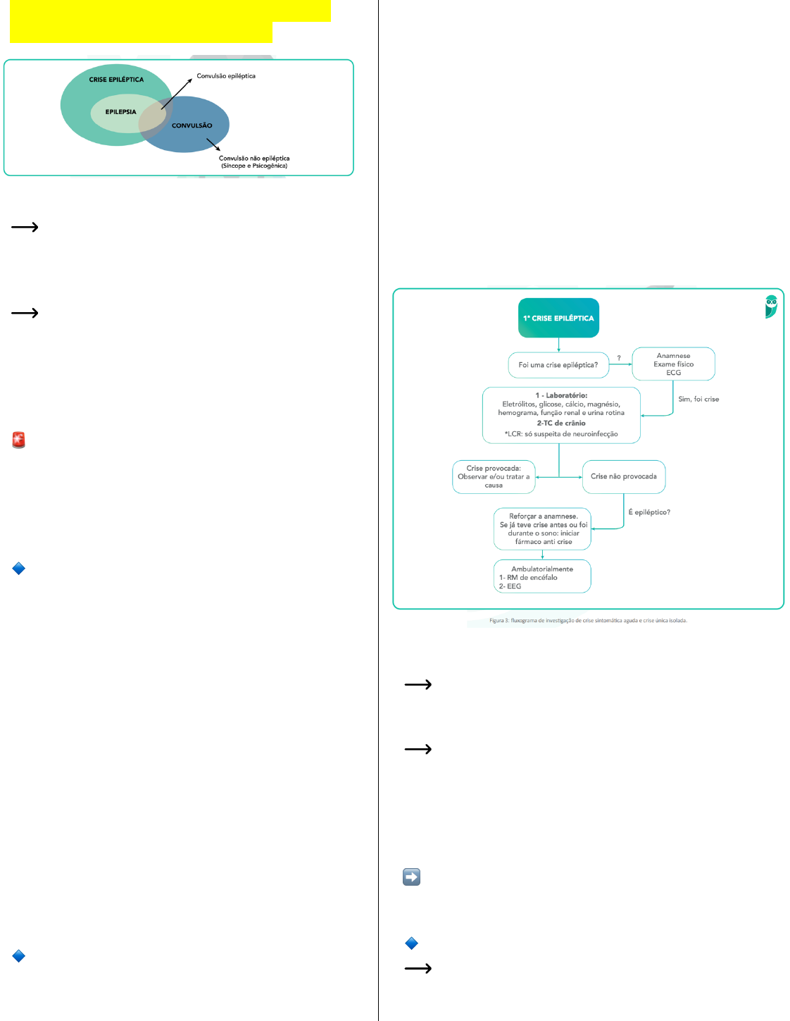 Distúrbios sensoriais, motores e da consciência P5 - “Coisas esquisitas” 1) Conceituar crise epiléptica, crise aguda sintomática, crise única, epilepsia; Crise Epiléptica Evento clínico súbito, transitório e autolimitado, causado por uma descarga elétrica anormal, excessiva e síncrona dos neurônios do córtex cerebral. Essa atividade elétrica desorganizada interfere nas funções normais do cérebro e se manifesta de formas variadas — motoras, sensitivas, autonômicas, cognitivas ou comportamentais. 🚨 Nem toda crise epiléptica está relacionada à epilepsia: pode ocorrer isoladamente, sem que o paciente seja epiléptico (ex: crises sintomáticas agudas ou únicas). 🔹 Fisiopatologia O cérebro mantém um equilíbrio entre: • Neurotransmissores excitatórios (principalmente o glutamato) e • Neurotransmissores inibitórios (principalmente o GABA). Na crise epiléptica, esse equilíbrio se rompe → ocorre hiperexcitabilidade neuronal e hiperssincronismo entre grupos de neurônios corticais. Essa descarga anormal pode: • Permanecer restrita a uma região (crise focal); ou • Propagar-se para ambos os hemisférios (crise generalizada). 🔹 Fases da Crise 1. Pródromo: alterações de humor, irritabilidade, ansiedade ou cefaleia horas antes da crise (nem sempre presente). 2. Aura: sintoma inicial breve, que indica o início da descarga elétrica e ajuda a localizar o foco (ex: sensação epigástrica, cheiro estranho, déjà vu, medo súbito). 3. Ictal: fase da crise em si — manifestações motoras, sensitivas, autonômicas ou cognitivas. 4. Pós-ictal: período de recuperação, com confusão, cefaleia, sonolência e amnésia parcial. Crise Aguda Sintomática (ou Crise Provocada) A crise aguda sintomática é uma crise epiléptica provocada por uma causa aguda, identificável e reversível. Ou seja, o cérebro sofre um insulto temporário, que aumenta a excitabilidade neuronal e causa a descarga elétrica anormal — mas, após o tratamento da causa, o risco de recorrência desaparece. ➡ É uma crise secundária, e não caracteriza epilepsia. 🔹 Mecanismo Fisiopatológico Durante uma condição aguda que afeta o sistema nervoso (como trauma, infecção ou distúrbio metabólico), há desequilíbrio entre os neurotransmissores excitatórios (glutamato) e inibitórios (GABA). Esse desequilíbrio gera hiperexcitabilidade neuronal, levando à descarga elétrica anormal e sincronizada, típica das crises epilépticas — mas de forma transitória. Assim que a causa é corrigida, a função cerebral volta ao normal, e as crises cessam. 🔹 Principais Causas 🧠 Causas estruturais agudas • AVC isquêmico ou hemorrágico (fase aguda) • Traumatismo cranioencefálico (TCE) • Tumores cerebrais em crescimento rápido • Hemorragia subaracnóidea 📌 As crises ocorrem nas primeiras horas ou dias do evento. 💉 Causas metabólicas e tóxicas • Hipoglicemia • Hiponatremia / hipernatremia • Uremia (insuficiência renal) • Hepatopatia (encefalopatia hepática) • Hipocalcemia / hipomagnesemia • Uso ou abstinência de álcool, benzodiazepínicos, cocaína ou outras drogas estimulantes 🦠 Causas infecciosas • Meningite bacteriana • Encefalite viral • Abscesso cerebral • Neurocisticercose ativa 🌡 Outras condições precipitantes • Febre alta em crianças (crise febril) • Pós-operatório de neurocirurgia • Hipóxia cerebral (parada cardiorrespiratória, anóxia neonatal) 🔹 Características Clínicas • Ocorrem durante ou logo após o evento causal (geralmente nas primeiras 24–48 horas). • A manifestação pode ser idêntica a uma crise epiléptica comum (motora, sensitiva ou generalizada). • Normalmente não há recorrência após o tratamento da causa. • Estado pós-ictal (confusão, sonolência) pode estar presente, como nas crises epilépticas. 📌 O ponto chave é o contexto clínico: o paciente está metabolicamente instável ou com lesão cerebral aguda. Crise única A crise única é uma crise epiléptica não provocada que ocorre apenas uma vez, sem repetição e sem causa desencadeante identificável (como distúrbios metabólicos, infecção ou trauma). ➡ Em outras palavras: o paciente tem uma descarga elétrica cerebral anormal, típica de uma crise epiléptica, mas o evento é isolado. Isso significa que ele não tem epilepsia, pois não há tendência à recorrência. 🔹 Fisiopatologia Durante a crise única, há um episódio transitório de hiperexcitabilidade e hiperssincronismo neuronal no córtex cerebral, igual ao que ocorre nas crises epilépticas típicas. A diferença é que essa disfunção não se repete, pois o cérebro volta ao equilíbrio normal entre os neurotransmissores: • Glutamato (excitatório) • GABA (inibitório) Essa alteração pode acontecer em situações ocasionais — como privação de sono, fadiga extrema ou estresse intenso — sem que haja uma lesão estrutural ou predisposição crônica. 🔹 Características Clínicas • Episódio súbito e autolimitado, geralmente com perda de consciência e movimentos tônico-clônicos (como nas crises generalizadas). • Pode haver aura antes do evento e período pós-ictal (confusão e sonolência). • O paciente se recupera completamente após o episódio. • Não há recorrência espontânea. 📌 Importante: a ausência de repetição é o que define o diagnóstico de crise única — se novas crises ocorrerem, o diagnóstico muda para epilepsia. 🔹 Causas e Fatores Associados Mesmo sem uma “causa aguda”, alguns fatores podem predispor à ocorrência de uma crise única: • Privação de sono • Estresse emocional intenso • Uso de álcool em excesso ou abstinência • Uso de estimulantes (cafeína, drogas recreativas) • Mudanças hormonais (menstruação, puberdade) • Exposição a luzes intermitentes (crises fotossensíveis) 🚨 Essas condições aumentam temporariamente a excitabilidade cortical, favorece