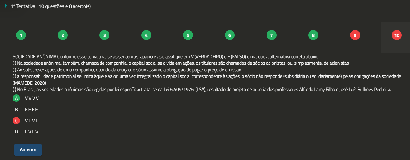 Tentativa 10 questões e 8 acerto(s) 1 2 3 4 5 6 7 8 9 10 SOCIEDADE ANÔNIMA Conforme esse tema analise as sentenças abaixo e as classifique em V (VERDADEIRO) e F (FALSO) e marque a alternativa correta abaixo. () Na sociedade anônima, também, chamada de companhia, 0 capital social se divide em ações; titulares são chamados de sócios acionistas, ou, simplesmente, de acionistas () Ao subscrever ações de uma companhia, quando da criação, 0 sócio assume a obrigação de pagar 0 preço de emissão () a responsabilidade patrimonial se limita àquele valor; uma vez integralizado 0 capital social correspondente às ações, 0 sócio não responde (subsidiária ou solidariamente) pelas obrigações da sociedade (MAMEDE, 2020) () No Brasil, as sociedades anônimas são regidas por lei específica: trata-se da Lei 6.404/1976, (LSA), resultado de projeto de autoria dos professores Alfredo Lamy Filho e José Luís Bulhões Pedreira. A VVVV B FFFF VFVF D FVFV Anterior