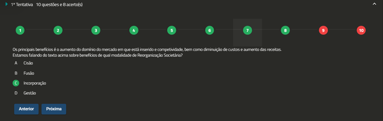 Tentativa 10 questões e 8 acerto(s) 1 2 3 4 5 6 7 8 9 10 Os principais benefícios é 0 aumento do domínio do mercado em que está inserido e competividade, bem como diminuição de custos e aumento das receitas. Estamos falando do texto acima sobre benefícios de qual modalidade de Reorganização Societária? A Cisão Fusão Incorporação D Gestão Anterior Próxima