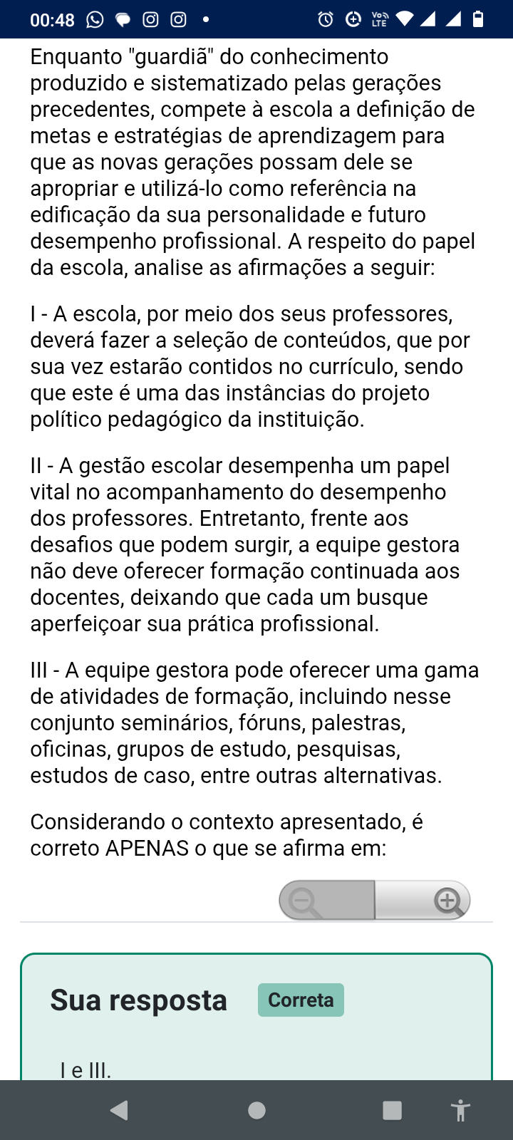 00:48 LTE Enquanto "guardiã" do conhecimento produzido e sistematizado pelas gerações precedentes, compete à escola a definição de metas e estratégias de aprendizagem para que as novas gerações possam dele se apropriar e utilizá-lo como referência na edificação da sua personalidade e futuro desempenho profissional. A respeito do papel da escola, analise as afirmações a seguir: A escola, por meio dos seus professores, deverá fazer a seleção de conteúdos, que por sua vez estarão contidos no currículo, sendo que este é uma das instâncias do projeto político pedagógico da instituição. A gestão escolar desempenha um papel vital no acompanhamento do desempenho dos professores. Entretanto, frente aos desafios que podem surgir, a equipe gestora não deve oferecer formação continuada aos docentes, deixando que cada um busque aperfeiçoar sua prática profissional. III A equipe gestora pode oferecer uma gama de atividades de formação, incluindo nesse conjunto seminários, fóruns, palestras, oficinas, grupos de estudo, pesquisas, estudos de caso, entre outras alternativas. Considerando o contexto apresentado, é correto APENAS o que se afirma em: Sua resposta Correta