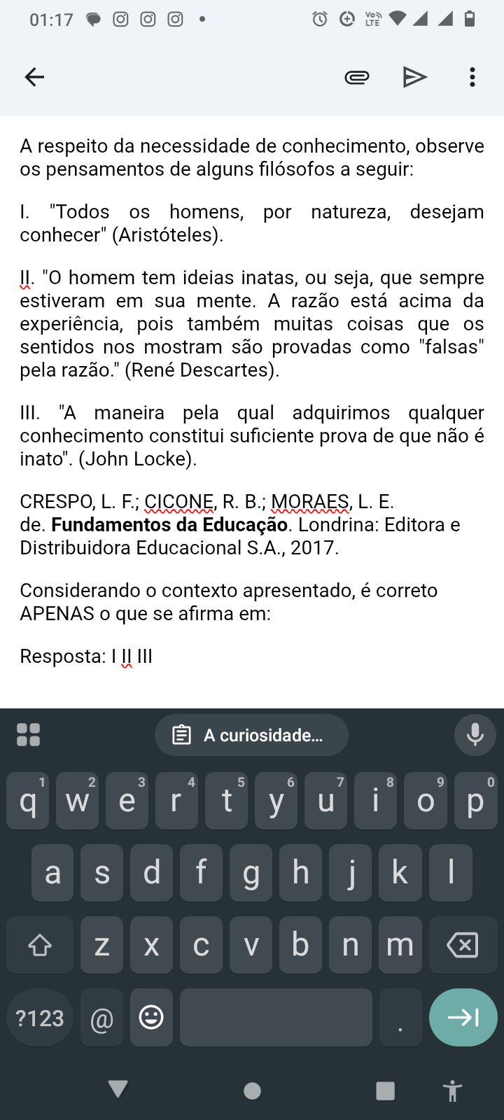 01:17 + LTE A respeito da necessidade de conhecimento, observe os pensamentos de alguns filósofos a seguir: I. "Todos os homens, por natureza, desejam conhecer" (Aristóteles). II. "O homem tem ideias inatas, ou seja, que sempre estiveram em sua mente. A razão está acima da experiência, pois também muitas coisas que os sentidos nos mostram são provadas como "falsas" pela razão." (René Descartes). III. "A maneira pela qual adquirimos qualquer conhecimento constitui suficiente prova de que não é inato". (John Locke). CRESPO, L. F.; CICONE, R. B.; MORAES, L.E. de. Fundamentos da Educação. Londrina: Editora e Distribuidora Educacional S.A., 2017. Considerando o contexto apresentado, é correto APENAS o que se afirma em: Resposta: III A curiosidade.. qwertyuiop asdfghjkl ?123 @
