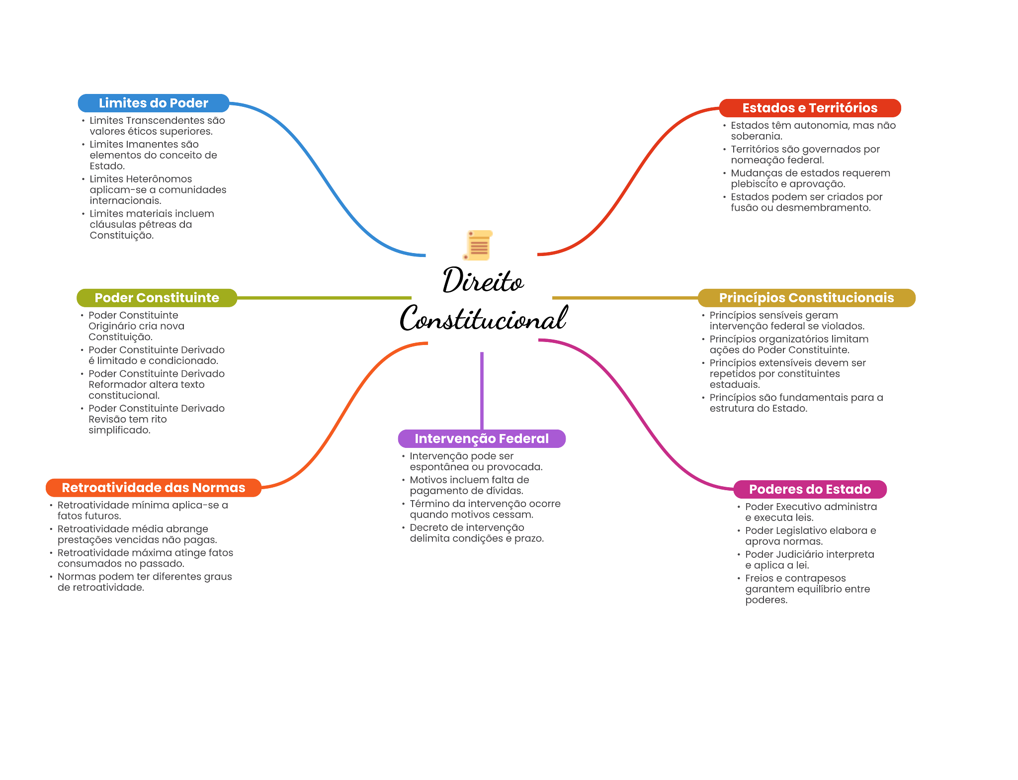 Limites do Poder Estados e Territórios Limites Transcendentes são valores éticos superiores. Estados autonomia, não soberania. Limites elementos do de Territórios são governados por Estado. nomeação federal. Limites Heterônomos Mudanças de estados requerem aplicam-se a comunidades aprovação. Estados podem ser criados por fusão ou desmembramento. Limites materials pétreas da Poder Constituinte Princípios Constitucionais Poder Constituinte geram Originário cria nova intervenção federal violados. Constituição. organizatórios limitam Poder Constituinte Derivado ações do Poder limitado @ condicionado. devem ser Poder Constituinte Derivado repetidos por constituintes Reformador altera texto constitucional. Principios são para a Poder Constituinte Derivado estrutura do Estado. Revisão tem rito Intervenção Federal pode ser ou provocada. Motivos incluem falta de Retroatividade das Normas pagamento de dividas. Poderes do Estado Retroatividade mínima aplica-se a Término da ocorre Poder Executivo administra fatos futuros. quando motivos executa leis. Retroatividade média abrange Decreto de Intervenção Poder Legislativo e prestações não pagas. delimita condições prazo. aprova normas. Retroatividade fatos Poder Judiciário Interpreta consumados no passado. aplica a Normas podem ter diferentes Freice contrapesos de retroatividade. garantem entre poderes.