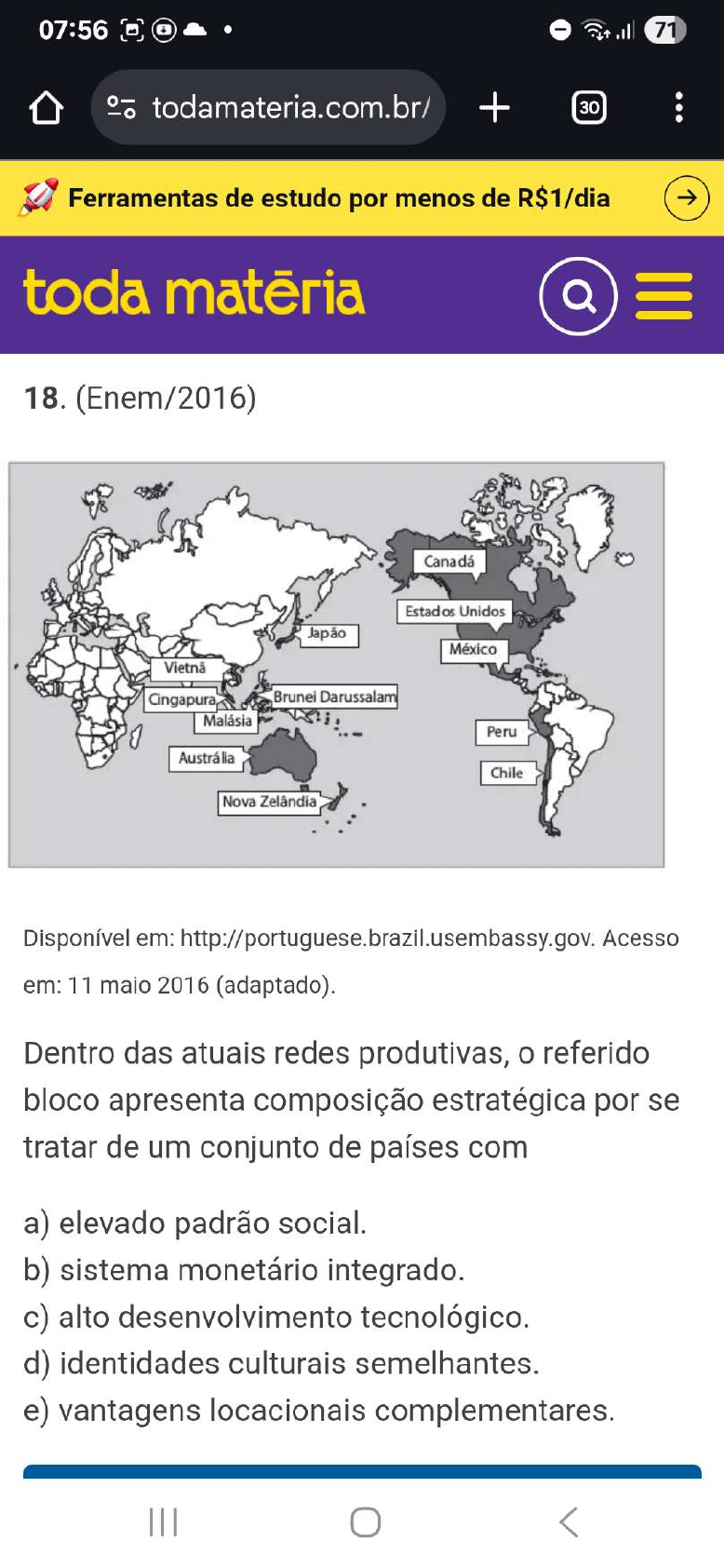 07:56 71 todamateria.com.br/ + 30 ... Ferramentas de estudo por menos de R$1/dia toda matēria 18. (Enem/2016) Canadá Estados Unidos Japão México Vietnã Cingapura Brunei Darussalam Malásia Peru Austrália Chile Nova Zelândia Disponível em: em: 11 maio 2016 (adaptado). Dentro das atuais redes produtivas, o referido bloco apresenta composição estratégica por se tratar de um conjunto de países com a) elevado padrão social. b) sistema monetário integrado. c) alto desenvolvimento tecnológico. d) identidades culturais semelhantes. e) vantagens locacionais complementares.07:56 72 Ferramentas de estudo por menos de R$1/dia toda matēria Veja também: Questões do Enem comentadas por especialistas 14. (Enem/2017) Em um teleférico turístico, bondinhos saem de estações ao nível do mar e do topo de uma montanha. A travessia dura 1,5 minuto e ambos os bondinhos se deslocam à mesma velocidade, Quarenta segundos após o bondinho A partir da estação ao nível do mar, ele cruza com o bondinho B, que havia saído do topo da montanha. Quantos segundos após a partida do bondinho partiu bondinho A? a) 5 b) 10 c) 15 d) 20 e) 25 Ver Resposta Veja também: Matemática no Enem 2025: os conteúdos que mais caem Se você sente que Matemática é seu maior07:55 72 Ferramentas de estudo por menos de R$1/dia toda matēria veja 12. (Enem/2015) Um arquiteto está reformando uma casa. De modo a contribuir com o meio ambiente, decide reaproveitar tábuas de madeira retiradas da casa. Ele dispõe de 40 tábuas de 540 cm, 30 de 810 cm e 10 de cm, todas de mesma largura e espessura. Ele pediu a um carpinteiro que cortasse as tábuas em pedaços de mesmo comprimento, sem deixar sobras, e de modo que as novas peças ficassem com o maior tamanho possível, mas de comprimento menor que 2 m. Atendendo o pedido do arquiteto, o carpinteiro deverá produzir a) 105 peças. b) 120 peças. c) 210 peças. d) 243 peças. e) 420 peças. Ver Resposta Learn Moxe Veja tambér omum 13. Ad : (0:08) neus07:55 72 Ferramentas de estudo por menos de R$1/dia toda matēria 11. (Enem/2014) Uma criança deseja criar triângulos utilizando palitos de fósforo de mesmo comprimento. Cada triângulo será construído com exatamente 17 palitos e pelo menos um dos lados do triângulo deve ter comprimento de exatamente 6 palitos. A figura ilustra um triângulo construído com essas características. A quantidade máxima de triângulos não congruentes dois a dois que podem ser construídos é a) 3. b) 5. c) 6. d) 8. e) 10.72 + 30 ... Ferramentas de estudo por menos de R$1/dia toda matēria Matemática e suas Tecnologias 10. (Enem/2013) contribuinte que vende mais de R$ 20 mil de ações em Bolsa de Valores em um mês deverá pagar Imposto de Renda. pagamento para a Receita Federal consistirá em 15% do lucro obtido com a venda das ações. Disponível em: www1.folha.uol.com.br. Acesso em: 26 abr. 2010 (adaptado). Um contribuinte que vende por R$ 34 mil um lote de ações que custou R$ 26 mil terá de pagar de Imposto de Renda à Receita Federal o valor de a) R$ 900,00. b) c) d) e) Ver Resposta Veia Questões de Matemática no