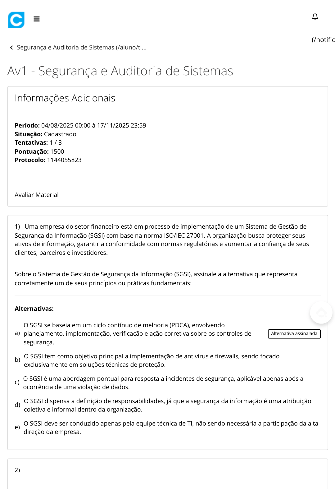 Segurança e Auditoria de Sistemas (/aluno/ti… Av1 - Segurança e Auditoria de Sistemas (/notific Informações Adicionais Período: 04/08/2025 00:00 à 17/11/2025 23:59 Situação: Cadastrado Tentativas: 1 / 3 Pontuação: 1500 Protocolo: 1144055823 Avaliar Material 1) a) b) c) d) e) 2) Uma empresa do setor financeiro está em processo de implementação de um Sistema de Gestão de Segurança da Informação (SGSI) com base na norma ISO/IEC 27001. A organização busca proteger seus ativos de informação, garantir a conformidade com normas regulatórias e aumentar a confiança de seus clientes, parceiros e investidores. Sobre o Sistema de Gestão de Segurança da Informação (SGSI), assinale a alternativa que representa corretamente um de seus princípios ou práticas fundamentais: Alternativas: O SGSI se baseia em um ciclo contínuo de melhoria (PDCA), envolvendo planejamento, implementação, verificação e ação corretiva sobre os controles de segurança. Alternativa assinalada O SGSI tem como objetivo principal a implementação de antivírus e firewalls, sendo focado exclusivamente em soluções técnicas de proteção. O SGSI é uma abordagem pontual para resposta a incidentes de segurança, aplicável apenas após a ocorrência de uma violação de dados. O SGSI dispensa a definição de responsabilidades, já que a segurança da informação é uma atribuição coletiva e informal dentro da organização. O SGSI deve ser conduzido apenas pela equipe técnica de TI, não sendo necessária a participação da alta direção da empresa. https://www.colaboraread.com.br/aluno/timeline/index/3487065106?ofertaDisciplinaId=2462716 https://www.colaboraread.com.br/aluno/timeline/index/3487065106?ofertaDisciplinaId=2462716 https://www.colaboraread.com.br/notificacao/index https://www.colaboraread.com.br/notificacao/index https://www.colaboraread.com.br/notificacao/index javascript:void(0); a) b) c) d) e) 3) Uma empresa de comércio eletrônico percebeu que seu site ficou indisponível por cerca de 40 minutos em um sábado à tarde, horário de pico de acessos. Após uma investigação, constatou-se que o servidor web recebeu um volume anormalmente alto de requisições simultâneas, todas vindas de diferentes localidades ao redor do mundo. A equipe de segurança suspeita que o incidente foi resultado de um ataque malicioso planejado para sobrecarregar os recursos do sistema. Com base na situação descrita, qual tipo de ataque ocorreu, e qual é uma característica que o distingue de outros ataques similares? Alternativas: Trata-se de um ataque de negação de serviço (DoS), que explora vulnerabilidades em um único ponto da aplicação para interromper o serviço. Trata-se de um ataque de injeção de código, caracterizado pelo envio de comandos maliciosos a partir de formulários da aplicação. Trata-se de um ataque de negação de serviço distribuído (DDoS), em que múltiplos sistemas comprometidos são usados para gerar tráfego excessivo ao servidor. Alternativa assinalada Trata-se de um ataque de phishing, pois envolve o redirecionamento de usuários para páginas falsas durante o horário de pico. Trata-se de um ataque man-in-the-middle, em que o invasor intercepta as requisições entre o cliente e o servidor para modificar os dados transmitidos. Uma organização está reformulando sua política de segurança cibernética após sofrer incidentes relacionados a acesso não autorizado à rede, tentativas de exploração de vulnerabilidades e detecção de malwares em estações de trabalho. Para isso, pretende revisar o papel de dispositivos como firewalls, sistemas de prevenção de intrusão (IPS) e soluções antimalware no ambiente corporativo. Considerando os mecanismos de defesa mencionados no texto, analise as assertivas abaixo: I. Firewalls atuam como barreiras de controle de tráfego, permitindo ou bloqueando pacotes com base em regras predefinidas, sendo eficazes na prevenção de intrusões internas originadas de dispositivos comprometidos. II. Um sistema de prevenção de intrusão (IPS) é capaz de identificar e bloquear em tempo real atividades maliciosas, como varreduras de porta ou tentativas de exploração de vulnerabilidades. III. Soluções antimalware são eficazes apenas contra vírus conhecidos e não possuem mecanismos para detectar comportamentos suspeitos ou variantes desconhecidas. IV. Firewalls de próxima geração (NGFW) podem integrar funcionalidades de inspeção profunda de pacotes, detecção de intrusões e filtragem baseada em aplicações. V. Enquanto o IPS analisa o tráfego em tempo real para bloquear ataques, o IDS apenas monitora e emite alertas, sem impedir a ação maliciosa. Assinale a alternativa correta: a) b) c) d) e) 4) a) b) c) d) e) 5) Alternativas: Apenas as assertivas I, II e III estão corretas. Apenas as assertivas II, IV e V estão corretas. Alternativa assinalada Apenas as assertivas I, IV e V estão corretas. Apenas as assertivas II, III, IV e V estão corretas. Apenas as assertivas III, IV e V estão corretas. Em uma organização de médio porte, a equipe de segurança da informação identificou que, apesar da existência de políticas formais sobre privacidade de dados e segurança digital, muitos colaboradores ainda compartilham senhas por e-mail, utilizam dispositivos pessoais sem controle ou enviam informações sensíveis por aplicativos de mensagens não corporativos. A direção da empresa reconhece que, além de controles técnicos, é necessário promover uma mudança de comportamento e conscientização entre os funcionários. Com base na situação apresentada, assinale a alternativa que melhor representa uma prática eficaz para o fortalecimento da cultura de segurança e privacidade em ambientes organizacionais: Alternativas: Reforçar o monitoramento técnico dos dispositivos da empresa, substituindo campanhas de conscientização, que são pouco efetivas. Aplicar sanções disciplinares imediatas a