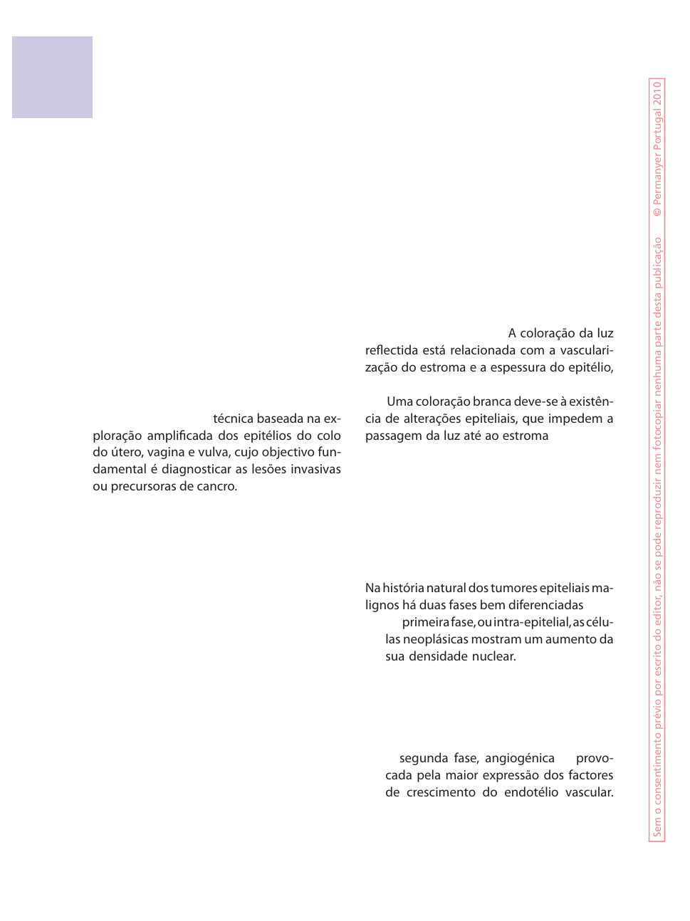 1. INTRODUÇÃO Hinselmann, pioneiro da colposcopia na Alemanha, publicou o primeiro artigo sobre esta técnica em 1925, tendo descrito as prin- cipais lesões benignas e malignas do colo do útero1. Durante a vida o seu trabalho foi pouco valorizado, e pode dizer-se que a im- portância da colposcopia só se generalizou na década de 1970. A colposcopia é uma técnica baseada na ex- ploração amplificada dos epitélios do colo do útero, vagina e vulva, cujo objectivo fun- damental é diagnosticar as lesões invasivas ou precursoras de cancro. Como ocorre com a maioria das técnicas de imagem, o seu ren- dimento varia em função do grau de experi- ência e treino do observador. A identificação de características subtis não observáveis à vista desarmada, que são expressão de alte- rações patológicas, permite valorizar o grau de anormalidade dos tecidos, bem como a morfologia e topografia das lesões, e realizar biopsias nas áreas suspeitas. A biopsia dirigida colposcopicamente per- mite confirmar o diagnóstico antes de efec- tuar o tratamento definitivo, e é considerada o gold standard nesta patologia. 2. BASES HISTOLÓGICAS E FUNDAMENTOS DA COLPOSCOPIA A histologia é o substrato das imagens col- poscópicas. Para entender o significado das imagens e valorizar as possíveis limitações da técnica, é imprescindível conhecer os diferentes quadros histológicos do colo do útero, normais e patológicos, e os seus me- canismos etiopatogénicos. A luz que incide sobre o epitélio penetra atra- vés dele até ao estroma. A coloração da luz reflectida está relacionada com a vasculari- zação do estroma e a espessura do epitélio, que actuam como um filtro à passagem da luz. Uma coloração branca deve-se à existên- cia de alterações epiteliais, que impedem a passagem da luz até ao estroma. É um sinal pouco específico, que pode ser provocado por diversas situações clínicas: — Paraqueratose ou hiperqueratose. — Acantose. — Aumento da densidade nuclear. — Infiltração inflamatória do estroma. É, no entanto, muito útil pois permite delimi- tar com toda a precisão a área anormal. Na história natural dos tumores epiteliais ma- lignos há duas fases bem diferenciadas: — Na primeira fase, ou intra-epitelial, as célu- las neoplásicas mostram um aumento da sua densidade nuclear. O crescimento é lento, linear, já que a taxa de proliferação se equilibra com a taxa de morte celular ou apoptose, podendo persistir assim durante meses ou anos, e carecem de potencial metastático. — A segunda fase, angiogénica, é provo- cada pela maior expressão dos factores de crescimento do endotélio vascular. Caracteriza-se pelo crescimento celular rápido, exponencial, pela capacidade de invasão e produção de metástases. 341 Colposcopia José Maria Moutinho 41 Se m o c o n se n ti m en to p ré vi o p o r es cr it o d o e d it o r, n ão s e p o d e re p ro d u zi r n em f o to co p ia r n en h u m a p ar te d es ta p u b lic aç ão © P er m an ye r Po rt u g al 2 01 0 342 Capítulo 41 A colposcopia permite diferenciar estas duas fases: — A intra-epitelial traduz-se pela observa- ção de lesões de cor branca, com ima- gens de mosaico e/ou ponteado, caso as alterações epiteliais se acompanhem de papilas vascularizadas do estroma. Caso haja envolvimento das criptas glandu- lares, observam-se orifícios glandulares com anéis brancos ou gotas brancas. — A segunda fase, angiogénica, traduz-se pela observação de uma vascularização irregular ou atípica, que constitui um si- nal colposcópico bem conhecido, carac- terístico do aparecimento de uma lesão mais grave. A colposcopia é muito sensível na detecção das lesões precursoras do cancro do colo. No entanto, é pouco específica, dado que as imagens colposcópicas anormais nem sem- pre correspondem a lesões intra-epiteliais. Este facto é muito importante na decisão terapêutica, pois a sua ignorância conduz frequentemente a overtreatment. O exame colposcópico fornece informação arquitectu- ral do epitélio, e para cada imagem anormal existem graus que vão desde alterações míni- mas até alterações fortemente significativas. A colposcopia constitui hoje uma técnica de eleição para a confirmação diagnóstica de uma suspeita de lesão do colo do útero (p. ex. citologia anormal), sendo insubstituível no protocolo de diagnóstico e tratamento das le- sões intra-epiteliais e precocemente invasivas do tracto genital inferior. O diagnóstico final deve sempre integrar a informação clínica e colposcópica, juntamente com os resultados laboratoriais (citologia, histologia, detecção de vírus do papiloma humano [HPV], etc.). 3. INDICAÇÕES DA COLPOSCOPIA A disponibilidade da colposcopia e o grau de formação, variáveis segundo as circunstâncias locais, têm condicionado distintas indicações da técnica em diferentes regiões. Em alguns países europeus e latino-americanos, a col- poscopia faz parte do exame ginecológico habitual, enquanto na maioria dos países an- glo-saxónicos está reservada exclusivamente para mulheres com citologia anormal2. As indicações para realizar uma colposcopia são de natureza citológica ou clínica. Está bem es- tabelecido que não tem nenhuma indicação como método de rastreio populacional. 3.1. INDICAÇÕES CITOLÓGICAS — Células escamosas atípicas de significa- do indeterminado (ASC-US) com teste HPV positivo. — Lesões escamosas intra-epiteliais de bai- xo grau (LSIL), células escamosas atípicas não se podendo excluir a presença de al- terações citológicas de alto grau (ASC-H), alterações citológicas de alto grau (HSIL) ou cancro. — Células glandulares atípicas (AGC), AGC, adenocarcinoma in situ (AIS) ou adeno- carcinoma (ADC). — Citologias repetidamente inflamatórias (≥ 3). 3.2. INDICAÇÕES CLÍNICAS — Mulheres > 35 anos e ADN para o papilo- ma vírus de alto risco (HPV-AR) persisten- temente posi