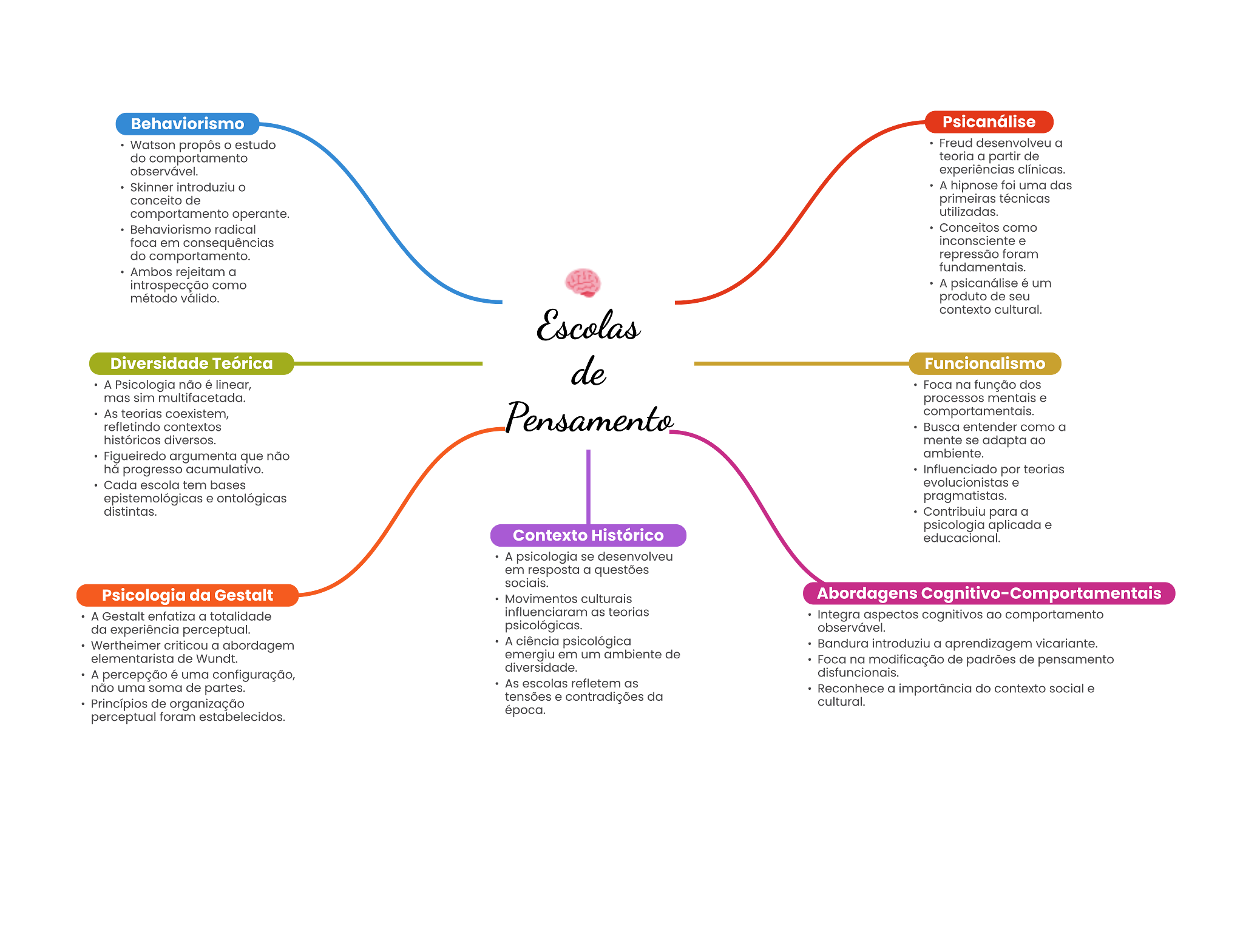Behaviorismo Psicanálise estudo Freud desenvolveu a do comportamento a partir de observável. Skinner A hipnose foi uma das conceito de comportamento operante. radical como foca em consequências do comportamento. foram Ambos a como A um método produto de seu cultural. Diversidade Teórica Funcionalismo A Psicologia não linear, Foca na função dos mas processos As teorias comportamentals. refletindo contextos entender a históricos diversos. mente se adapta ao Figueiredo argumenta que não acumulativo. influenciado por teorias Cada secola bases evolucionistas . ontológicas distintos. Contribulu para a aplicada Contexto Histórico A em resposta a questões socials. Psicologia da Gestalt Movimentos Abordagens Cognitivo-Comportamentais A Gestalt a totalidade as aspectos cognitivos ao comportamento da experiência perceptual. observável. criticou a abordagem A Bandura a aprendizagem elementarista de Wundt. em um de diversidade. Foca na modificação de padrões de pensamento A percepção é uma configuração, disfuncionals. não uma soma de As escolas reflatern as Reconhece do social Princípios de tenaões . contradições da cultural. perceptual foram época.