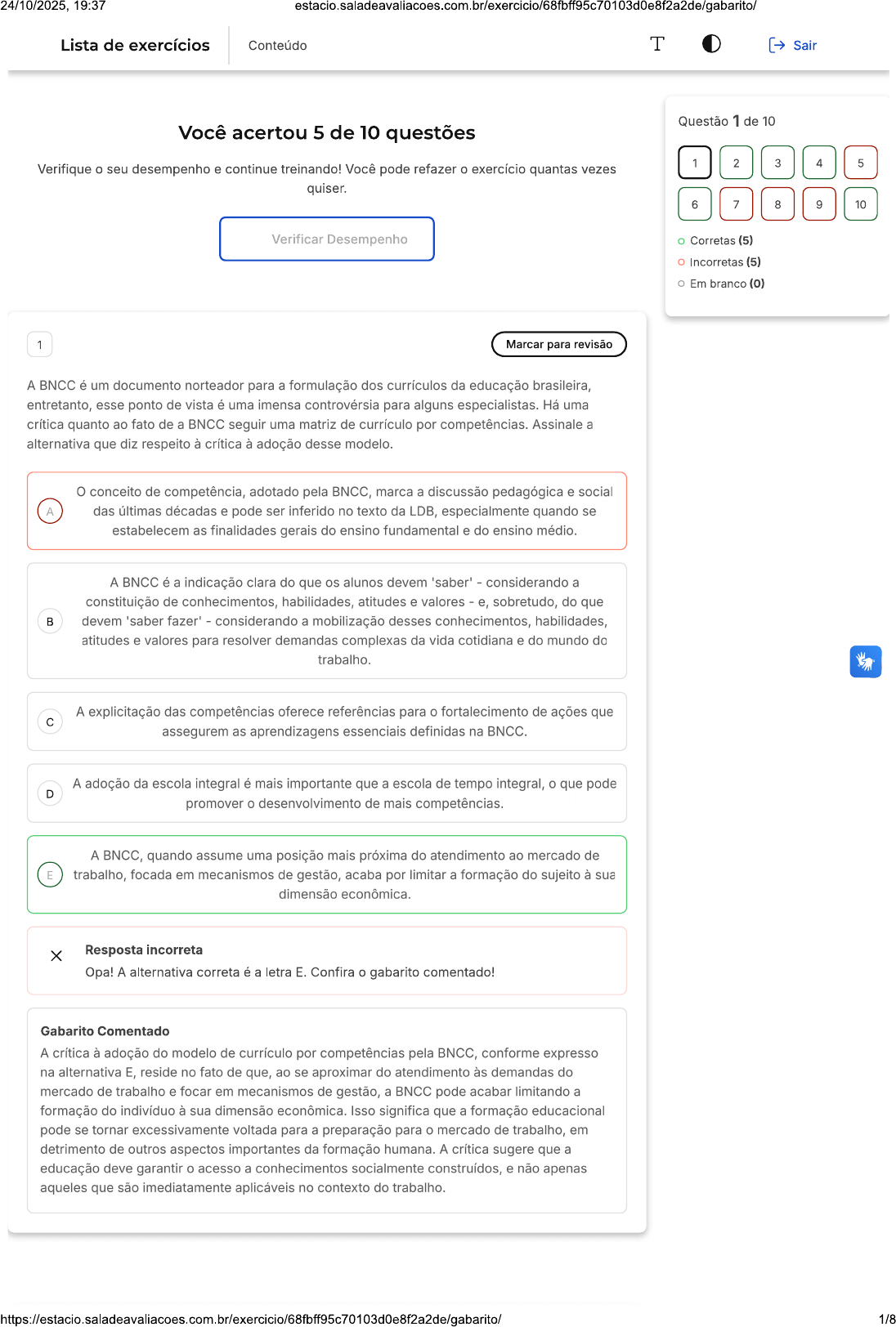 24/10/2025, 19:37 Lista de exercícios Conteúdo T Sair Questão 1 de 10 Você acertou 5 de 10 questões 1 2 3 4 5 Verifique o seu desempenho e continue treinando! Você pode refazer o exercício quantas vezes quiser. 6 7 8 9 10 Verificar Desempenho Corretas (5) Incorretas (5) Em branco (0) 1 Marcar para revisão A BNCC é um documento norteador para a formulação dos currículos da educação brasileira, entretanto, esse ponto de vista é uma imensa controvérsia para alguns especialistas. Há uma crítica quanto ao fato de a BNCC seguir uma matriz de currículo por competências. Assinale a alternativa que diz respeito à crítica à adoção desse modelo. conceito de competência, adotado pela BNCC, marca a discussão pedagógica e social A das últimas décadas e pode ser inferido no texto da LDB, especialmente quando se estabelecem as finalidades gerais do ensino fundamental e do ensino médio. A BNCC é a indicação clara do que os alunos devem 'saber' considerando a constituição de conhecimentos, habilidades, atitudes e valores e, sobretudo, do que devem 'saber fazer' considerando a mobilização desses conhecimentos, habilidades, atitudes e valores para resolver demandas complexas da vida cotidiana e do mundo do trabalho. A explicitação das competências oferece referências para o fortalecimento de ações que c assegurem as aprendizagens essenciais definidas na BNCC. A adoção da escola integral é mais importante que a escola de tempo integral, o que pode D promover o desenvolvimento de mais competências. A BNCC, quando assume uma posição mais próxima do atendimento ao mercado de E trabalho, focada em mecanismos de gestão, acaba por limitar a formação do sujeito à sua dimensão econômica. X Resposta incorreta Opa! A alternativa correta é a letra E. Confira o gabarito comentado! Gabarito Comentado A crítica à adoção do modelo de currículo por competências pela BNCC, conforme expresso na alternativa reside no fato de que, ao se aproximar do atendimento às demandas do mercado de trabalho e focar em mecanismos de gestão, a BNCC pode acabar limitando a formação do indivíduo à sua dimensão econômica. Isso significa que a formação educacional pode se tornar excessivamente voltada para a preparação para mercado de trabalho, em detrimento de outros aspectos importantes da formação humana. A crítica sugere que a educação deve garantir o acesso a conhecimentos socialmente construídos, e não apenas aqueles que são imediatamente aplicáveis no contexto do trabalho. 1/824/10/2025, 19:37 2 Marcar para revisão (IDHTEC 2019 Professor) currículo escolar se apresenta como elemento central do projeto pedagógico, por isso, é preciso considerar em sua construção a complexidade dos saberes e das diferentes áreas presentes no contexto atual. Nesse sentido, pensar a organização do currículo escolar implica: Construir um currículo que prevaleça a hierarquia das disciplinas, uma vez que facilitará o A processo de ensino. Dar ênfase aos conceitos em detrimento das habilidades e competências. Desenvolver práticas que priorizem as disciplinas de primeira grandeza, como linguagens c e matemática. D Refletir sobre a neutralidade inerente ao processo de construção da proposta da escola. Construir uma proposta fundamentada na interdisciplinaridade e na contextualização de E modo a assegurar um maior diálogo entre as áreas do saber. Resposta correta Parabéns, você selecionou a alternativa correta. Confira gabarito comentado! Gabarito Comentado A alternativa correta é a A organização do currículo escolar deve ser pensada de maneira a promover a interdisciplinaridade e a contextualização, garantindo assim um maior diálogo entre as diferentes áreas do saber. Isso significa que o currículo deve ser construído de forma a integrar os diferentes campos de conhecimento, permitindo que os alunos compreendam a complexidade e a inter-relação dos saberes. Além disso, a contextualização permite que os conteúdos sejam ensinados de maneira relevante e significativa para os alunos, relacionando- os com o seu contexto social, cultural e pessoal. Portanto, a organização do currículo escolar é um processo dinâmico e complexo, que deve ser constantemente avaliado e aprimorado para garantir a qualidade da educação. 3 Marcar para revisão Leia as duas afirmativas a seguir: I. Em termos formais, a política curricular diz respeito ao conjunto de leis e regulamentações que versam sobre o que deve ser ensinado nas escolas. II. A política curricular precisa ser entendida como sendo toda decisão ou todo condicionamento dos conteúdos e do desenvolvimento do currículo a partir das instâncias em que essas políticas acontecerão. Sobre as afirmativas acima é correto afirmar que: A As duas são verdadeiras, e a segunda é uma justificativa correta da primeira. As duas são verdadeiras, mas não estão relacionadas. c A primeira é uma afirmativa falsa e a segunda, verdadeira. 2/824/10/2025, 19:37 estacio.saladeavaliacoes.com.br/exercicio/68fbff95c70103d0e8f2a2de/gabarito/ D A primeira é uma afirmativa verdadeira e a segunda, falsa. E As duas são falsas e não estão relacionadas. Resposta correta Parabéns, você selecionou a alternativa correta. Confira o gabarito comentado! Gabarito Comentado A política curricular deve ser fruto de uma prática social, objetivada por leis e regulamentações, representando o agir e o pensar daqueles que estão envolvidos na sua formulação e na sua execução. 4 Marcar para revisão Analise as afirmações a seguir: I. Em relação ao ensino ministrado em todas as escolas do país, pluralismo de ideias, gestão democrática, valorização da experiência extraescolar, consideração da diversidade étnico-racial, vinculação educação-trabalho-práticas sociais são princípios previstos da LDB 9394/1996. II. Segundo a Constituição Federal de 1988, o Plano Nacional de Educação tem o objetivo de arti