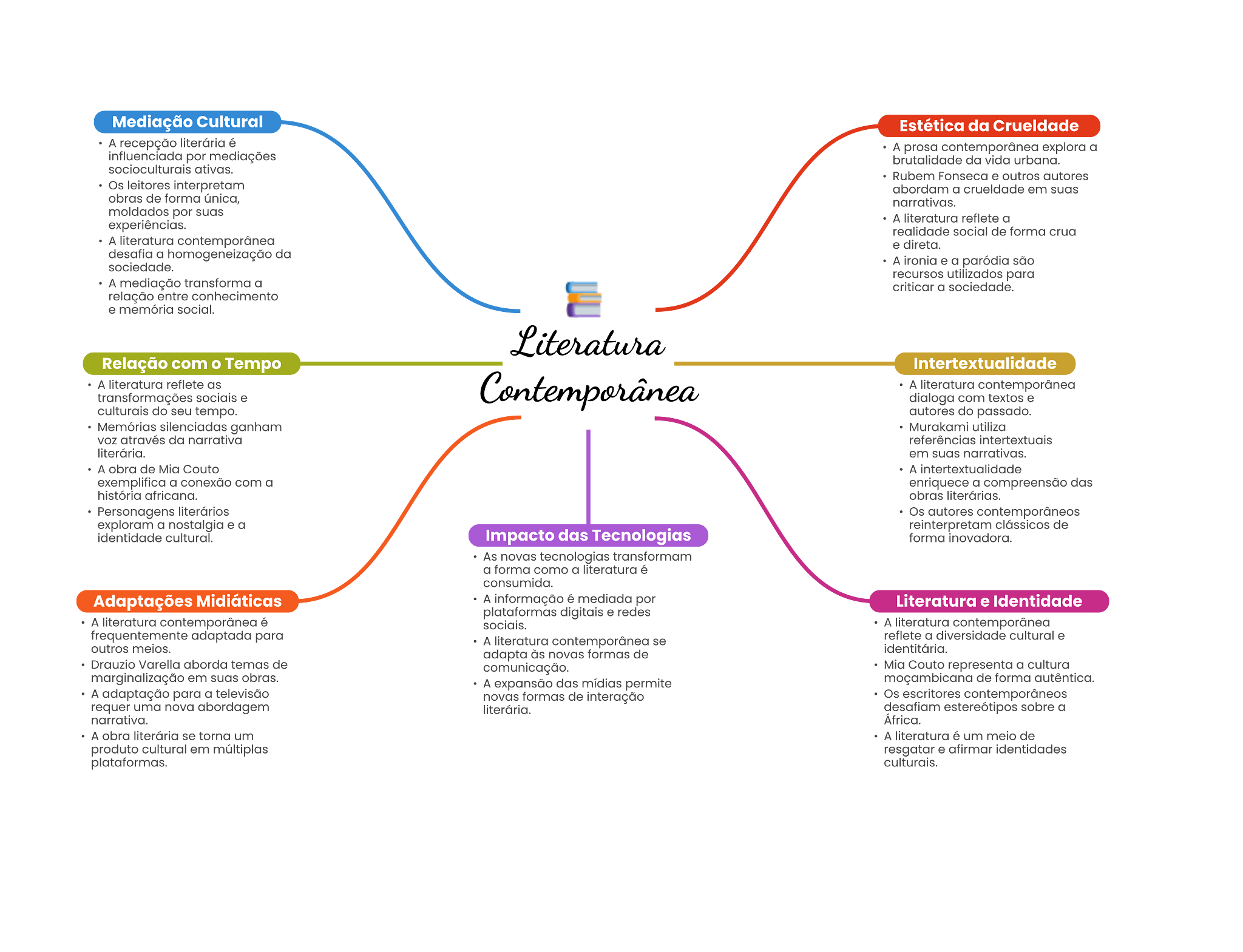 Mediação Cultural Estética da Crueldade A recepção . A prosa explora a por mediações da vida urbana. ativas. Rubern Fonesca . outros autores Os leitores abordam a em obras de forma narrativas. moldados por A literatura reflete a experiências. realidade social de forma crua A literatura direta. a da sociedade. A Ironia a paródia são recursos utilizados para A mediação transforma a criticar a sociedade. relação entre conhecimento . social. Relação com Tempo Intertextualidade A literatura as A literatura transformações socials dialoga com textos culturais do seu tempo. autores do passado. ganham Murakami utiliza voz da narrativa referências em A obra de Mia Couto A exemplifica a com a enriquece a dos história africana. obras literários autores exploram a nostalgia a reinterpretam de identidade cultural. Impacto das Tecnologias forma novas tecnologias transformam a forma como a é consumida. Adaptações Midiáticas A é mediada por Literatura e Identidade plataformas . redes A literatura socials. A literatura adaptada para A literatura reflete a diversidade cultural outros melos. adapta novas formas de Drauzio Varella aborda de comunicação. Mia Couto representa a cultura em obras. A das midias de forma A adaptação para a televisão formas de Os requer uma nova abordagem sobre a narrativa. Africa. A obra se toma um A literatura é um de produto cultural em afirmar